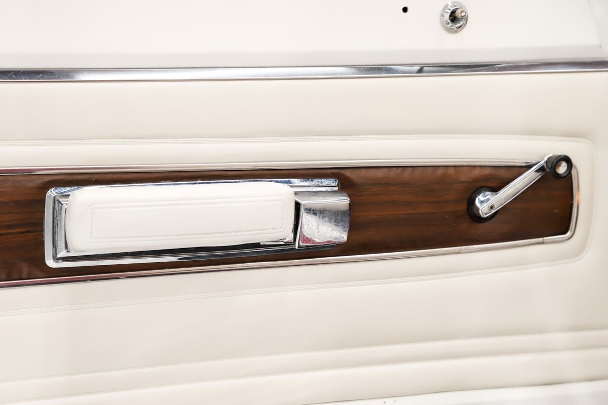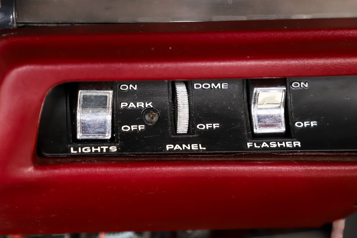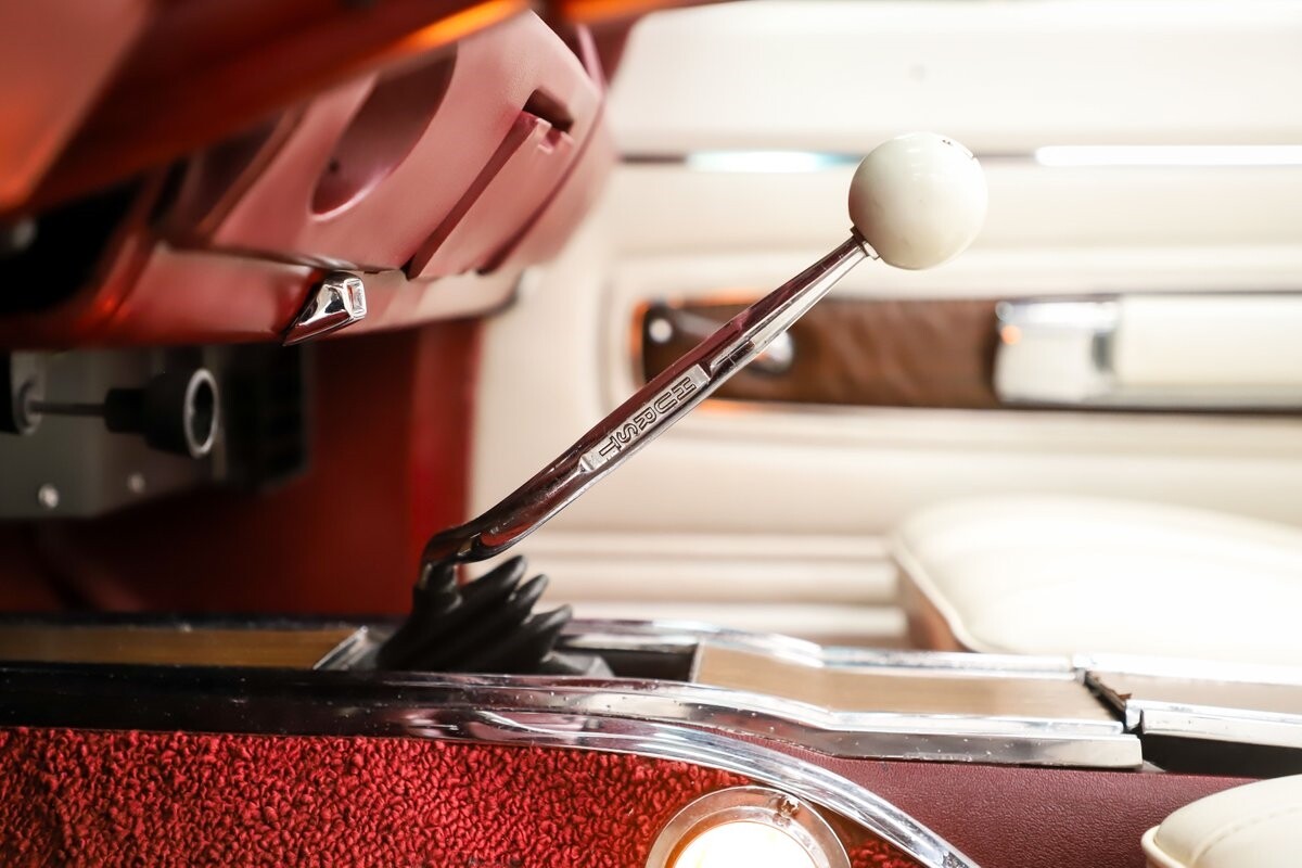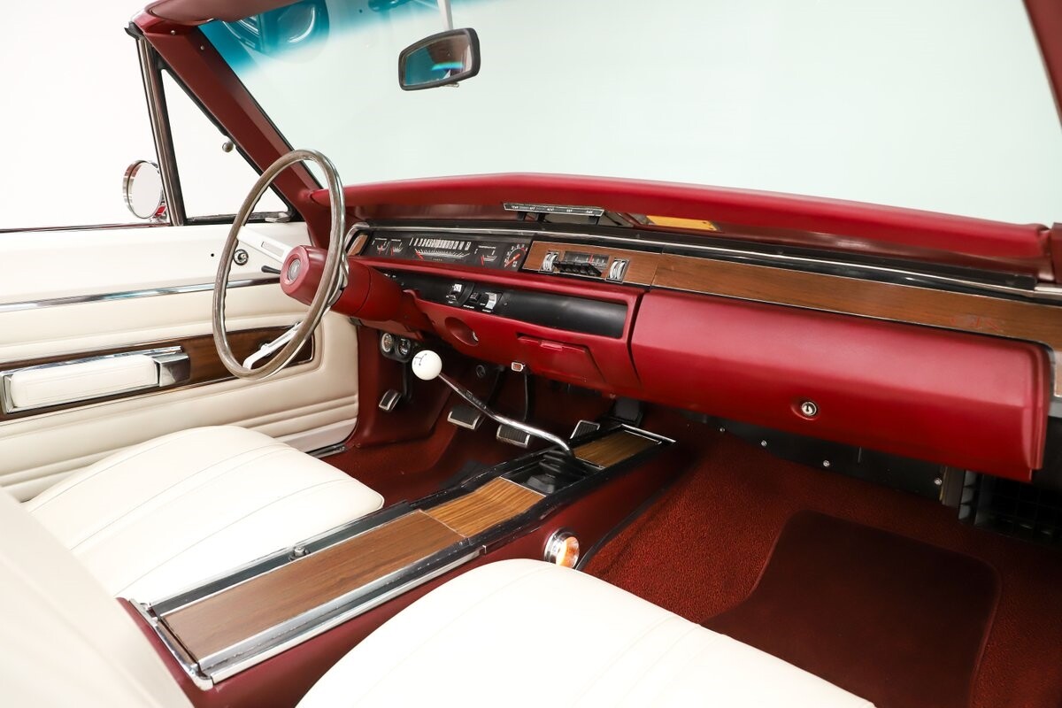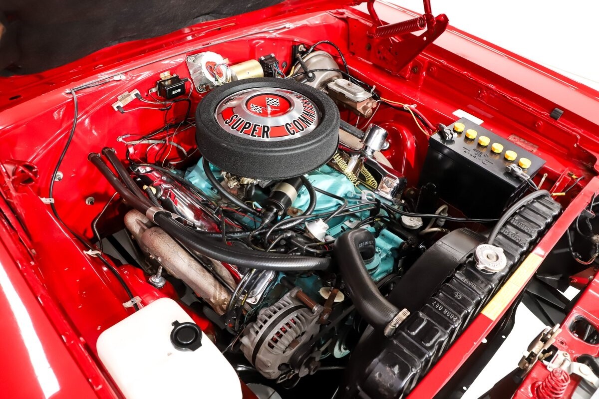 INTERIOR: Factory born with a white interior. The door panels and armrests were replaced. The dash area is very nice, not abused or altered. It has a factory tachometer in the dash and original AM radio and it's correct location. Down on the floor it has good red carpets and original 4-speed console in nice shape. Seats have been reupholstered. Interior lights work throughout.