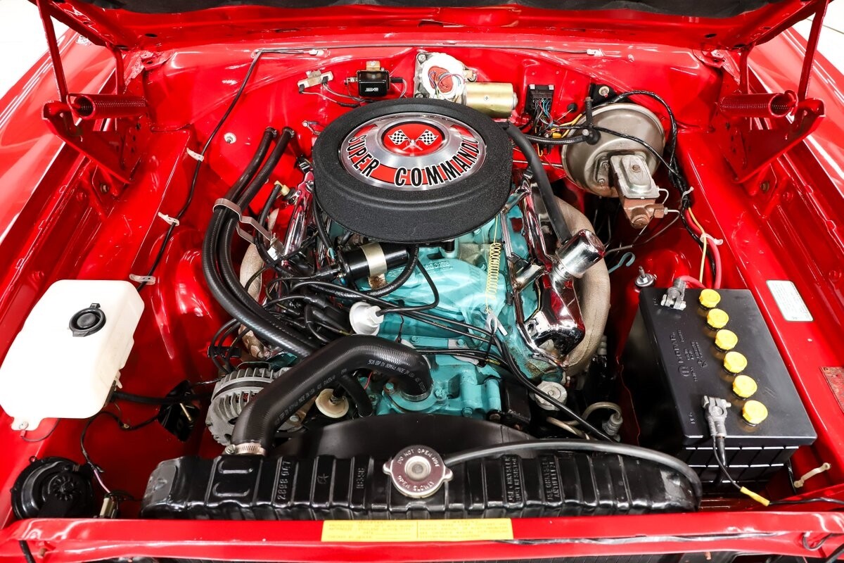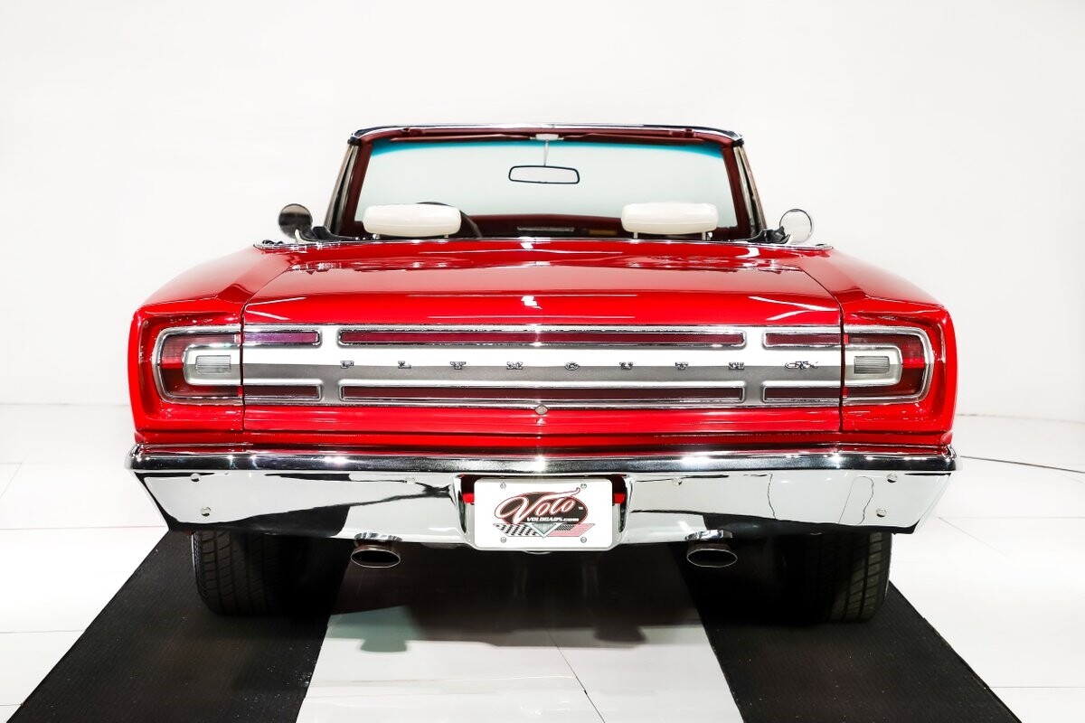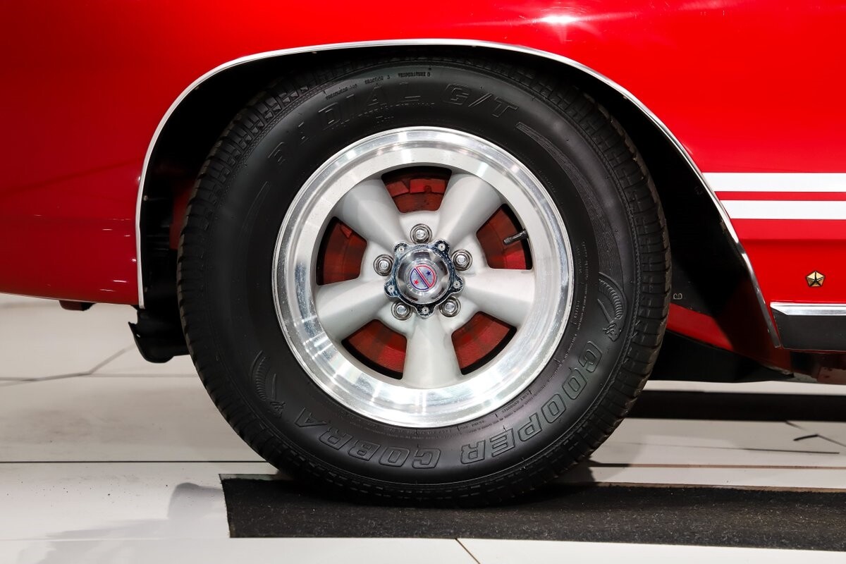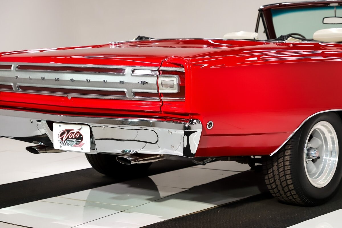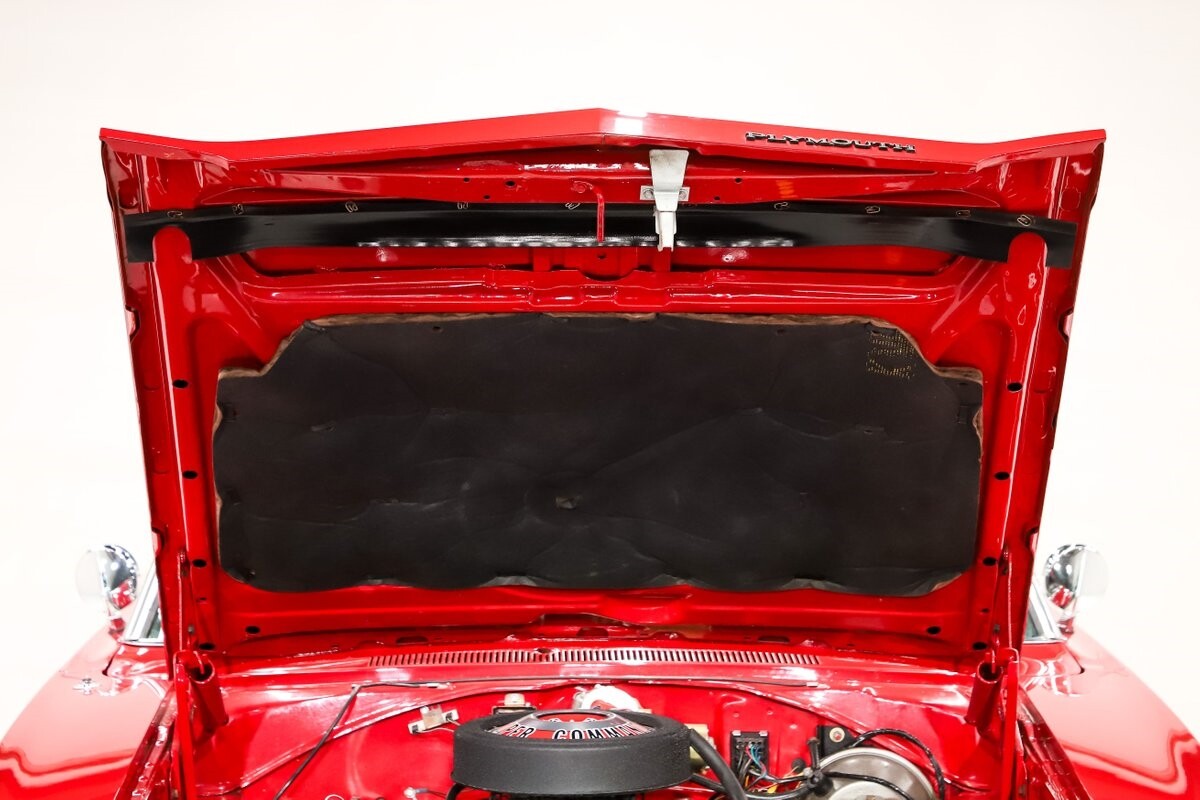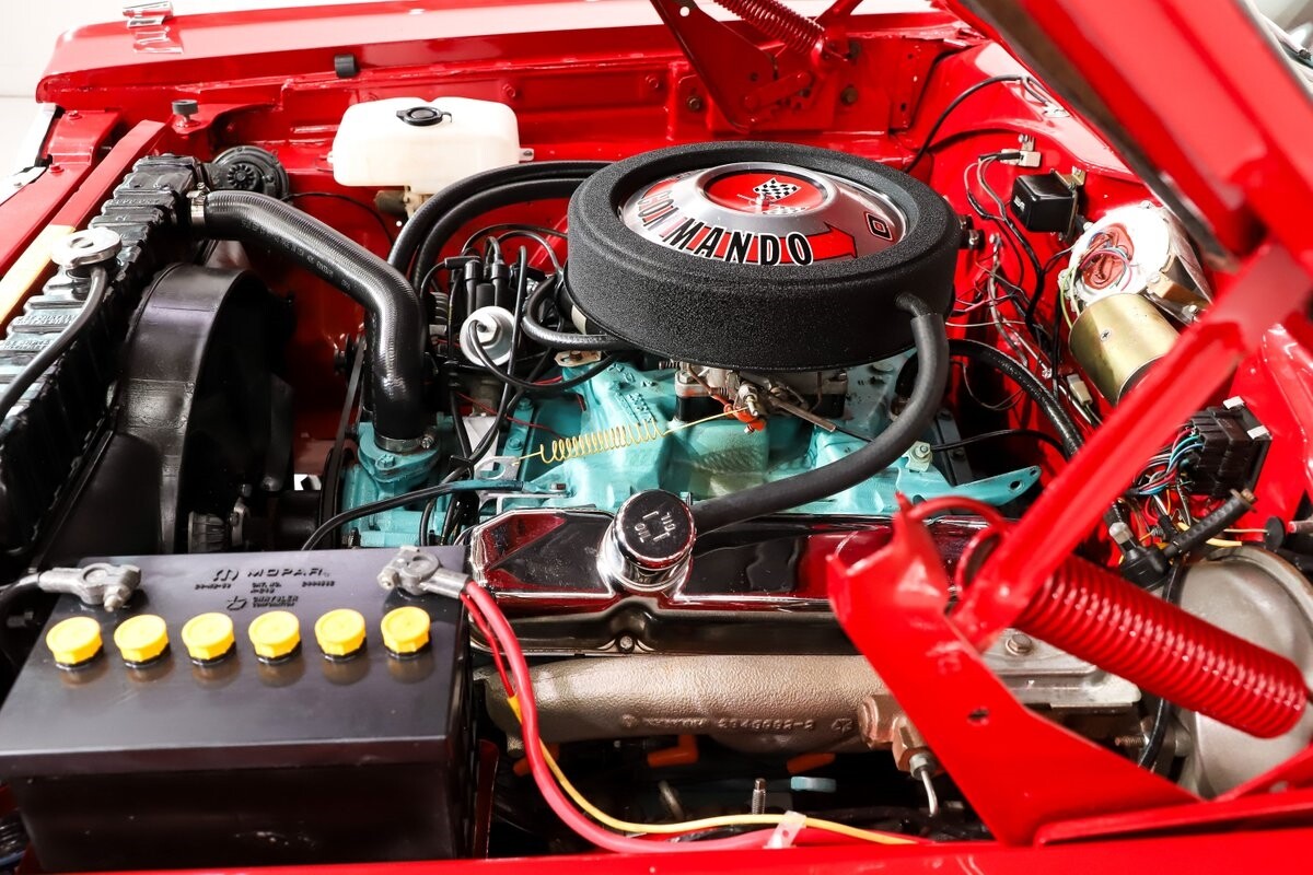 EXTERIOR: Factory Performance Red car wearing a black hood patch and white side stripes. The body is excellent, straight and there's no signs of rust or damage even after 12 years of being finished. Repainted its original performance red color and it's wearing the black hood patch and white side stripes. It has a very smooth glossy finish with just a few minor imperfections. The grill and tail panel are very good original condition, the bumpers were replated. Optional fender turn signals. In the video is said the lenses were cracked, they are not. Correct white Mopar grain power convertible top. Some 15 inch Torque Thrust wheels with meaty radial tires were added to make it a better driver.