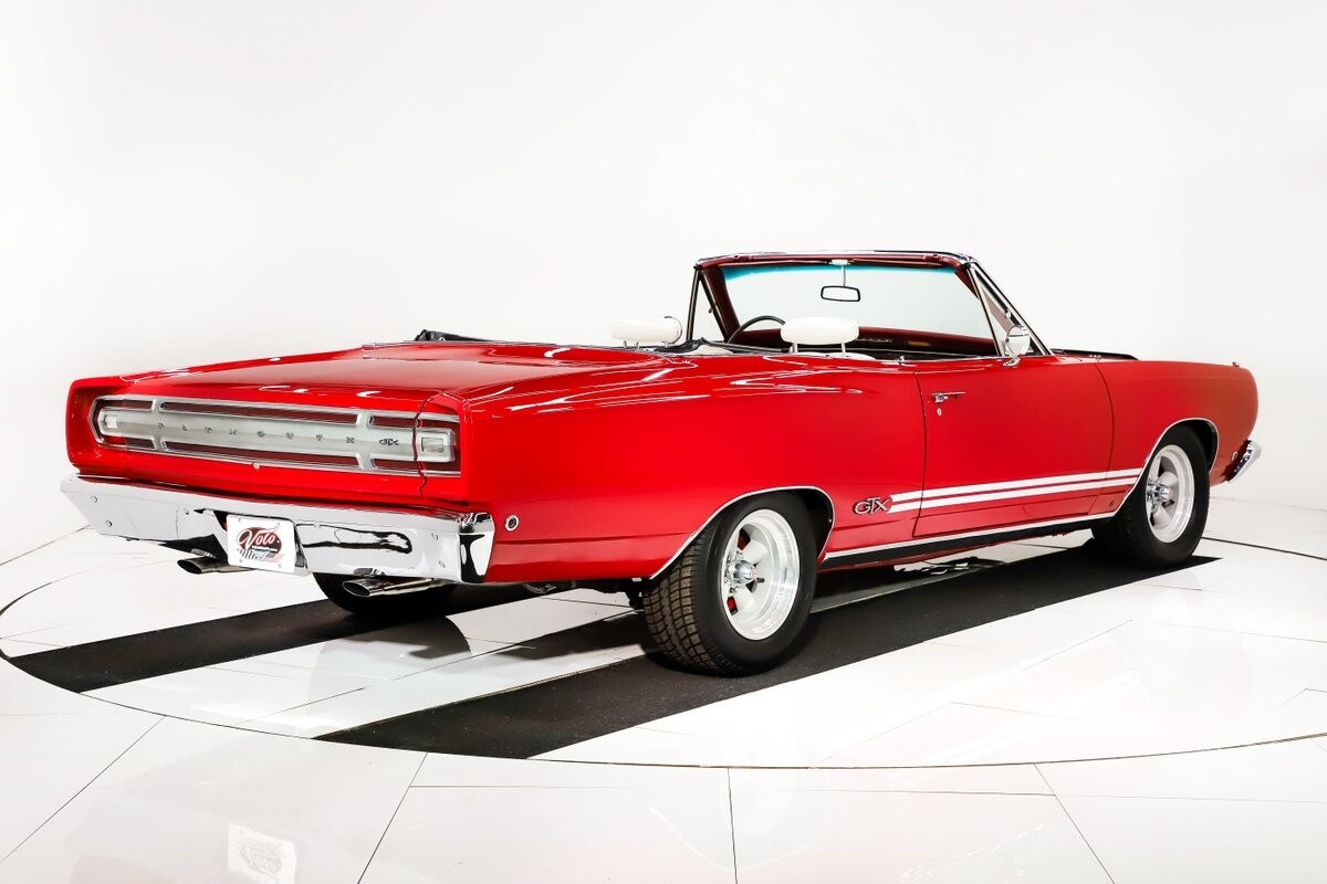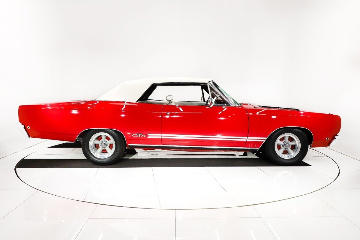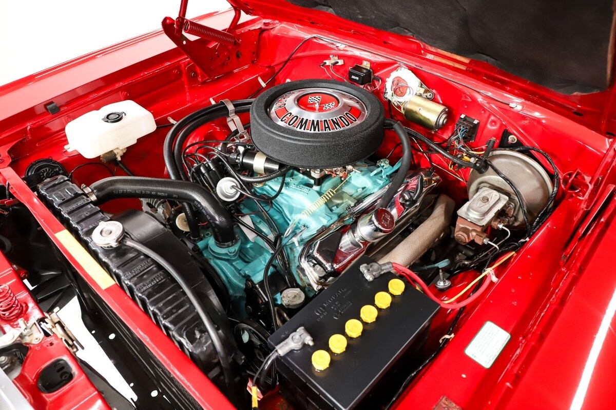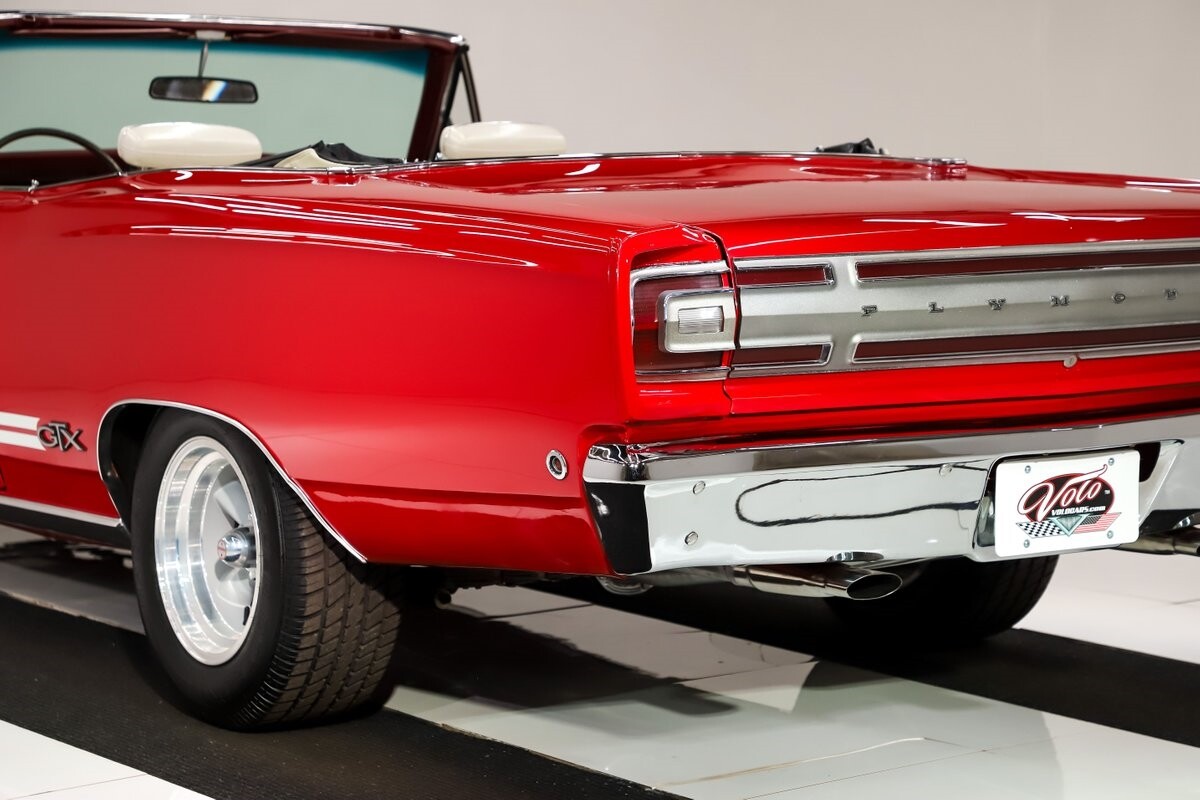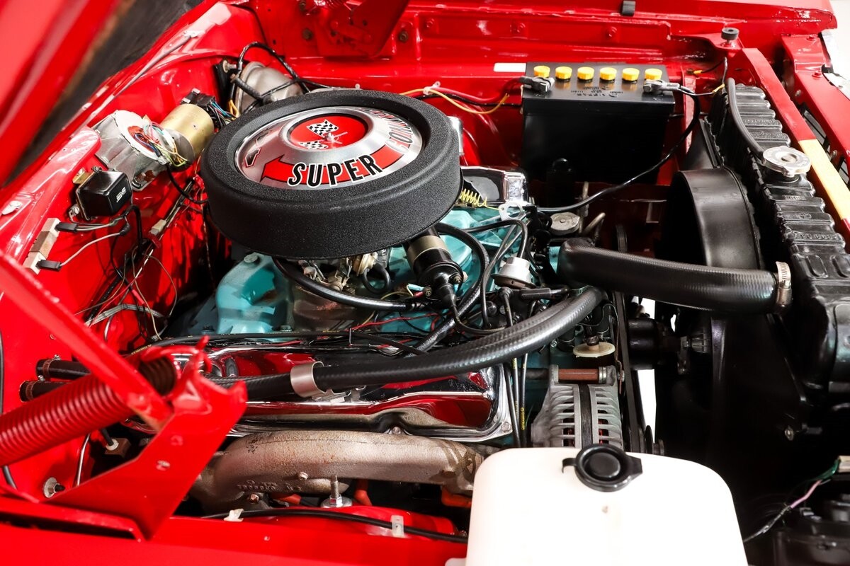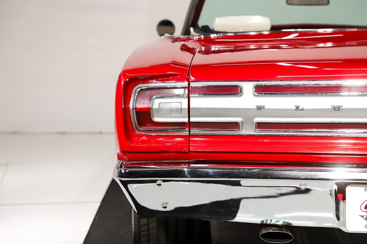 EXTERIOR: Factory Performance Red car wearing a black hood patch and white side stripes. The body is excellent, straight and there's no signs of rust or damage even after 12 years of being finished. Repainted its original performance red color and it's wearing the black hood patch and white side stripes. It has a very smooth glossy finish with just a few minor imperfections. The grill and tail panel are very good original condition, the bumpers were replated. Optional fender turn signals. In the video is said the lenses were cracked, they are not. Correct white Mopar grain power convertible top. Some 15 inch Torque Thrust wheels with meaty radial tires were added to make it a better driver.