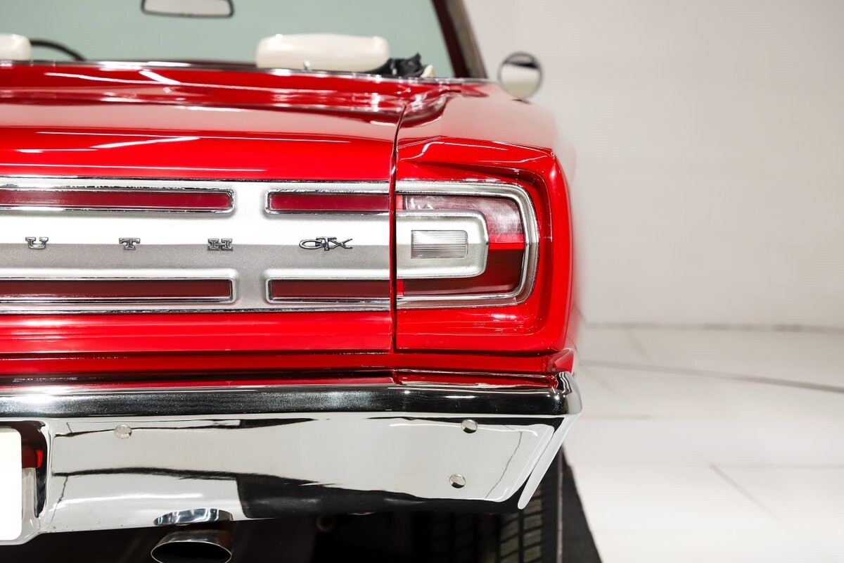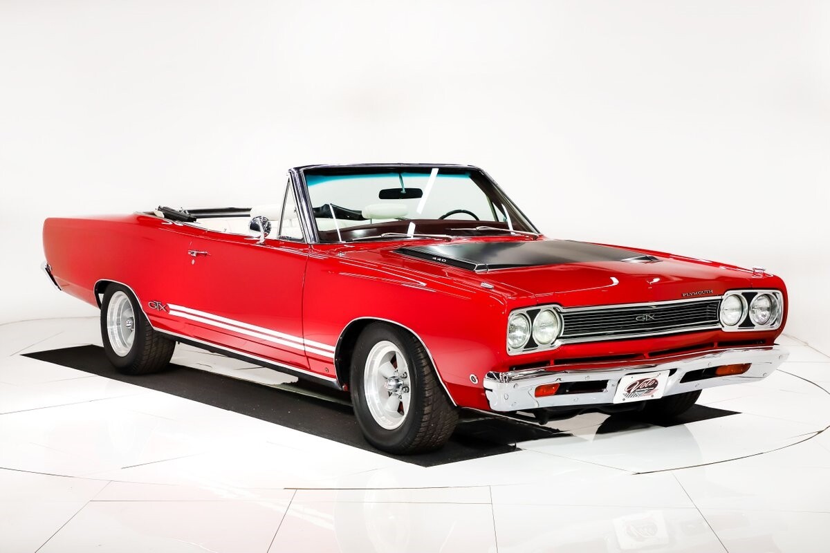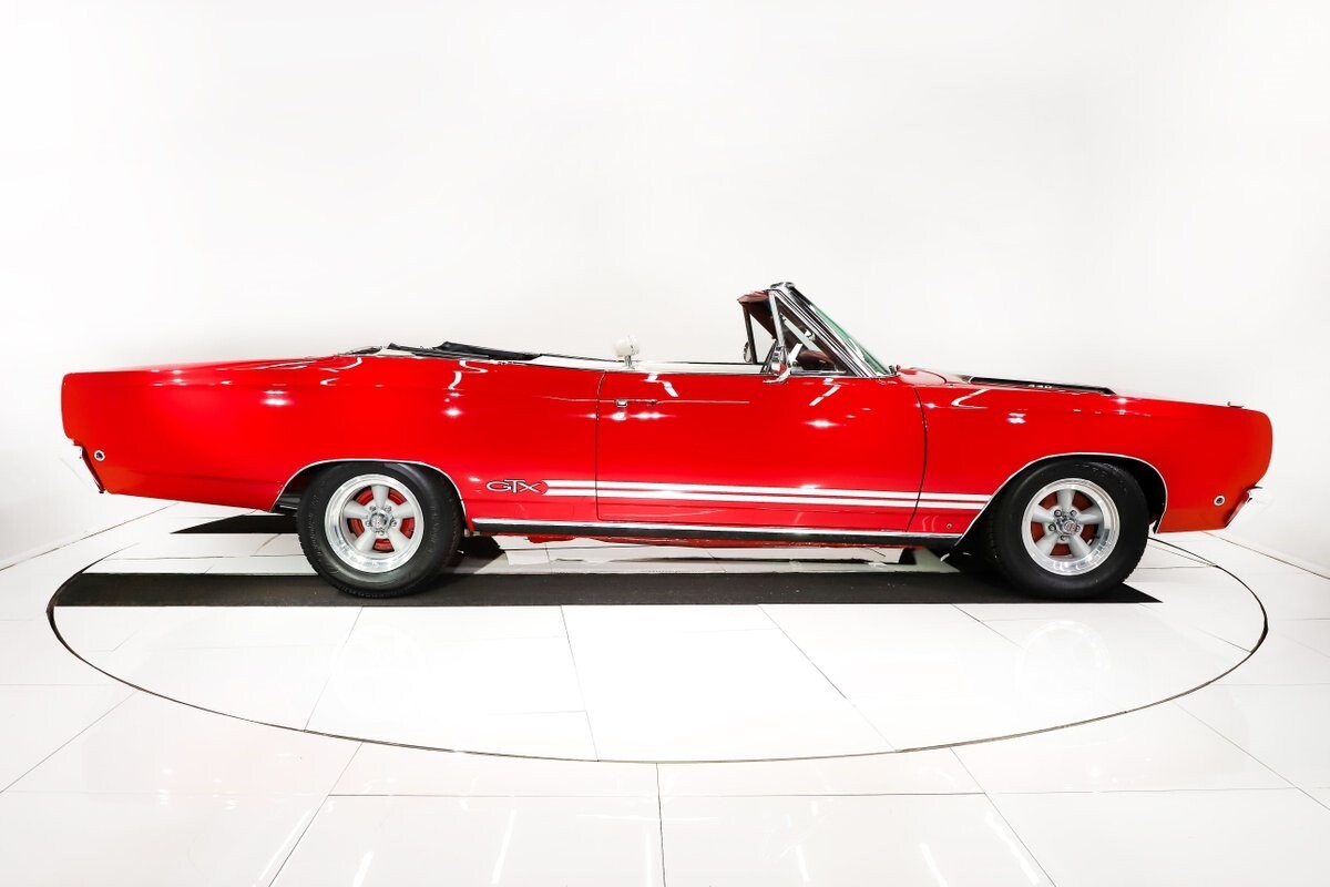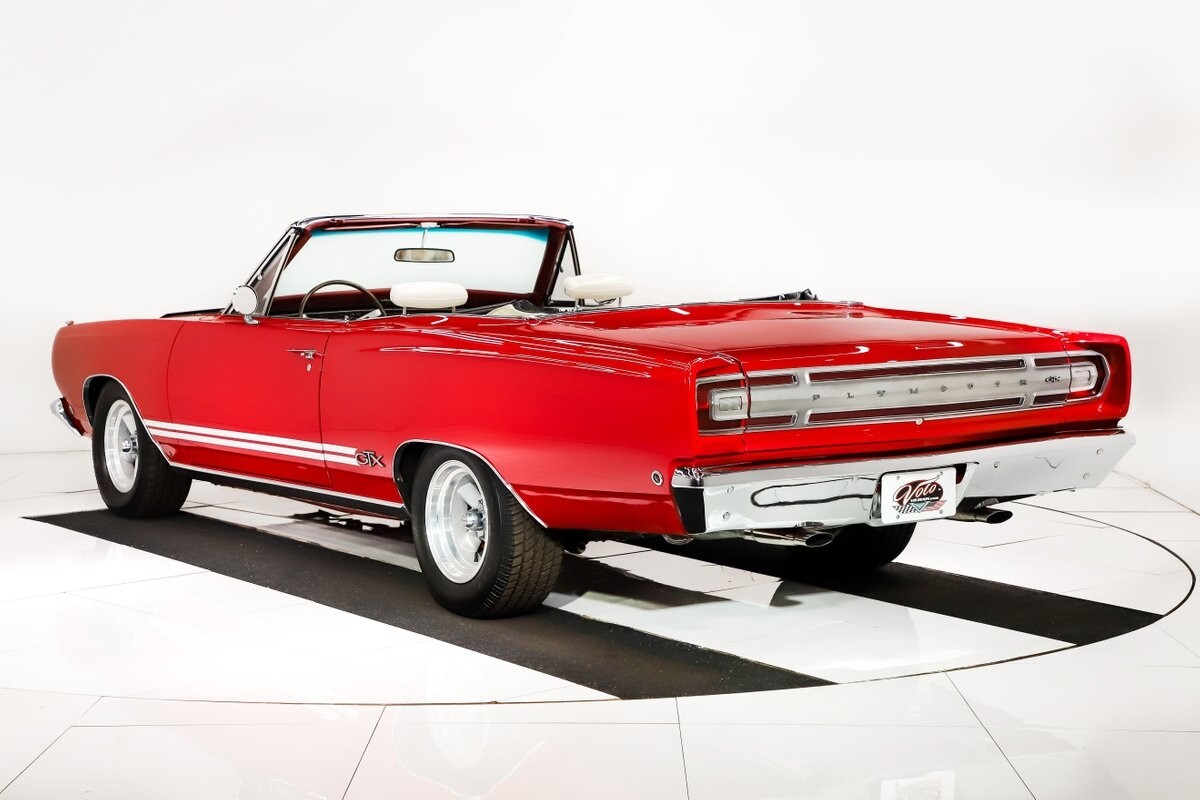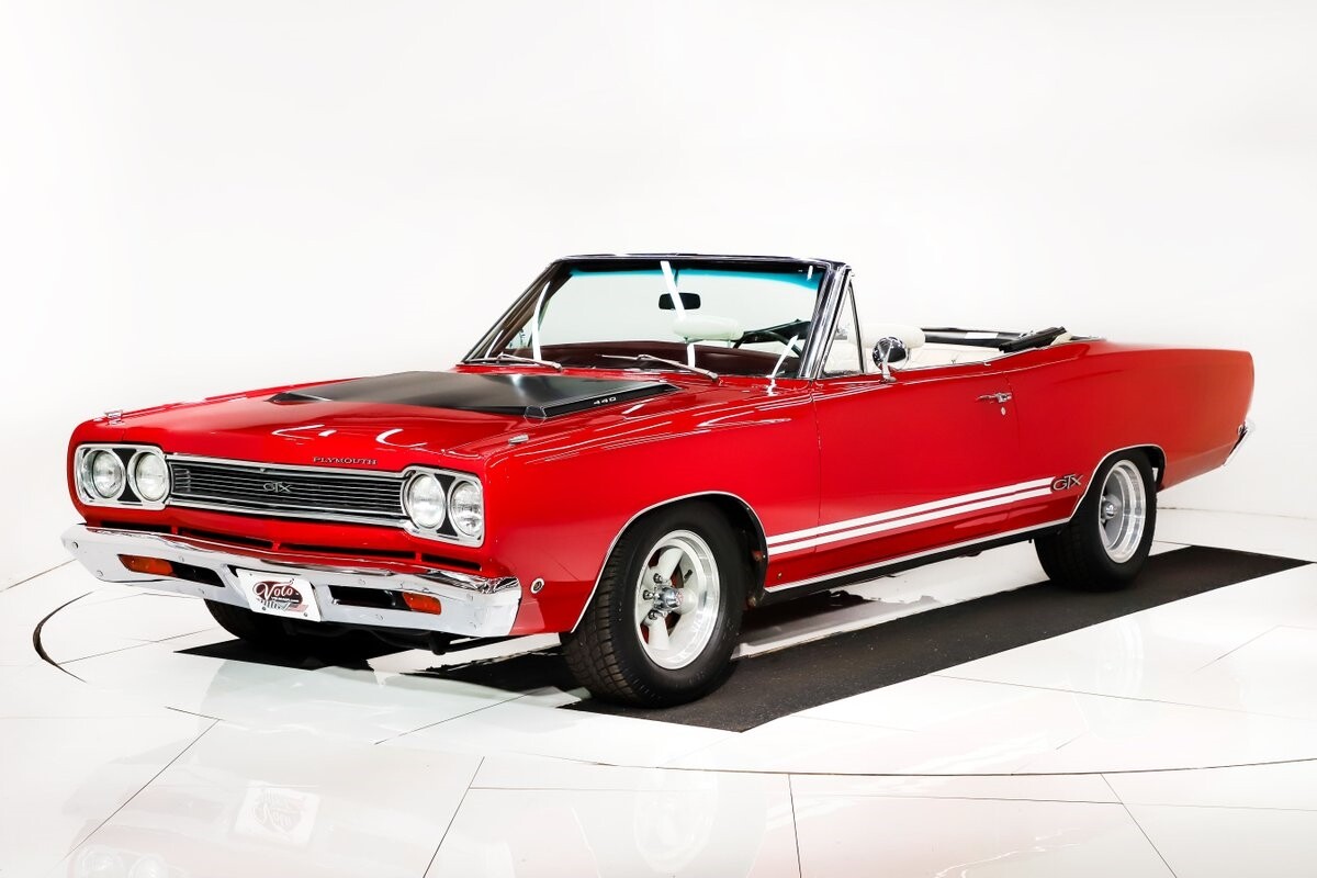 EXTERIOR: Factory Performance Red car wearing a black hood patch and white side stripes. The body is excellent, straight and there's no signs of rust or damage even after 12 years of being finished. Repainted its original performance red color and it's wearing the black hood patch and white side stripes. It has a very smooth glossy finish with just a few minor imperfections. The grill and tail panel are very good original condition, the bumpers were replated. Optional fender turn signals. In the video is said the lenses were cracked, they are not. Correct white Mopar grain power convertible top. Some 15 inch Torque Thrust wheels with meaty radial tires were added to make it a better driver.