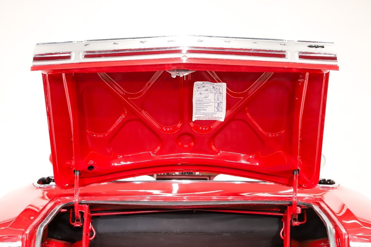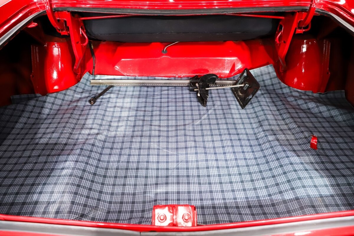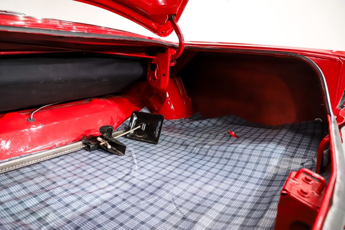 TRUNK COMPARTMENT: The trunk lid is painted slick, inside is clean metal painted red. It has a new mat and weatherstrip. There is a jack assembly but no spare.