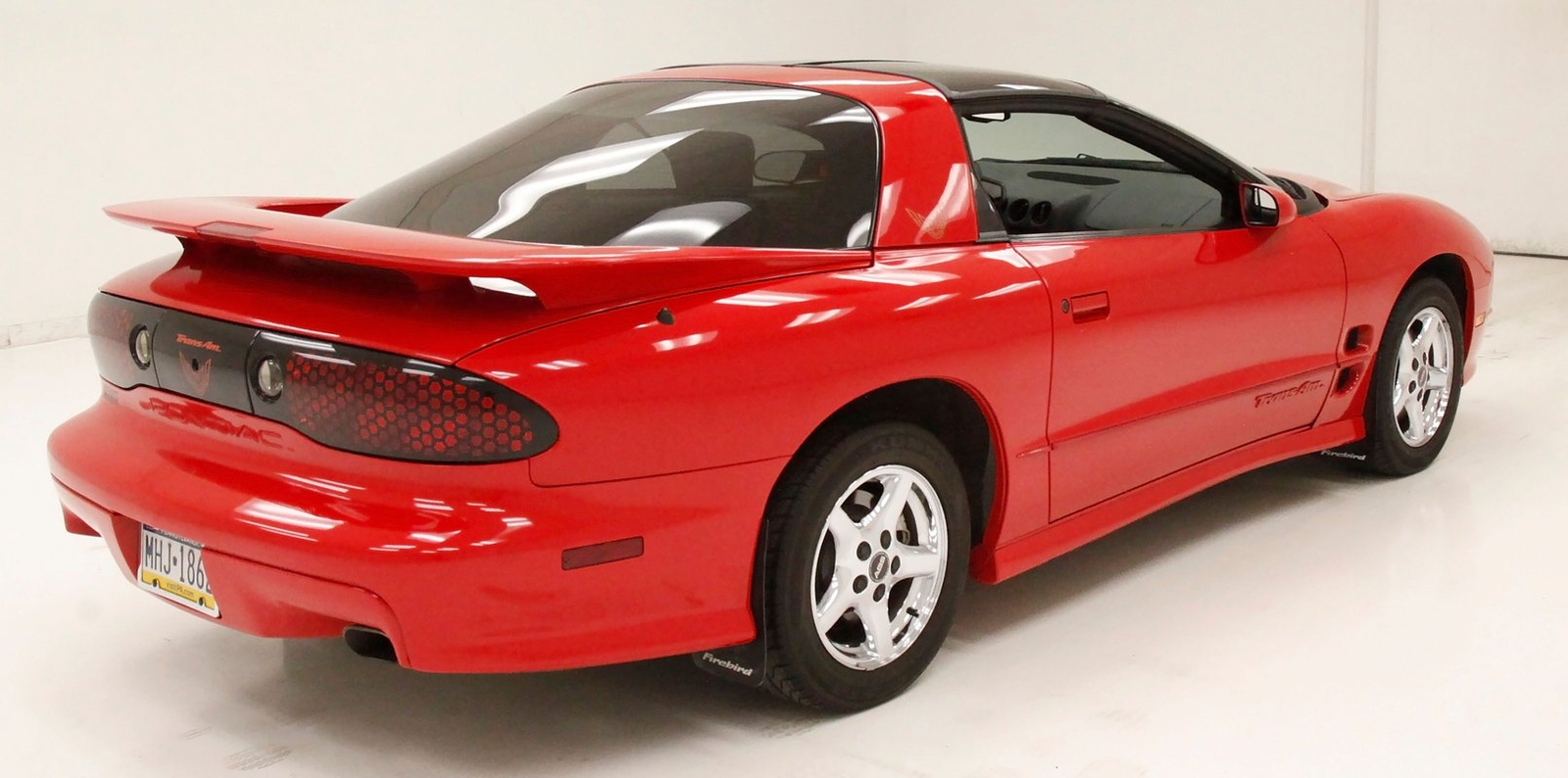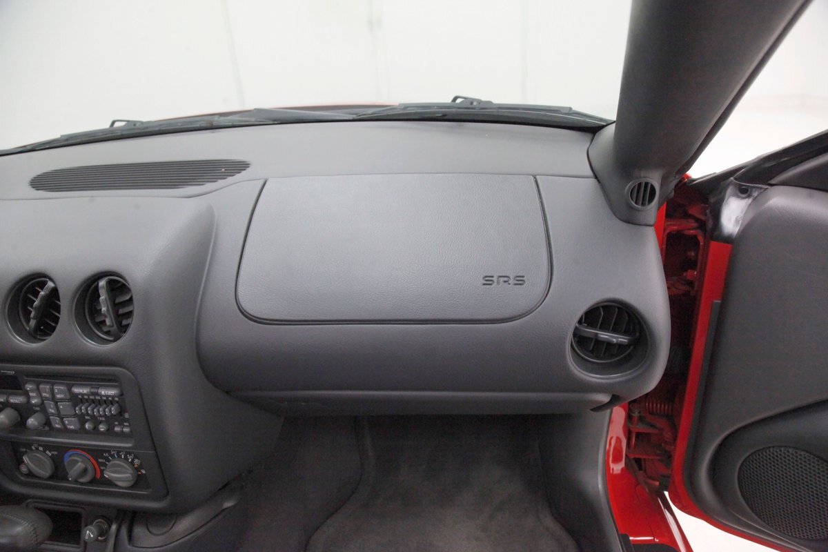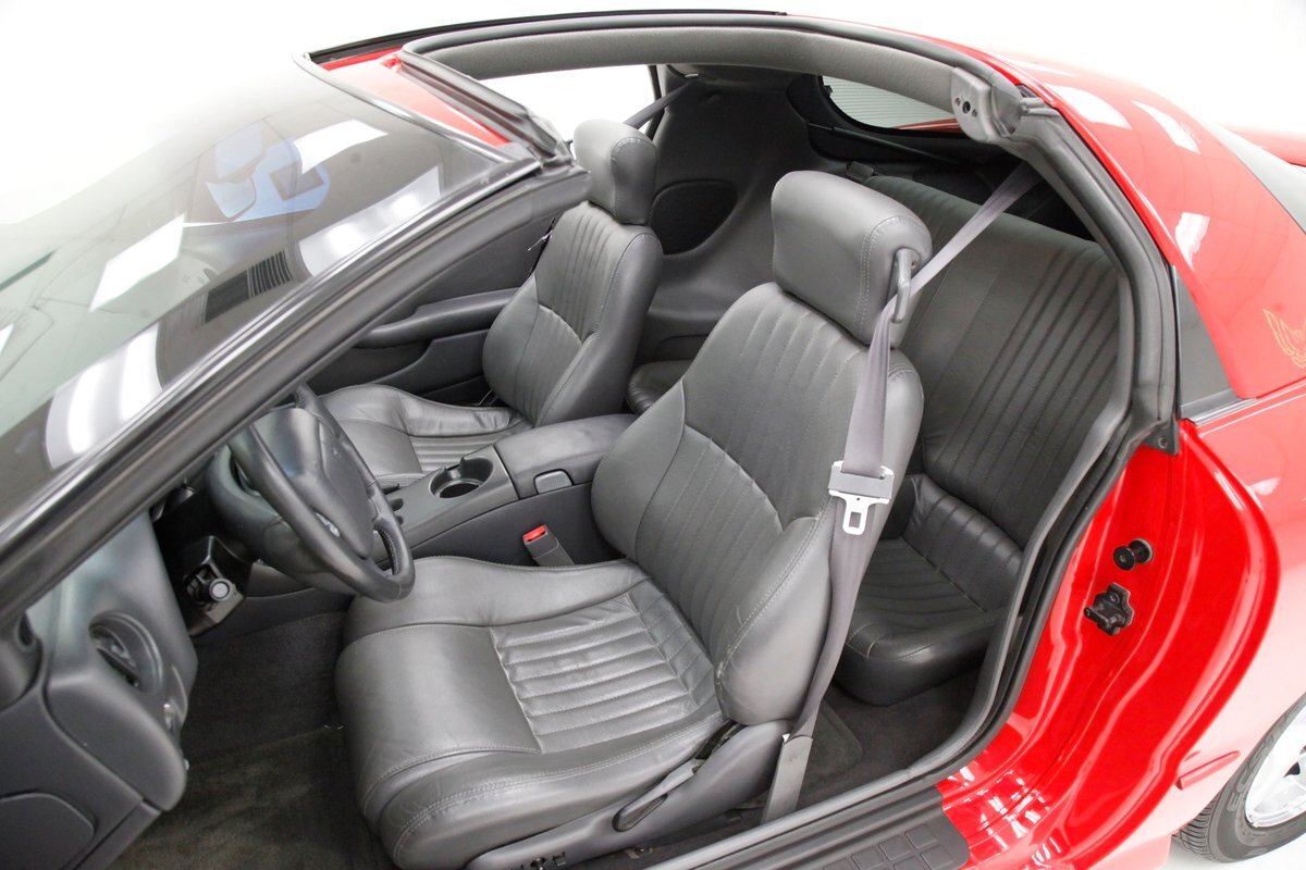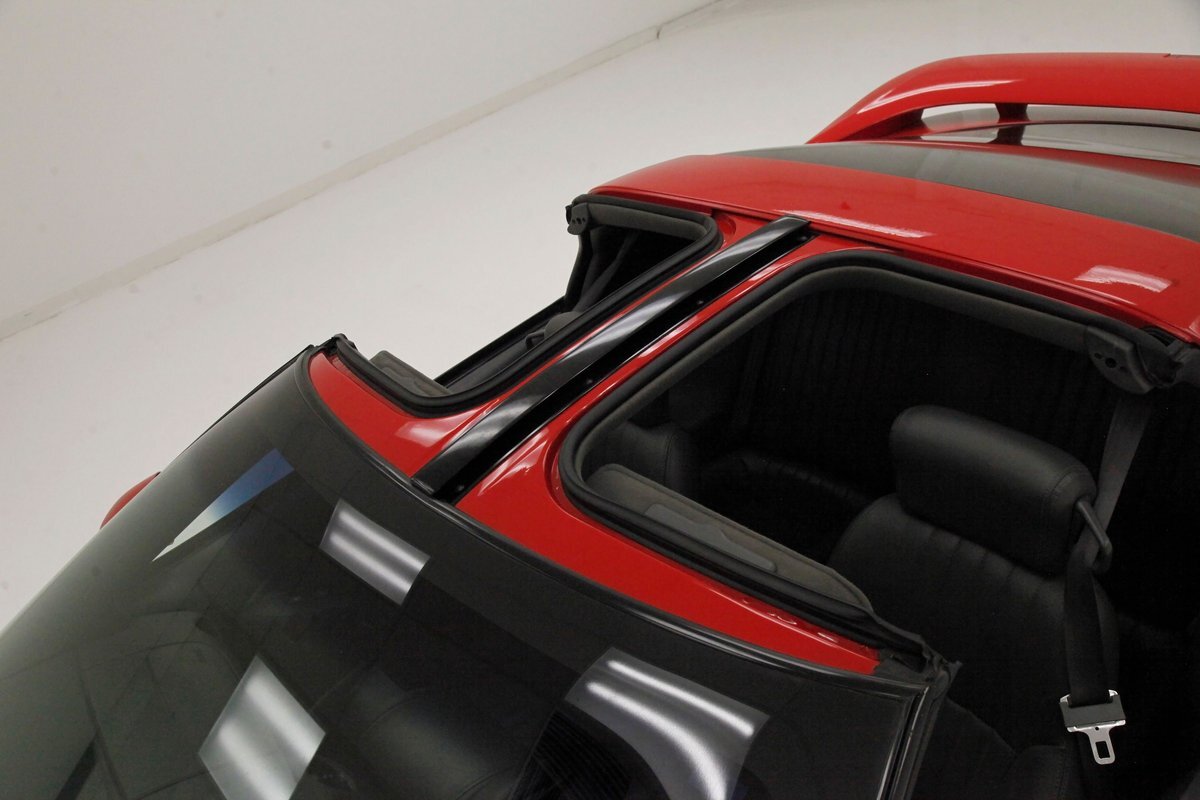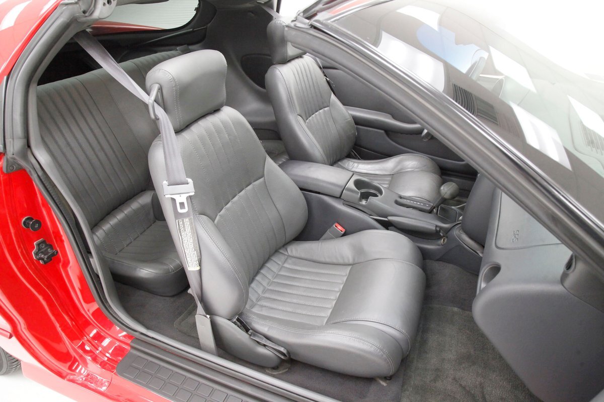 All dressed up in Bright Red, from the 2 bumps at the front of the fenders that magically turn into headlights, to the dual snout scooped intake cowling hood flanked by 2 front fender bumps, and more intake inlets on the quarter panels, to the severely raked windscreen, to the rear trunk lid that seems to go on forever as it becomes an integrated spoiler. All in nice condition, and the optional T-tops are with this car. Standard 16-inch multi-spoke chrome wheels are seen on all 4's and are wrapped in 245/50R16 blackwall rubber.