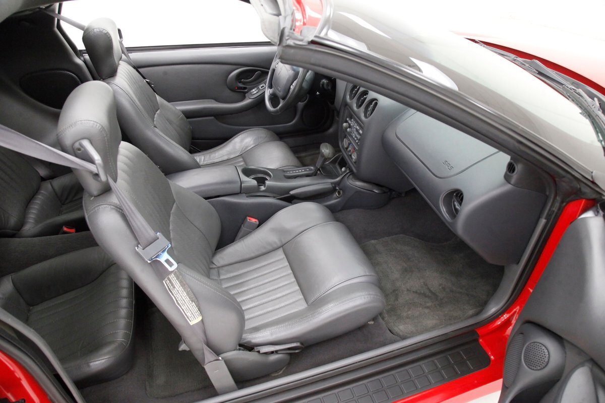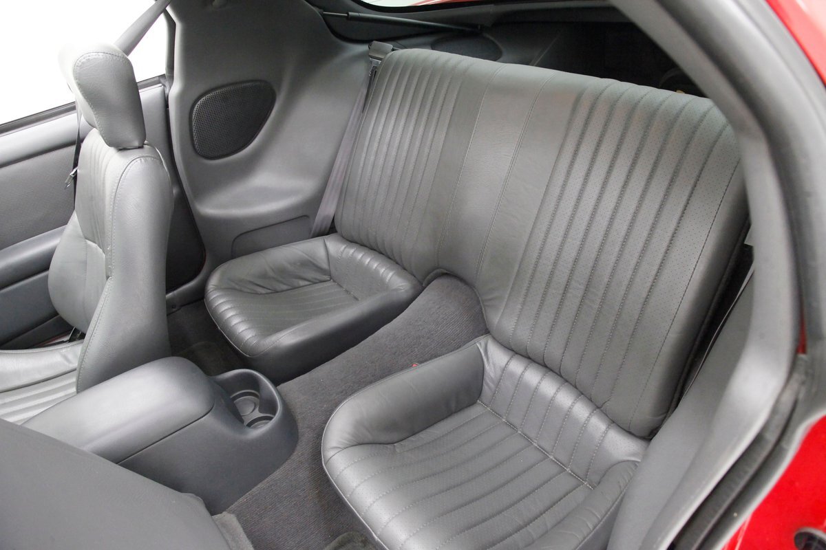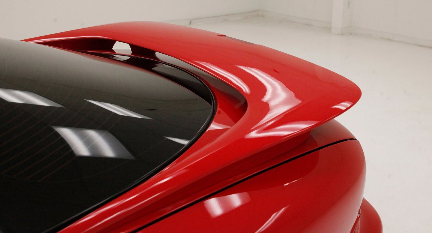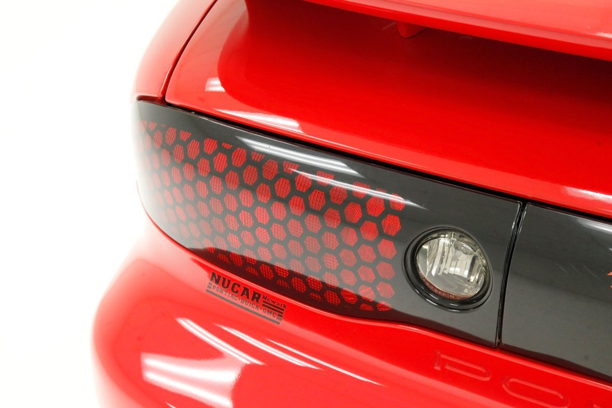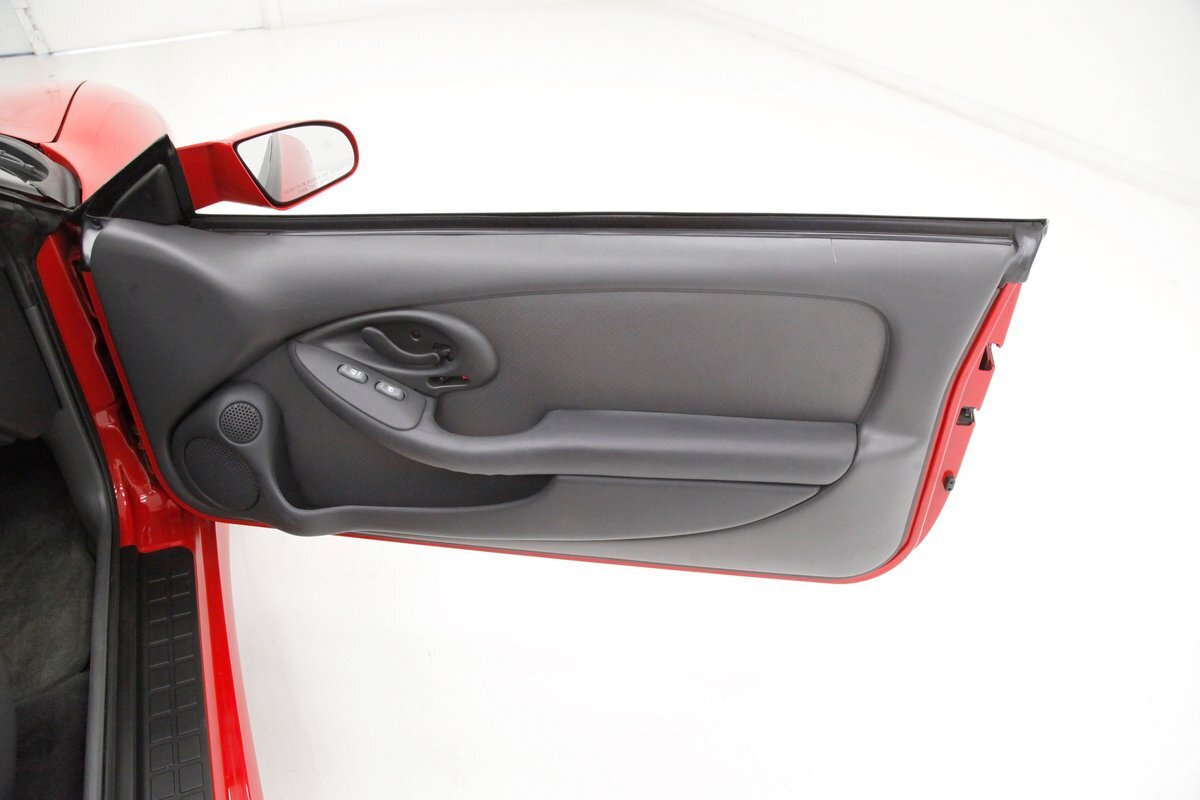 All dressed up in Bright Red, from the 2 bumps at the front of the fenders that magically turn into headlights, to the dual snout scooped intake cowling hood flanked by 2 front fender bumps, and more intake inlets on the quarter panels, to the severely raked windscreen, to the rear trunk lid that seems to go on forever as it becomes an integrated spoiler. All in nice condition, and the optional T-tops are with this car. Standard 16-inch multi-spoke chrome wheels are seen on all 4's and are wrapped in 245/50R16 blackwall rubber.