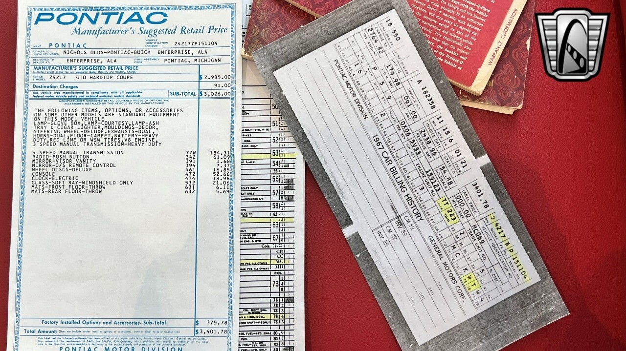 This car was born in Pontiac, Michigan and delivered to Nichols Olds-Pontiac-Buick in Enterprise, Alabama. As also shown on the included window sticker, this Goat left the factory with options like 4 speed manual transmission, push button radio, visor vanity mirror, deluxe wheel discs, console, and electric clock. Bringing the MSRP up to a whopping $3401.78. Additional information includes the original sale contract, copy of protect-o-plate, 1967 Owner's manual and Owner Protection Plan book. The current owner is claimed to be only the fourth of this car's long life. The Montego white exterior paint is accented with black pinstripes and is complimented by the Rally II wheels with BFG white letter tires. Inside, the black bucket seats and console surround the Hurst 4 speed shifter and provide all the comfort in driving this legendary machine. Under the iconic hood resides the 400 CID V8 powerplant that is claimed by the owner to have matching numbers to the VIN. If you want to step back in time and drive one of the most popular muscle cars, this is the car for you.
