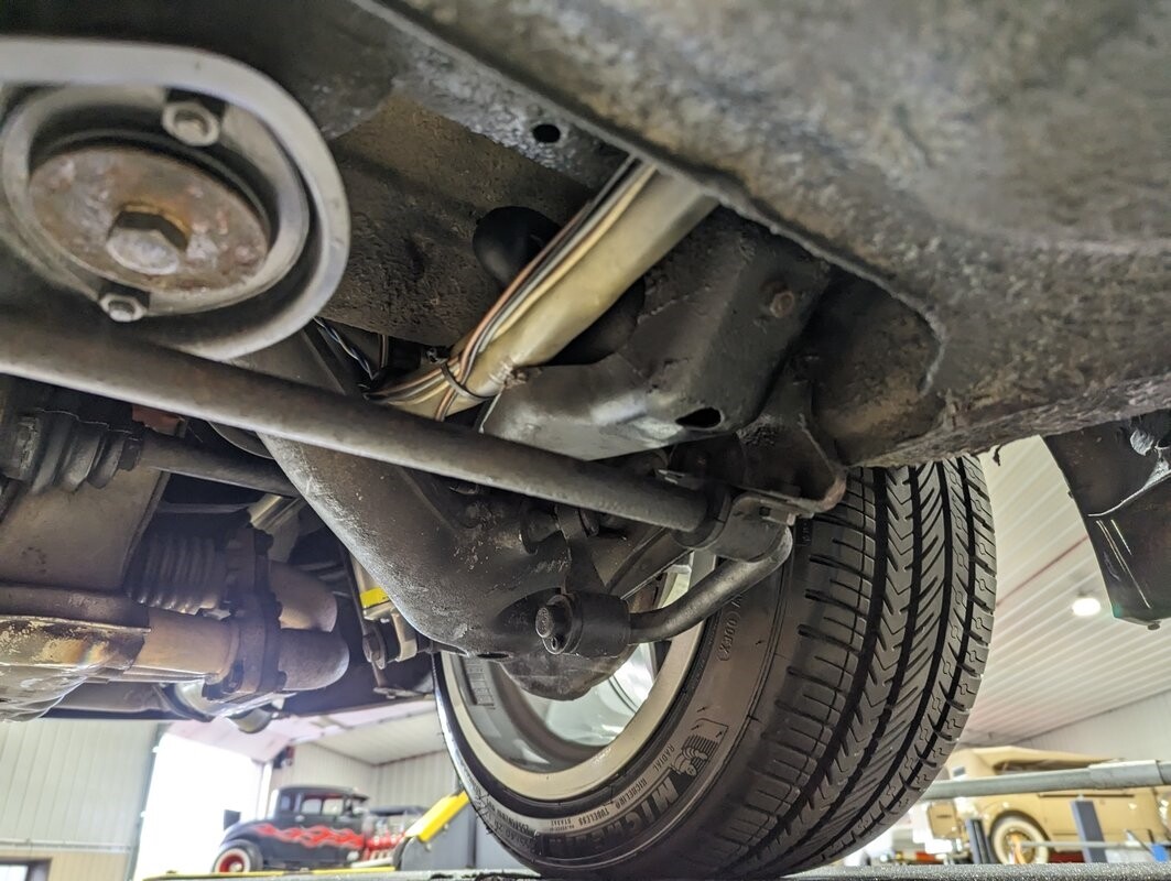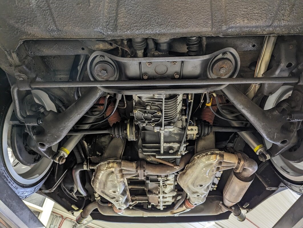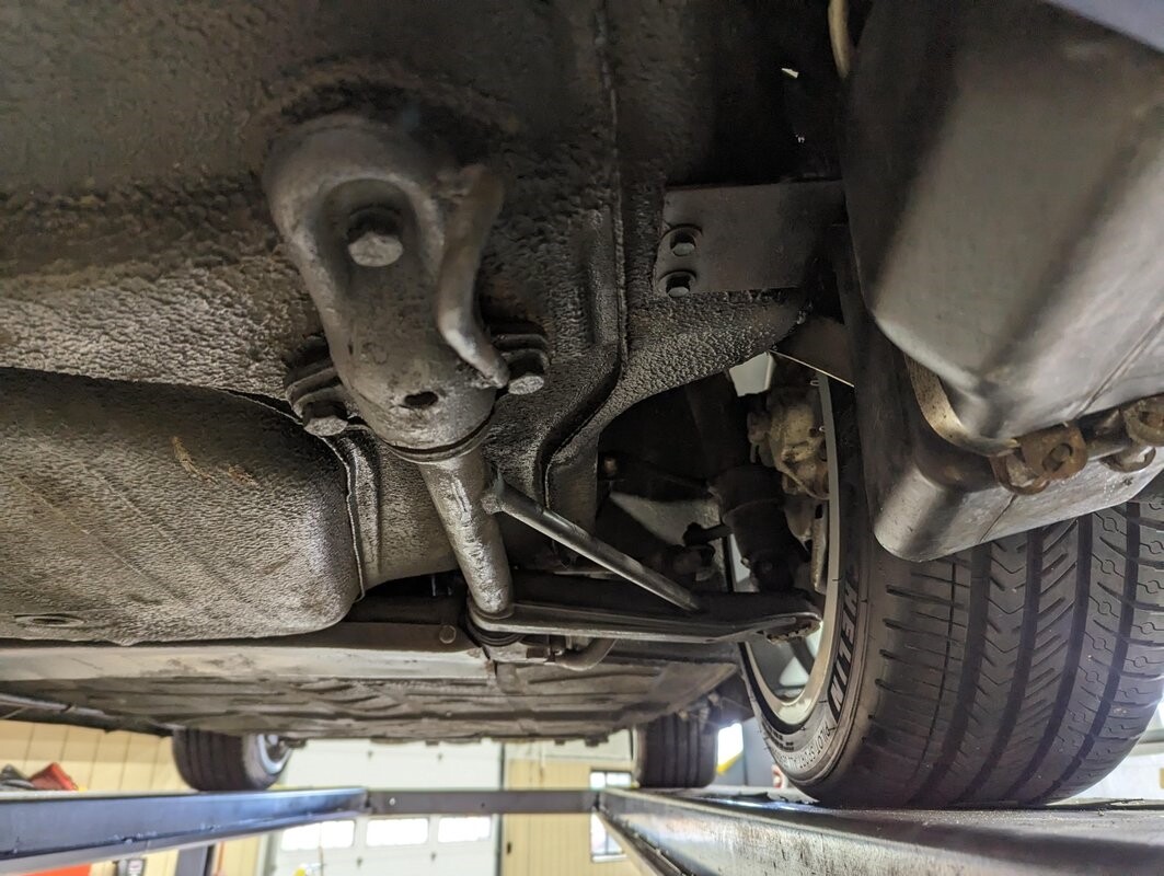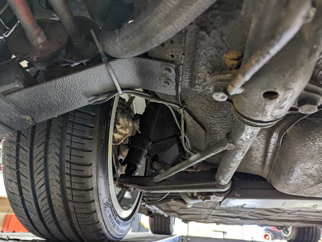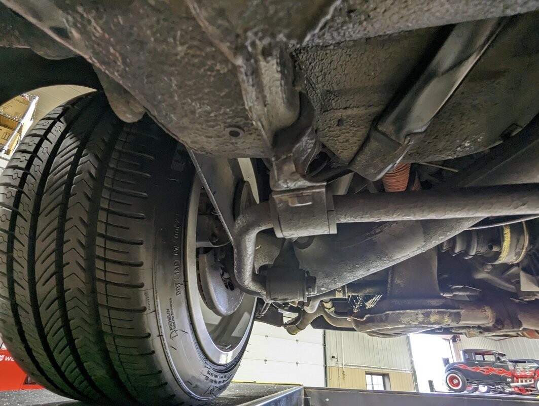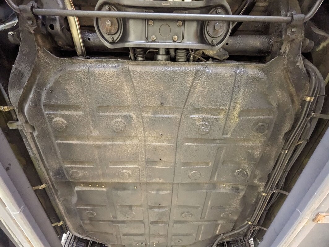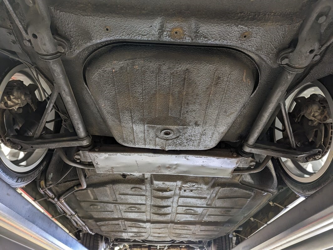 UNDERSIDE: Underneath is original and in very nice condition. The original undercoating is still in great shape. The floors are solid and the trunk area. As to be expected with the age it has its patina but no major rust or rot anywhere. Overall clean and everything is functional. You are looking up at a correct 5 spd manual transmission. The factory dual exhaust is intact and does not leak.