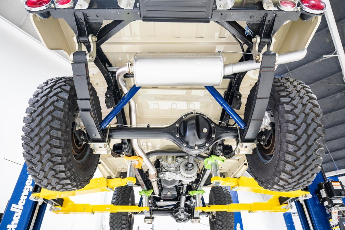 One of the key points of the FJ-40 is its simplicity and durability. It features a robust 4.2-liter 2F inline-6 engine, which is renowned for its reliability and power. The engine is paired with a 3-speed manual transmission, and it comes equipped with true 4WD with a "granny low", making it an off-road beast. The FJ-40's body-on-frame construction and solid front and rear axles contribute to its reputation for being nearly indestructible.