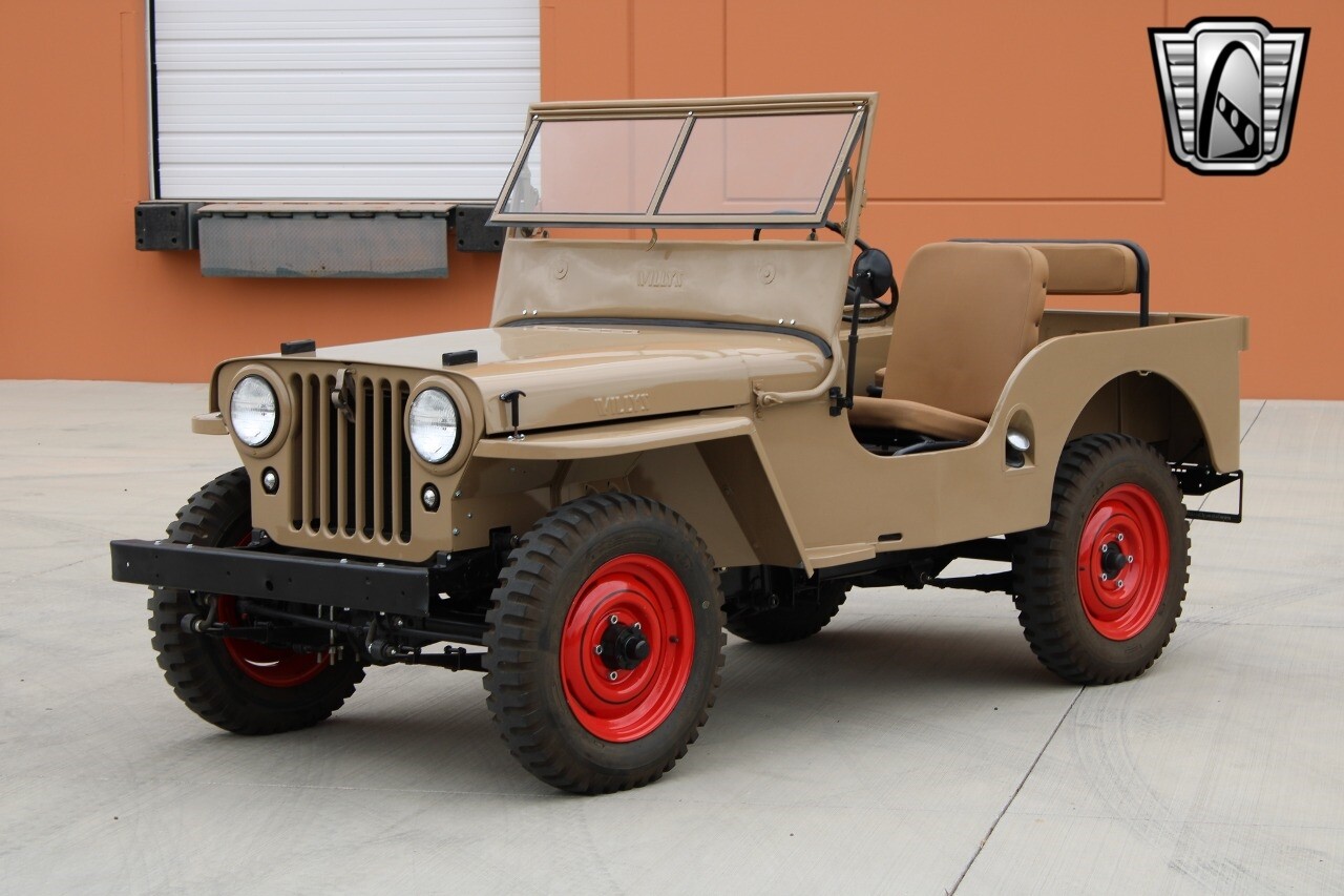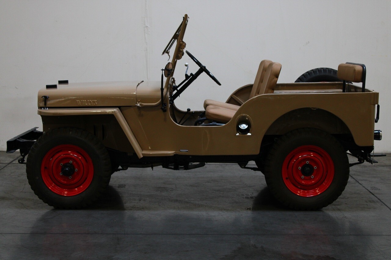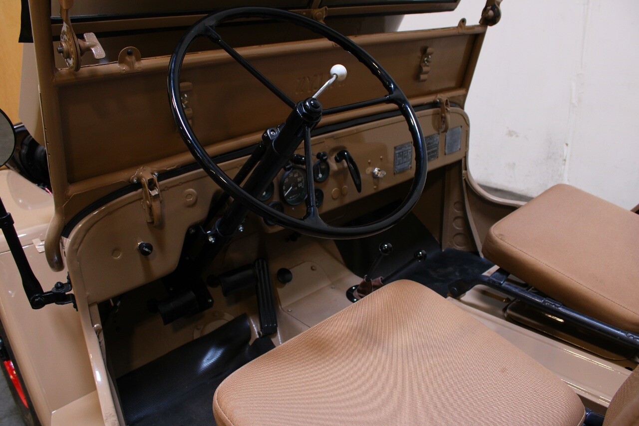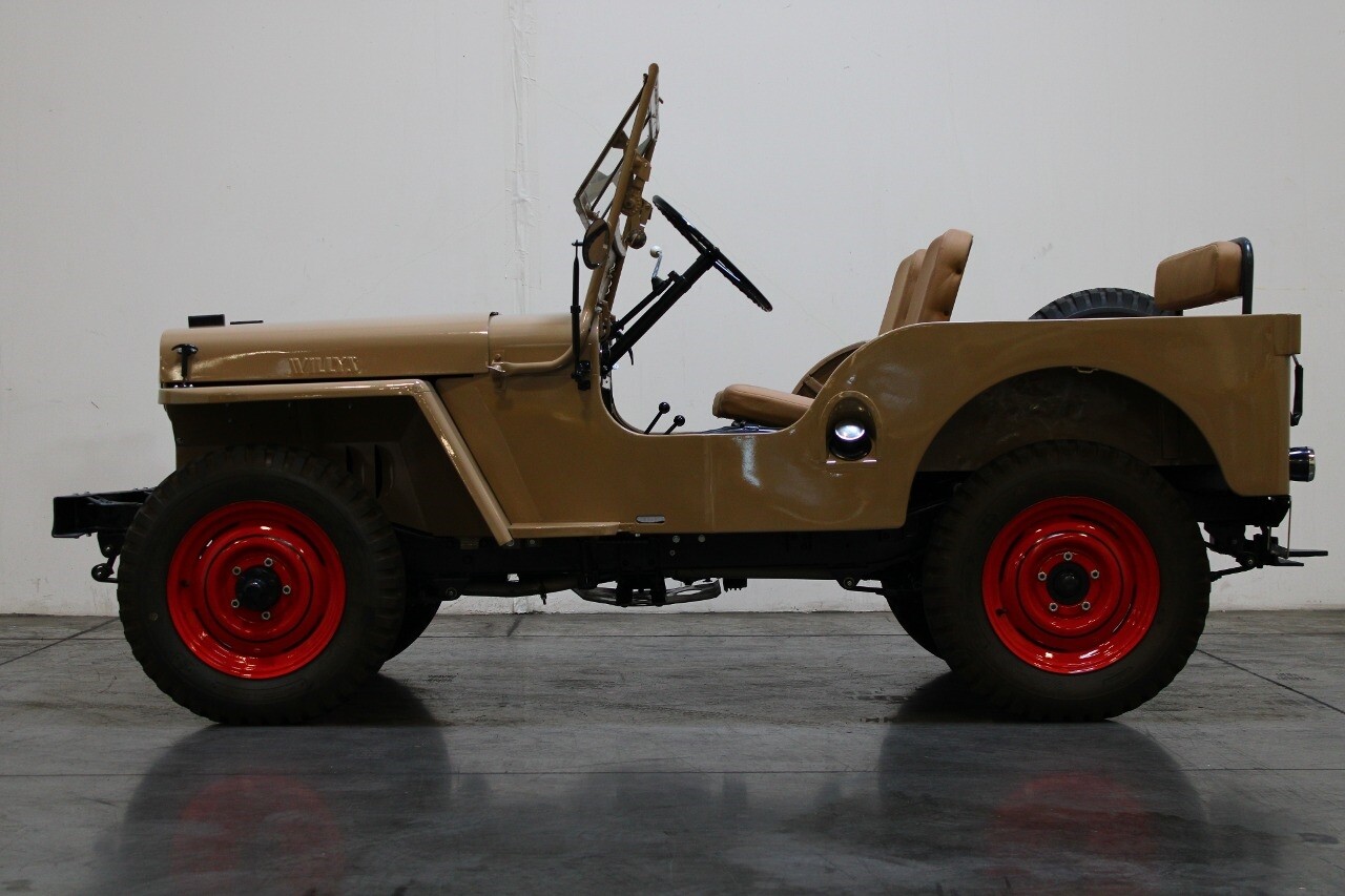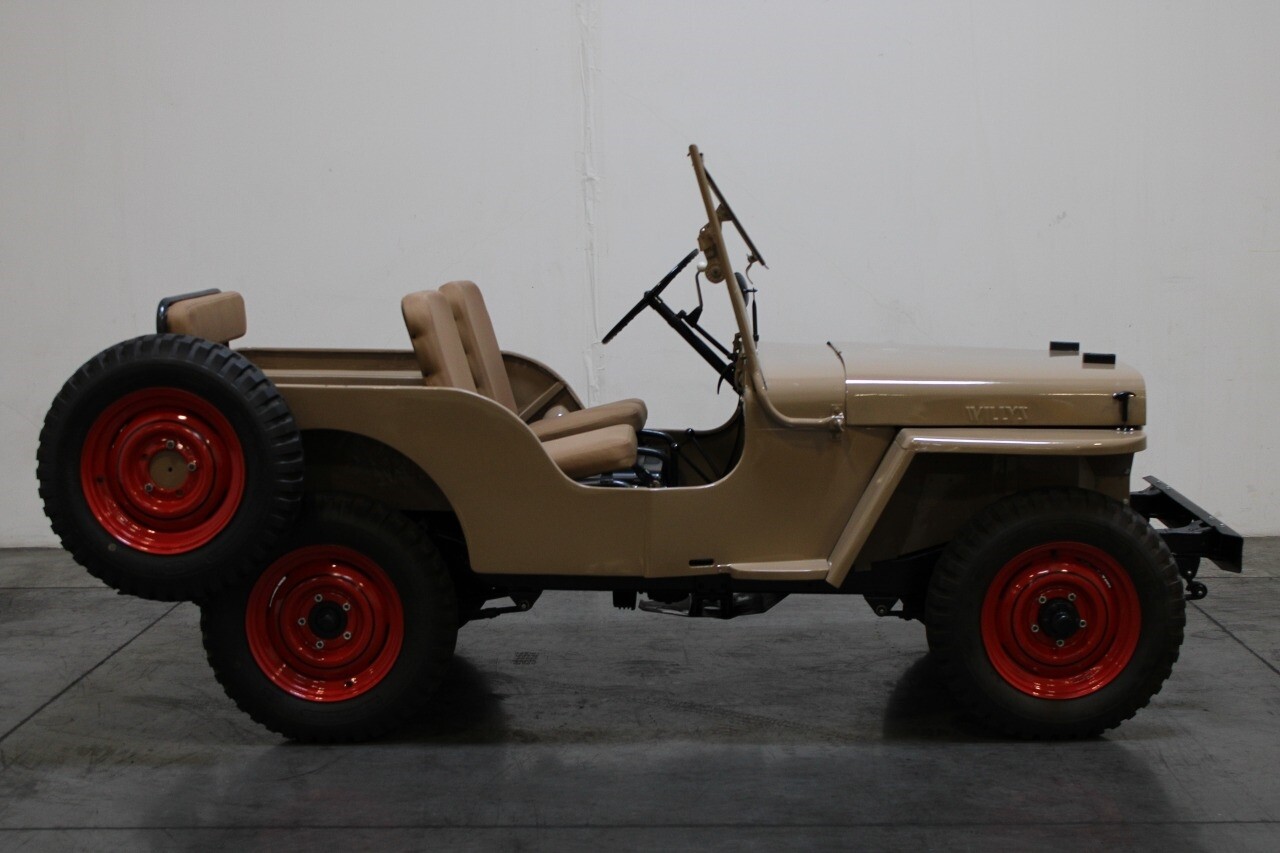 Introducing the 1946 Willys CJ2A, a true gem for collectors and enthusiasts of classic automobiles. This rare model stands out with its striking harvest tan exterior, a color that captures the essence of its era. The exterior is complemented by a matching harvest tan cloth interior, creating a cohesive and visually appealing aesthetic that is sure to turn heads wherever you go.