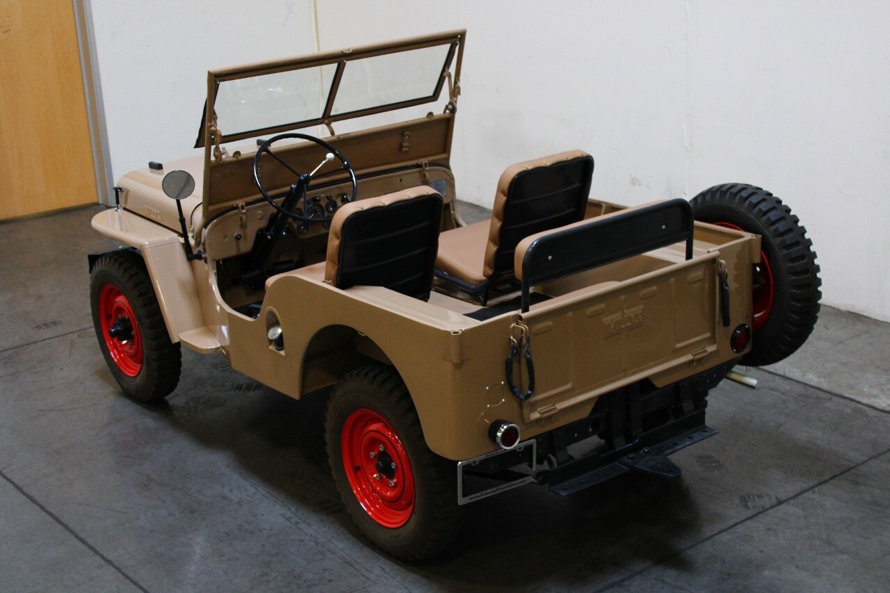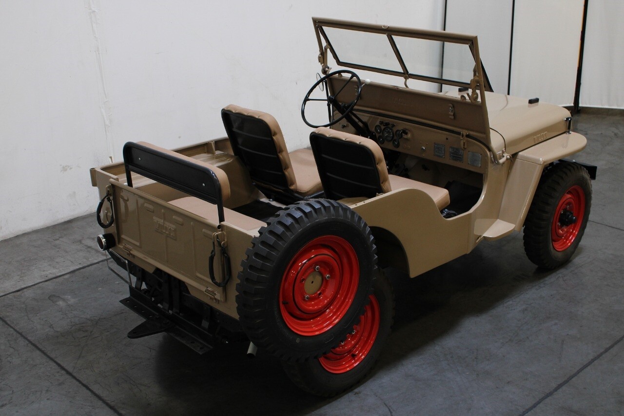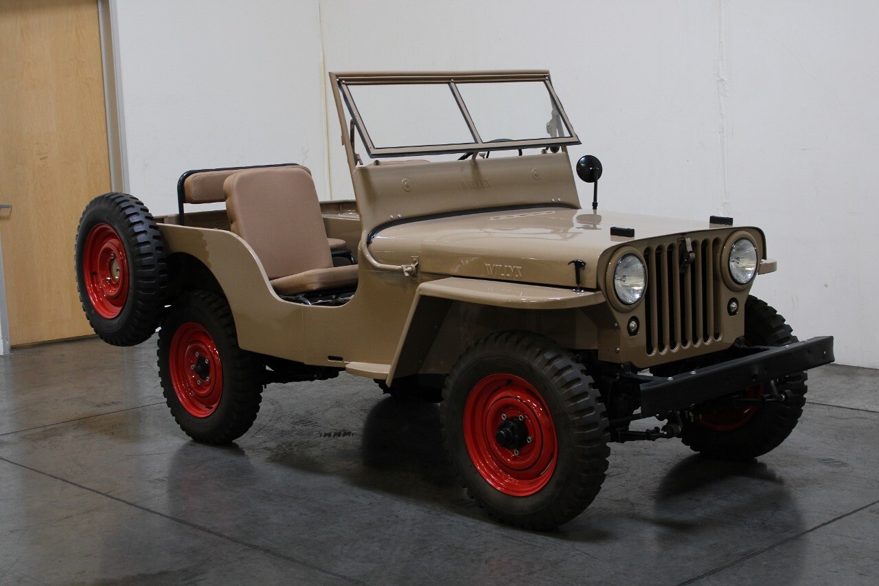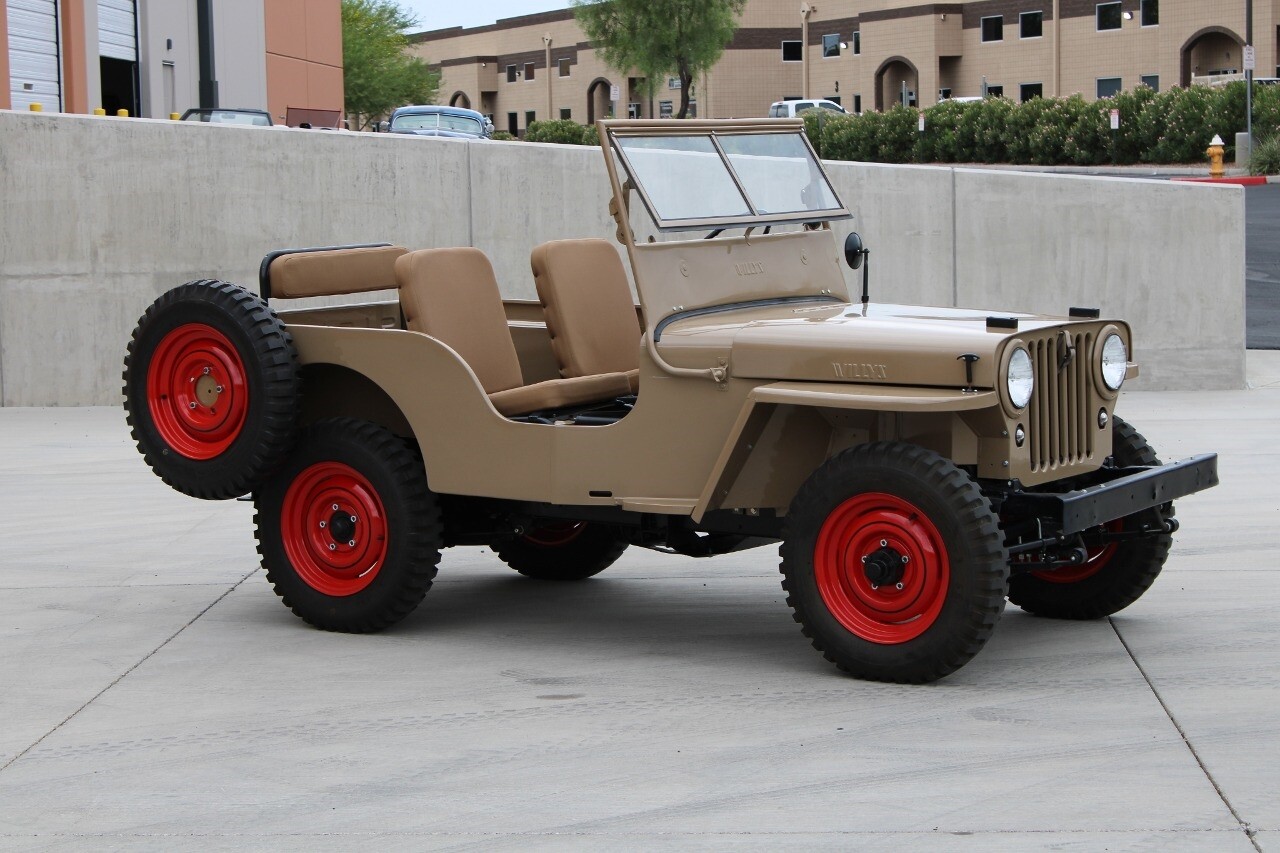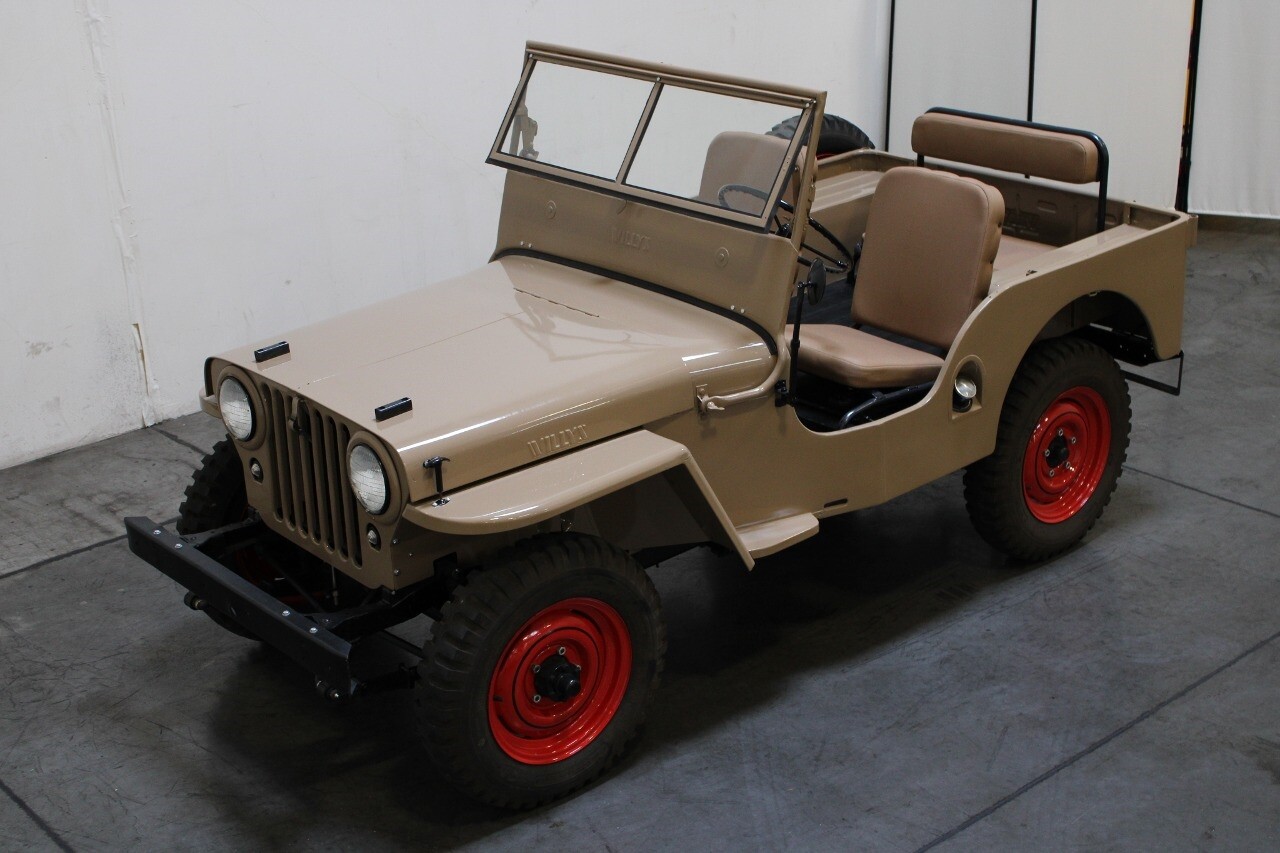 Introducing the 1946 Willys CJ2A, a true gem for collectors and enthusiasts of classic automobiles. This rare model stands out with its striking harvest tan exterior, a color that captures the essence of its era. The exterior is complemented by a matching harvest tan cloth interior, creating a cohesive and visually appealing aesthetic that is sure to turn heads wherever you go.