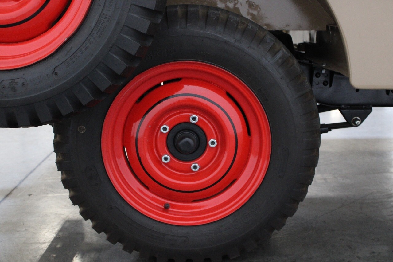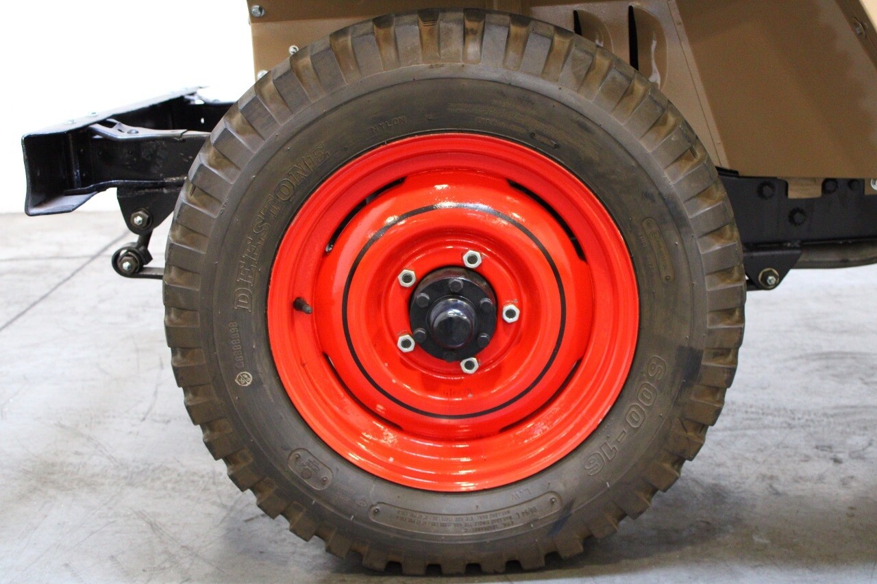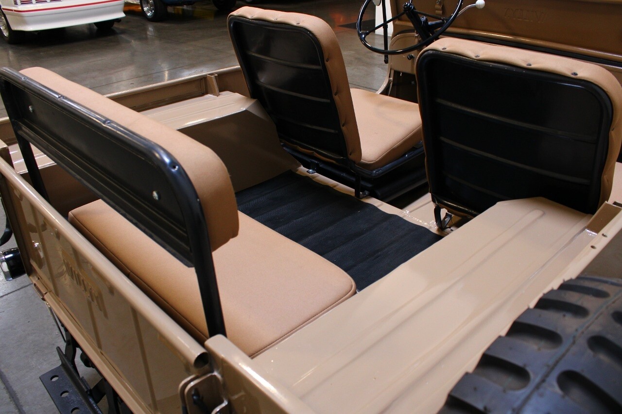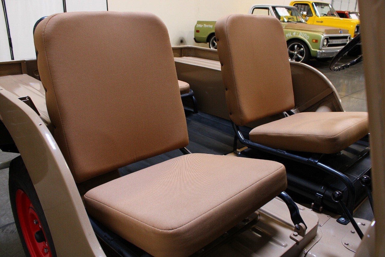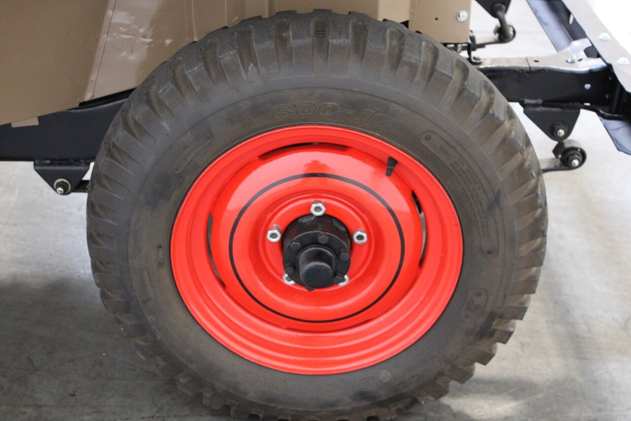 Inside, the harvest tan canvas interior continues the theme. The seats and interior details have been thoughtfully designed to provide interior simplicity while maintaining the vehicle's vintage charm. The simplicity and functionality of the interior design reflect the practical and rugged nature of the Willys CJ2A, a vehicle originally built to handle a variety of terrains and tasks.