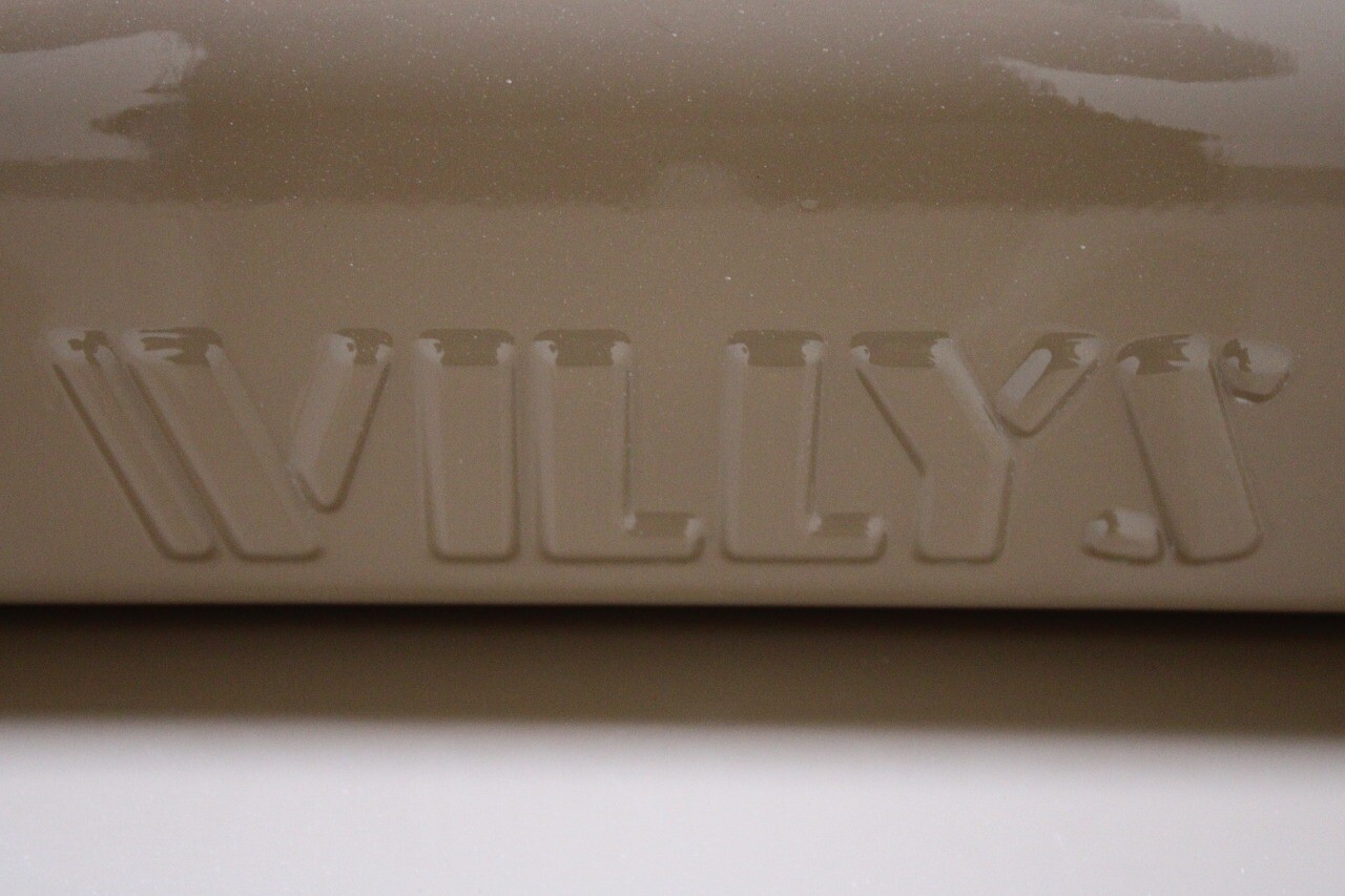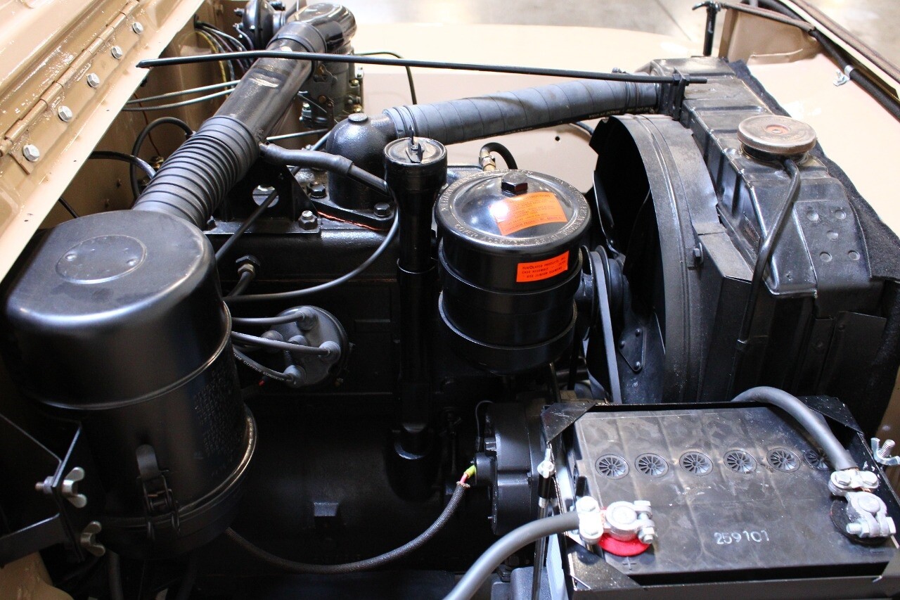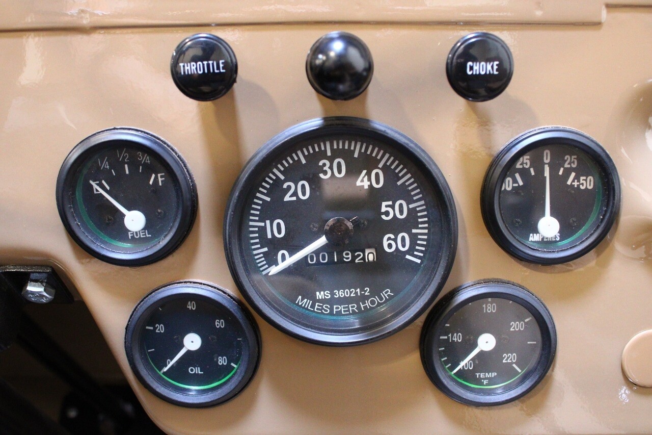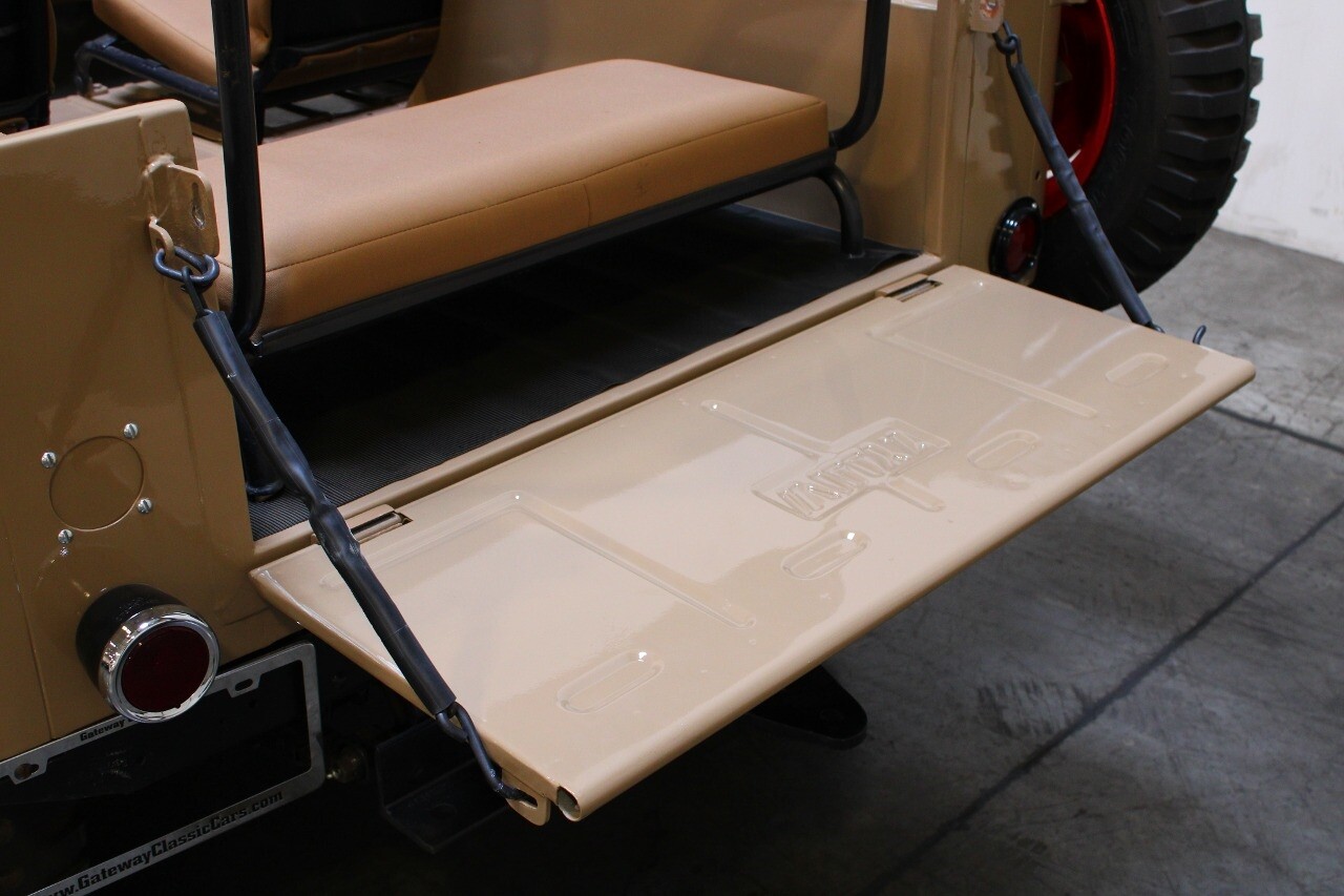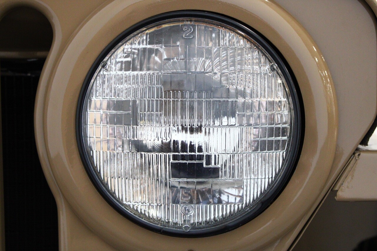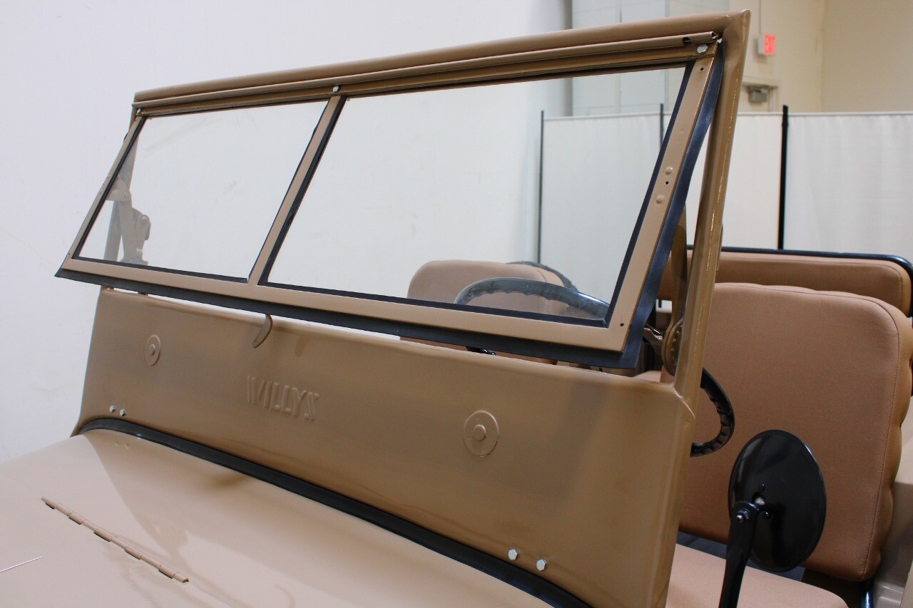 Inside, the harvest tan canvas interior continues the theme. The seats and interior details have been thoughtfully designed to provide interior simplicity while maintaining the vehicle's vintage charm. The simplicity and functionality of the interior design reflect the practical and rugged nature of the Willys CJ2A, a vehicle originally built to handle a variety of terrains and tasks.