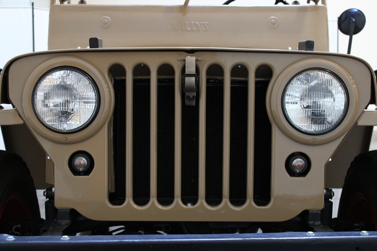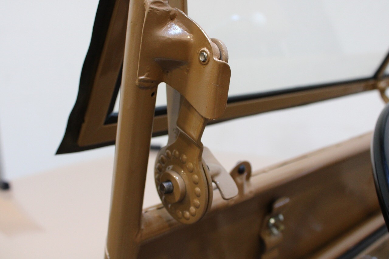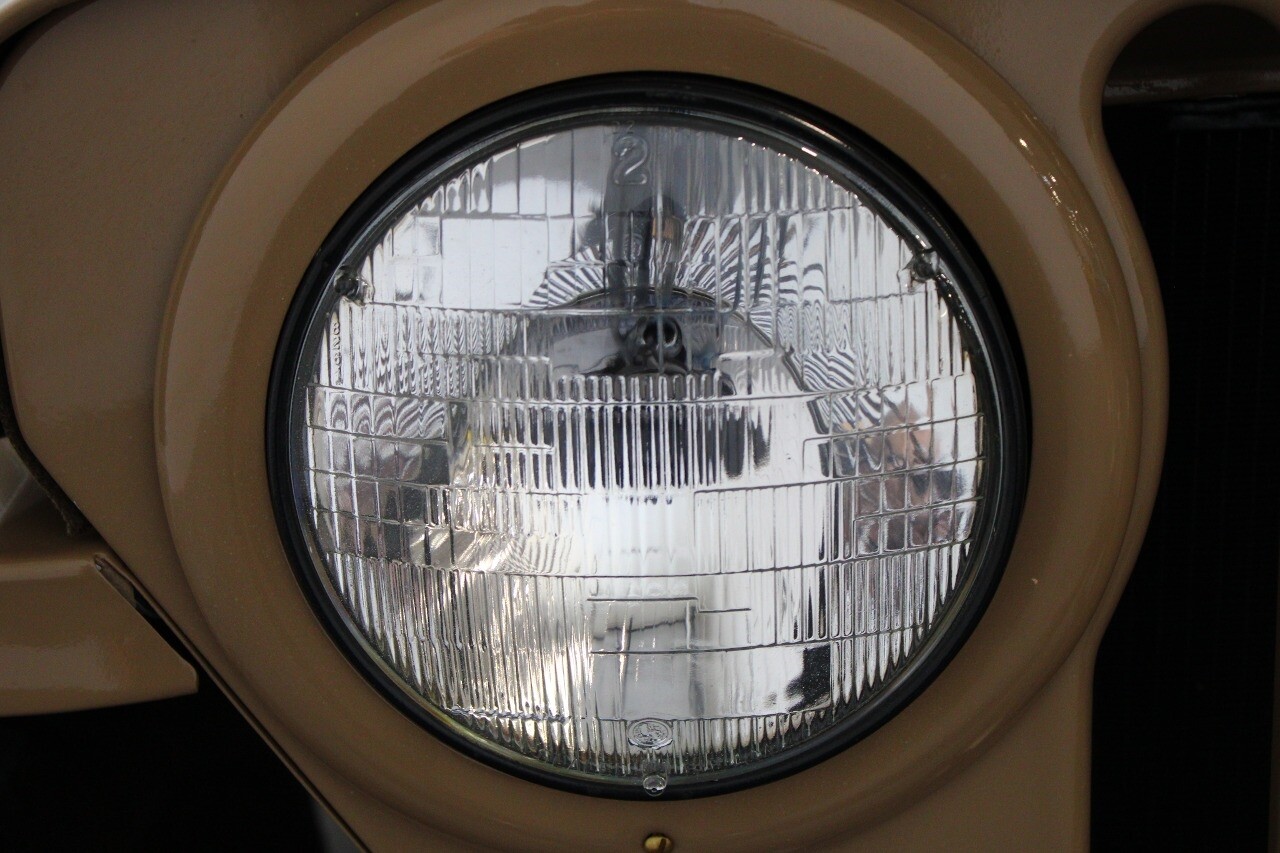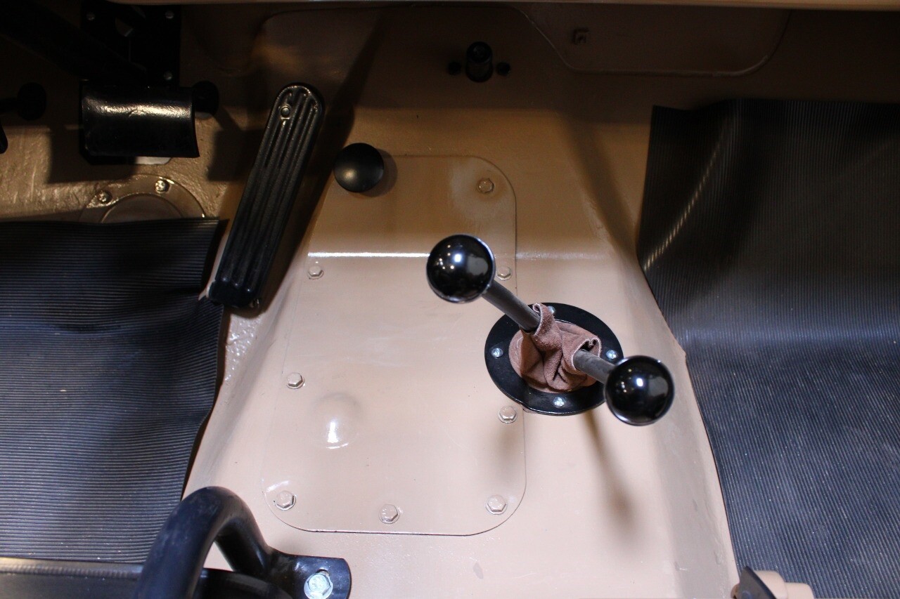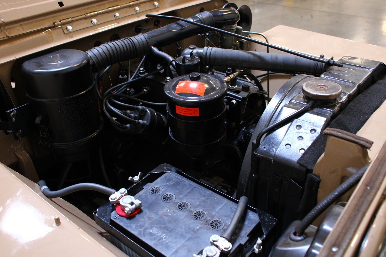 Inside, the harvest tan canvas interior continues the theme. The seats and interior details have been thoughtfully designed to provide interior simplicity while maintaining the vehicle's vintage charm. The simplicity and functionality of the interior design reflect the practical and rugged nature of the Willys CJ2A, a vehicle originally built to handle a variety of terrains and tasks.
