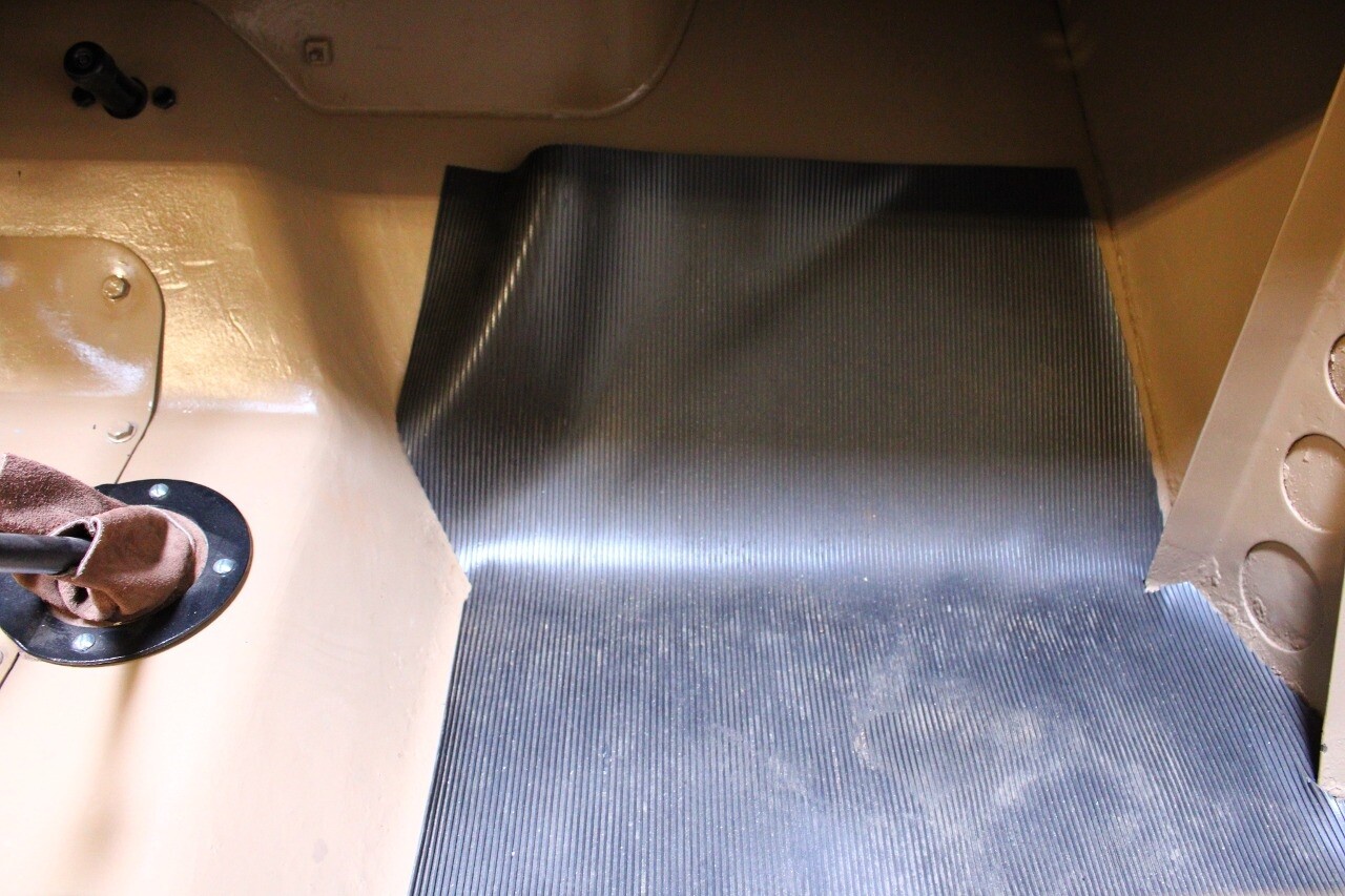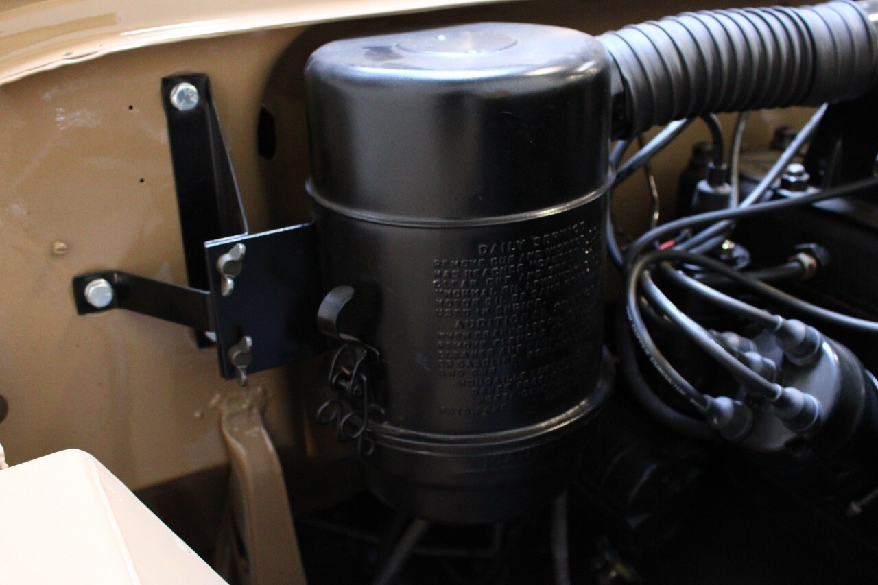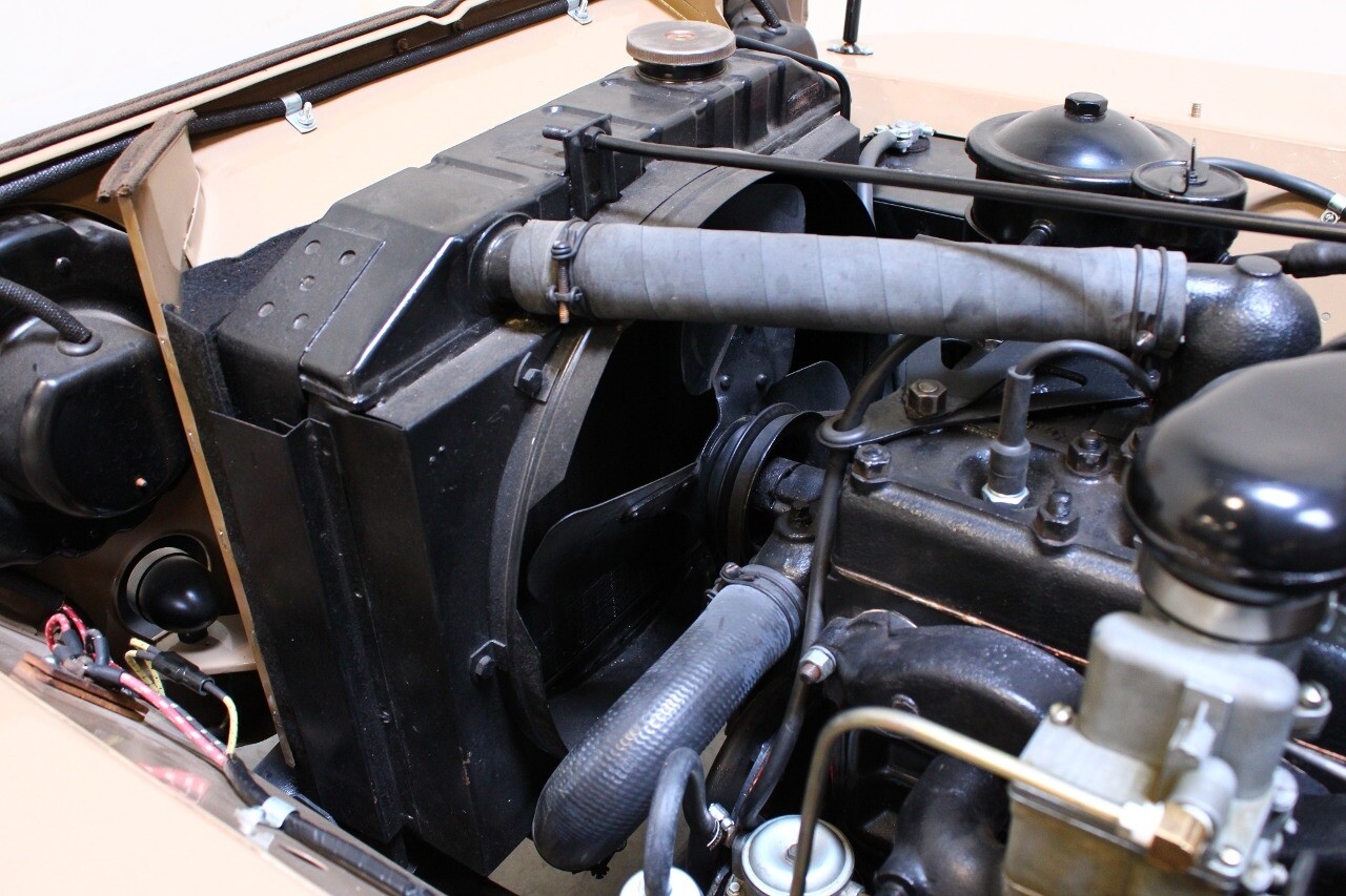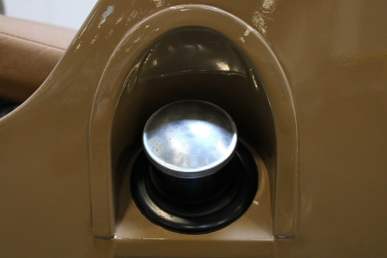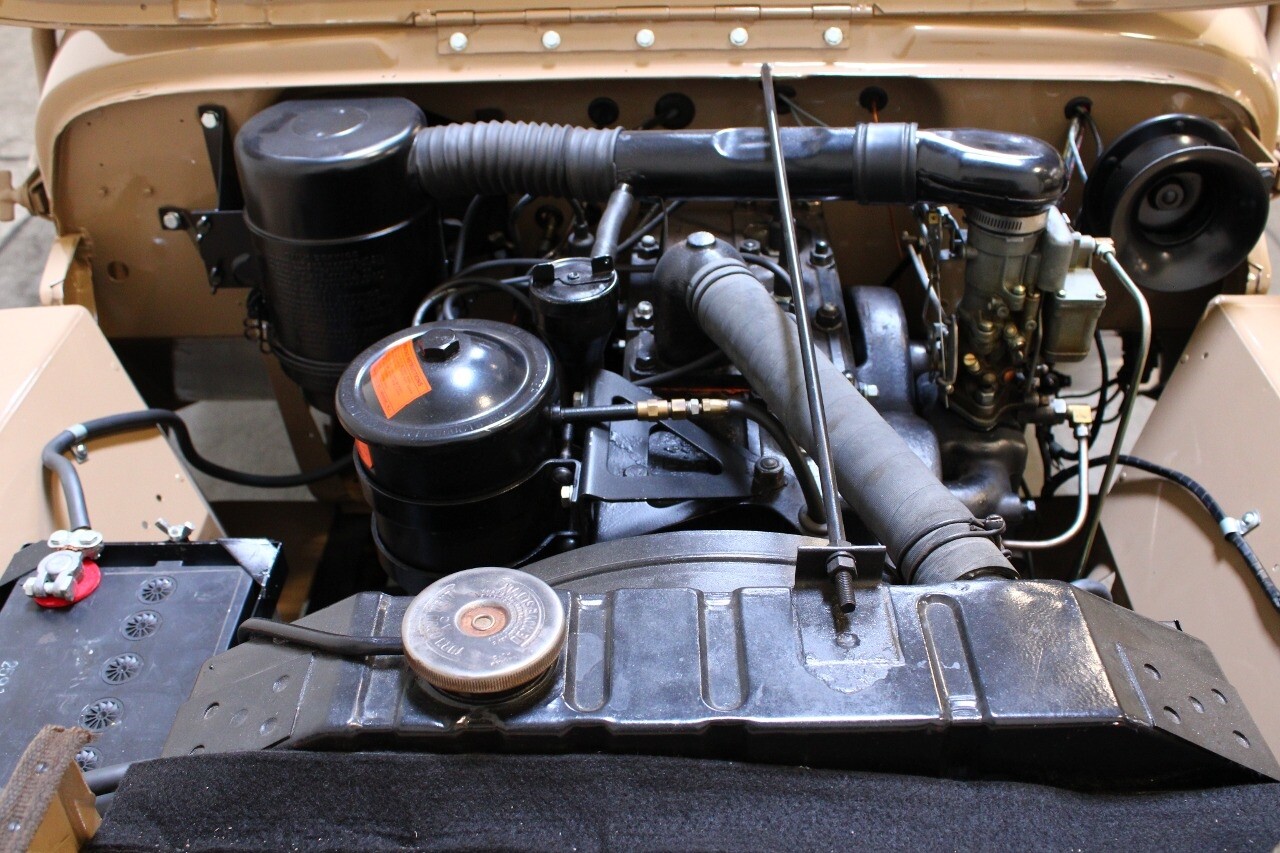 Inside, the harvest tan canvas interior continues the theme. The seats and interior details have been thoughtfully designed to provide interior simplicity while maintaining the vehicle's vintage charm. The simplicity and functionality of the interior design reflect the practical and rugged nature of the Willys CJ2A, a vehicle originally built to handle a variety of terrains and tasks.