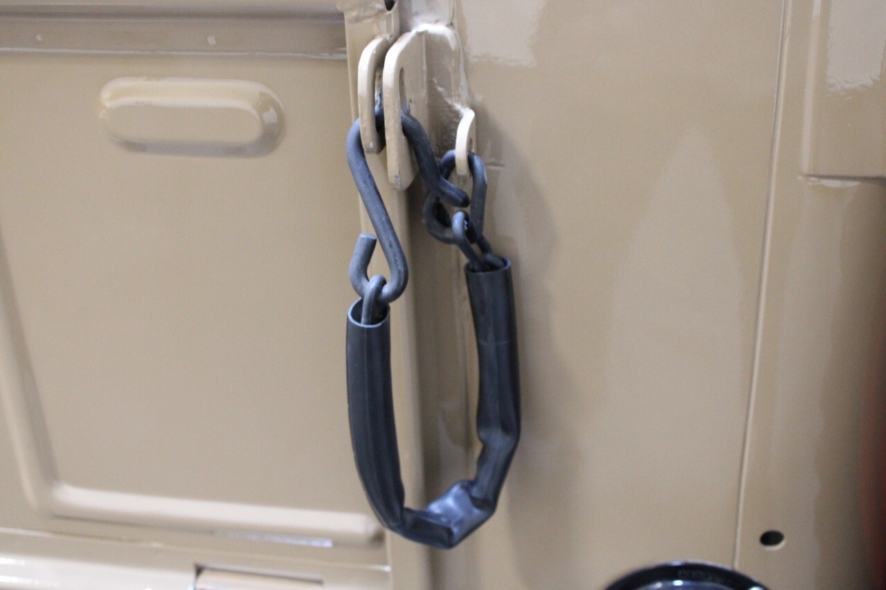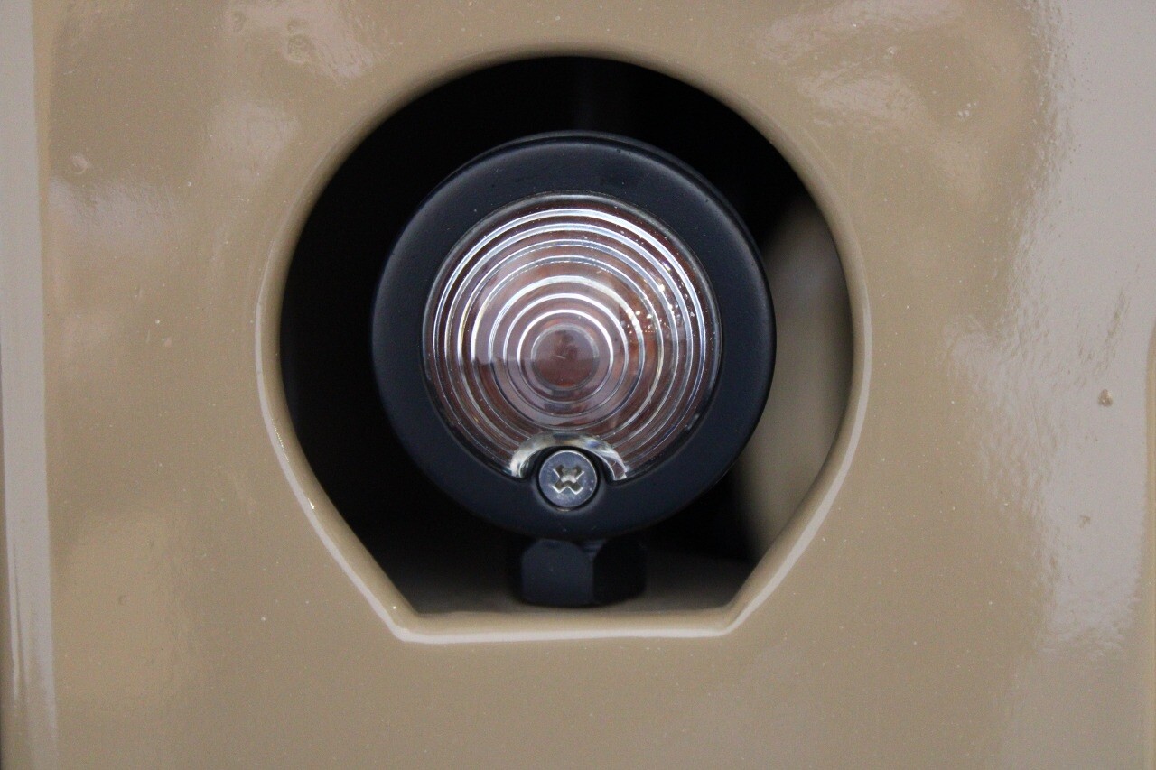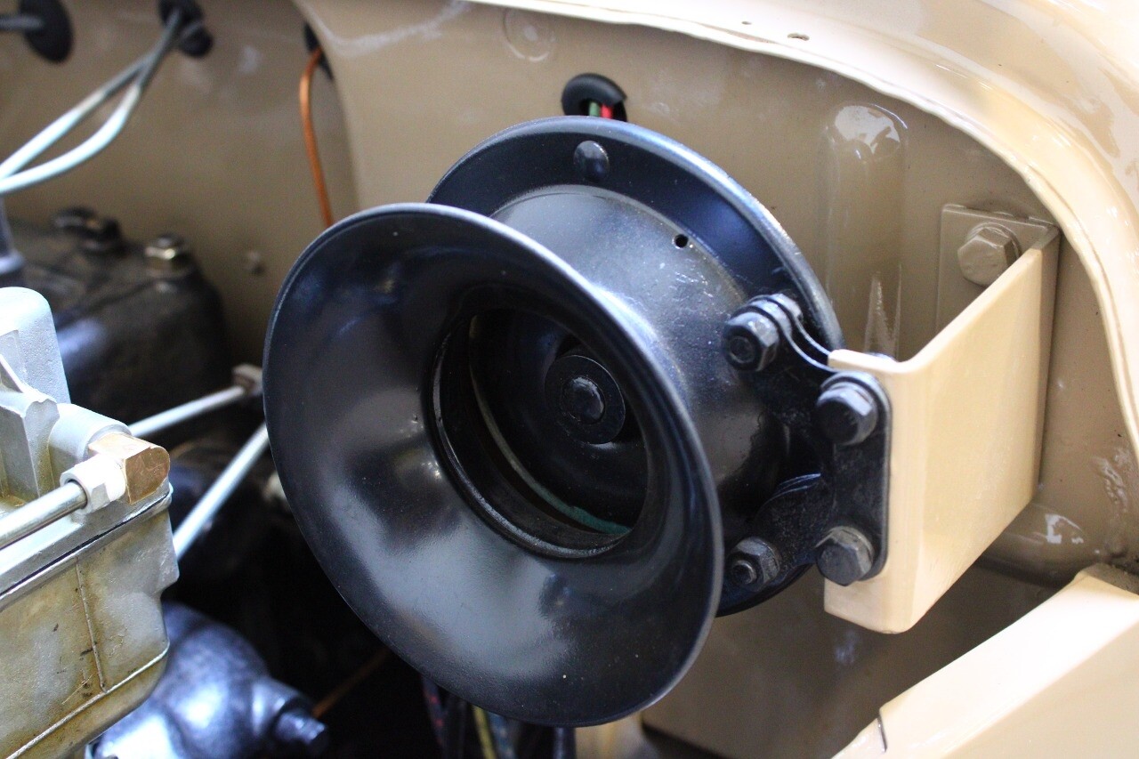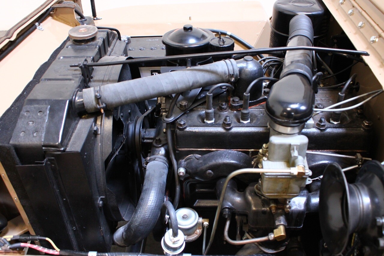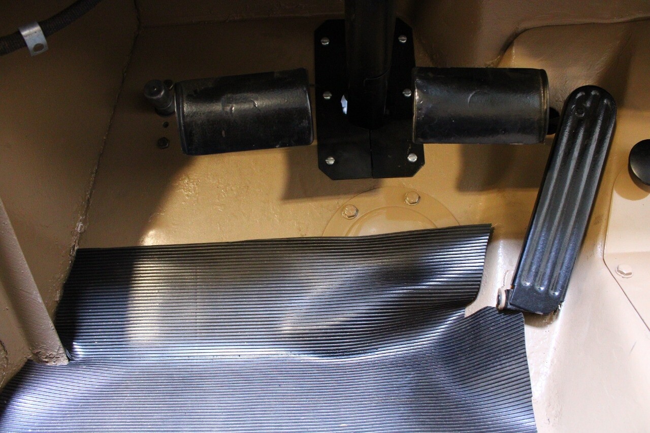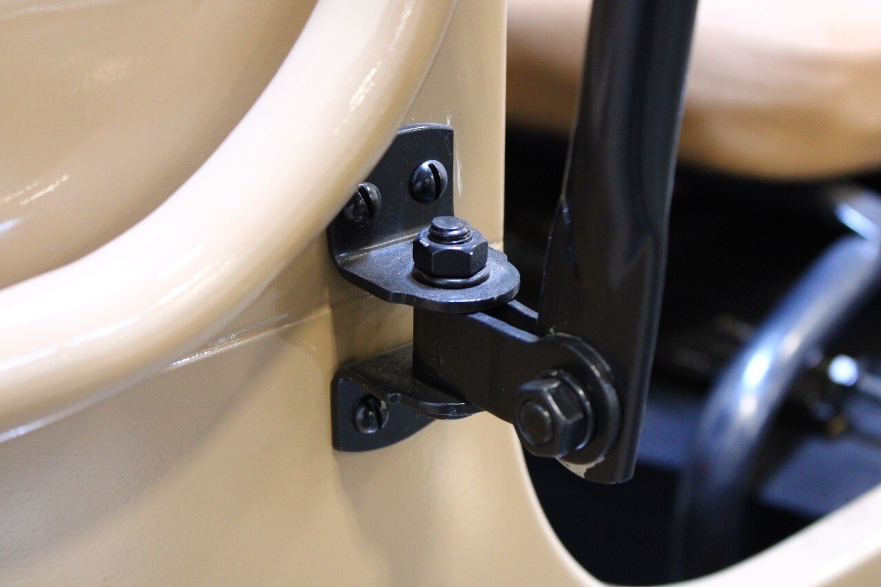 Inside, the harvest tan canvas interior continues the theme. The seats and interior details have been thoughtfully designed to provide interior simplicity while maintaining the vehicle's vintage charm. The simplicity and functionality of the interior design reflect the practical and rugged nature of the Willys CJ2A, a vehicle originally built to handle a variety of terrains and tasks.