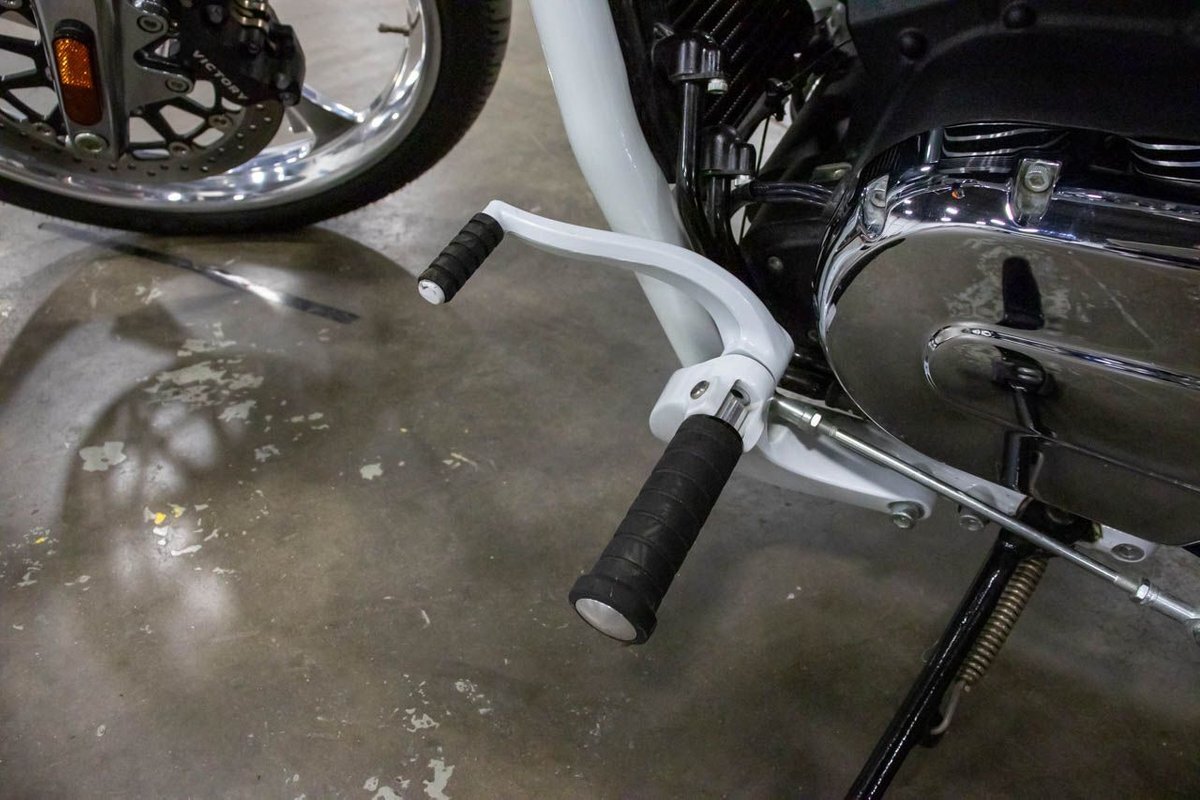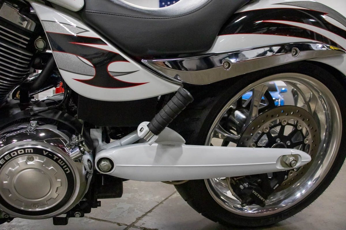 In 2003, Victory introduced the Vegas. The Vegas was designed by Victory designer Michael Song and offered a totally new chassis design. The Freedom engine carried forward from the TC, but the rest of the bike incorporated new features. The Vegas Low has a 1 in (25 mm) lower seat, repositioned foot pegs, and handlebars 2 in (51 mm) further back than the regular Vegas model. Debuting in 2006, the Jackpot is, in Victory's own words, an "extreme custom." It features the 100 cu in (1,600 cc) Freedom V-Twin engine and 6-speed transmission (later bikes feature the 106 cu in), a 250 mm rear tire, a color-matched frame, and extensive custom styling with bold paint schemes. It is designed to be Victory's top-of-the-line custom.
