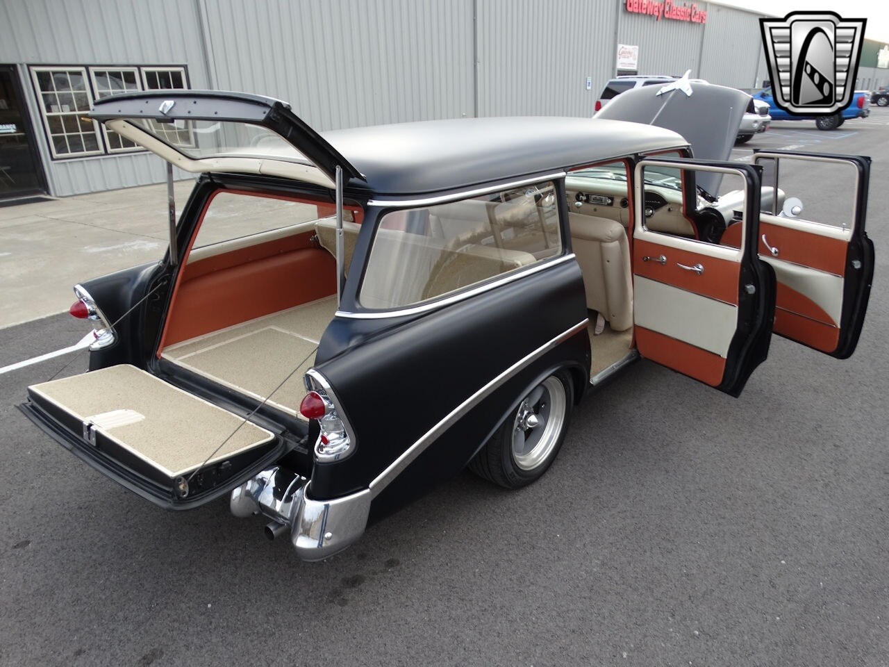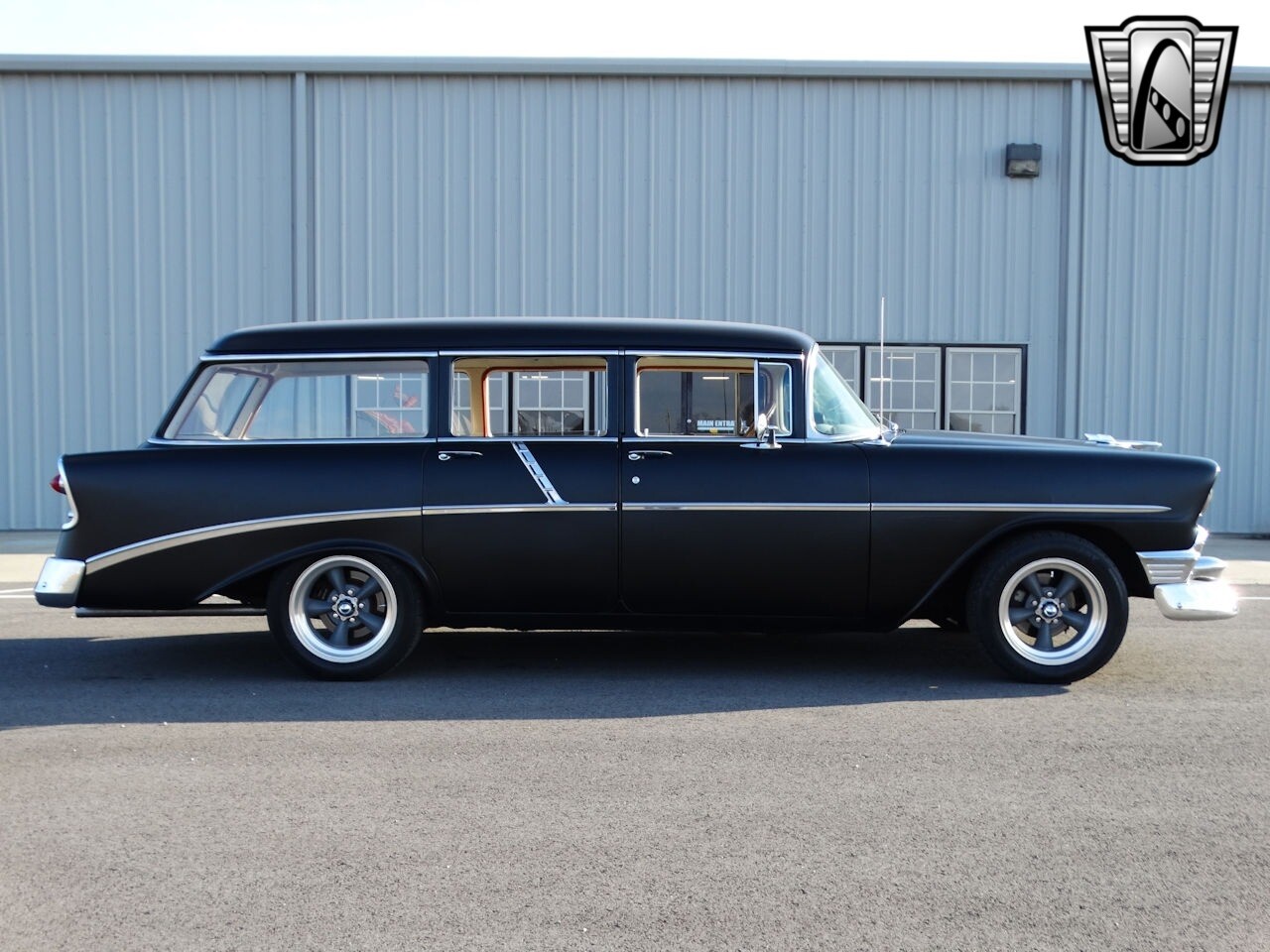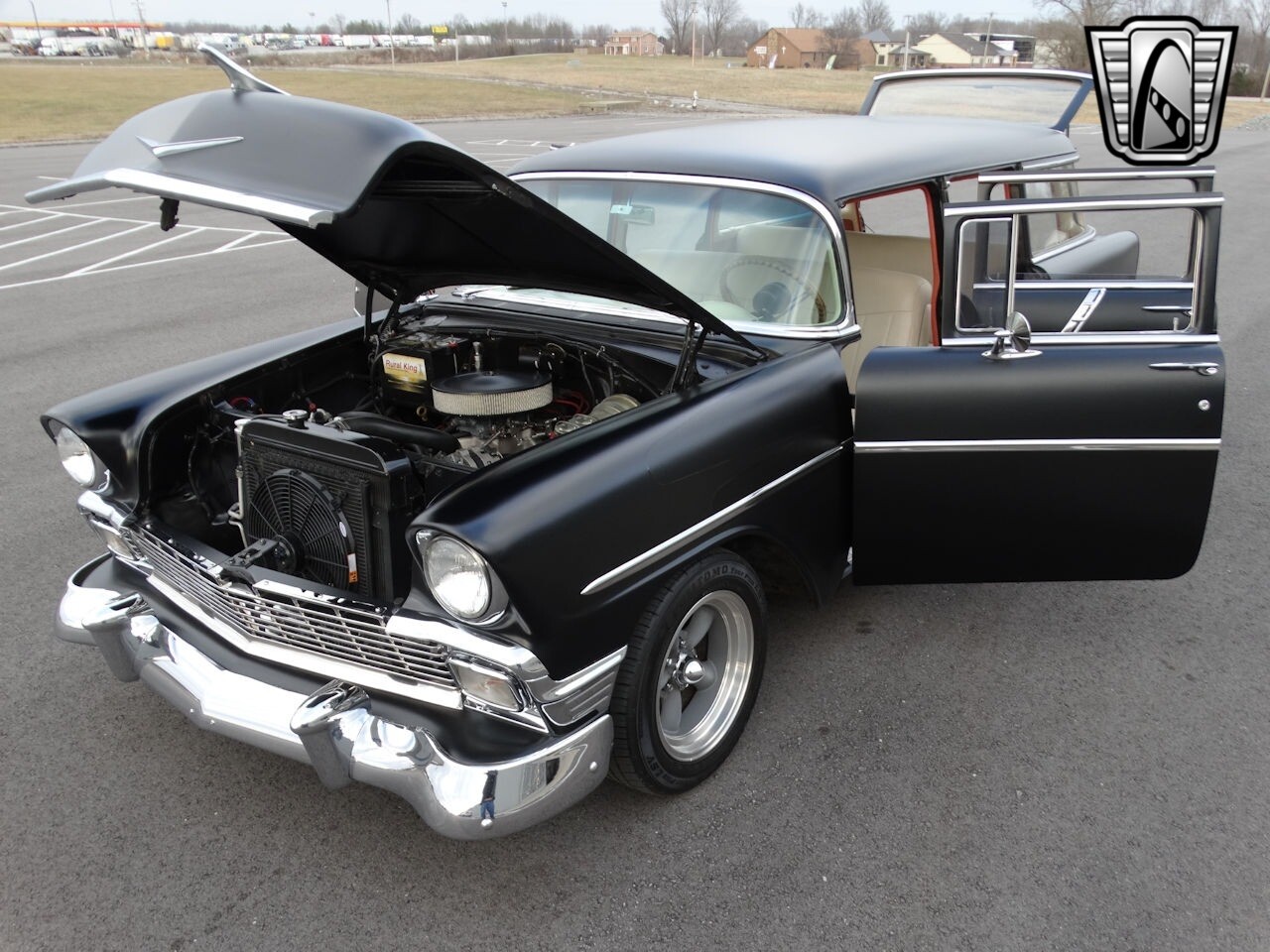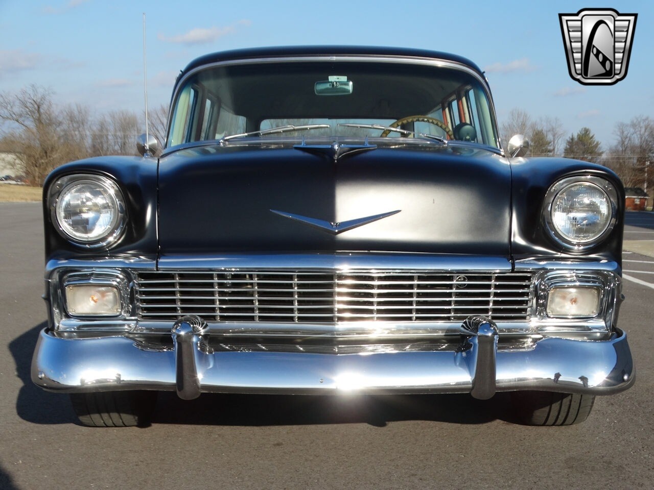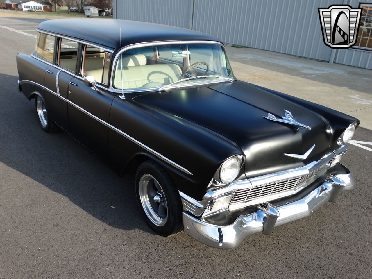 Introducing the 1956 Chevrolet 210 Townsman Wagon, a classic beauty that combines vintage charm with modern comfort. This iconic vehicle is presented in a striking matte black exterior color that exudes an air of sophistication and elegance. The color not only enhances the car's timeless design but also adds a touch of modernity to its overall appeal.