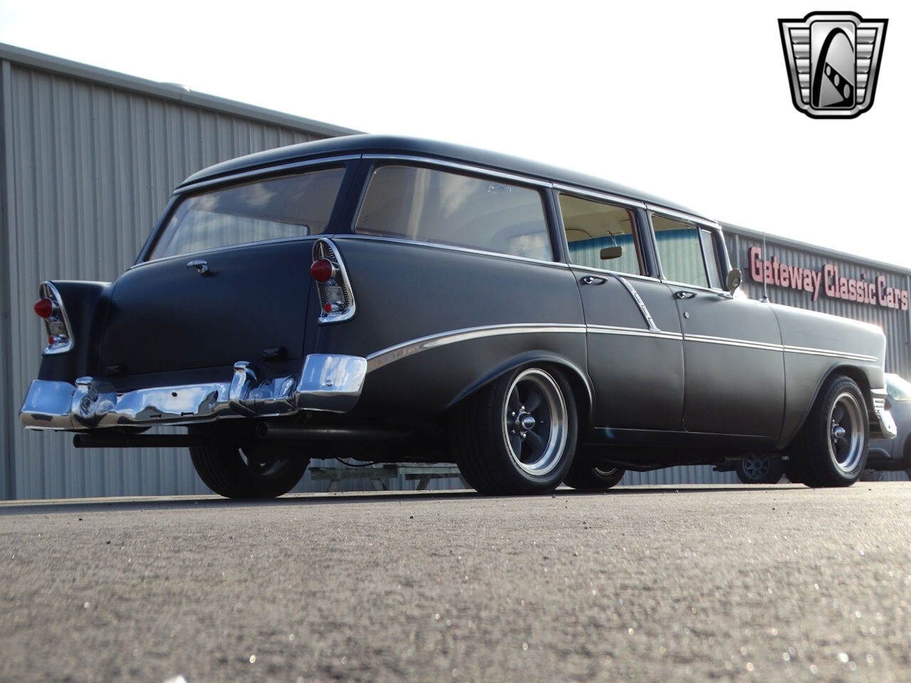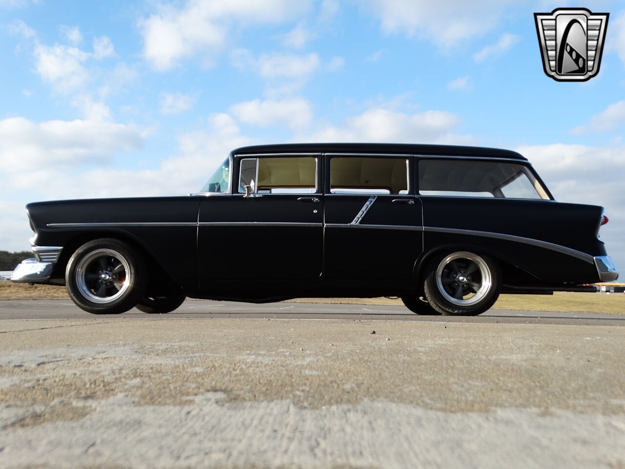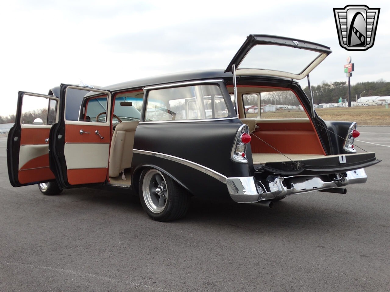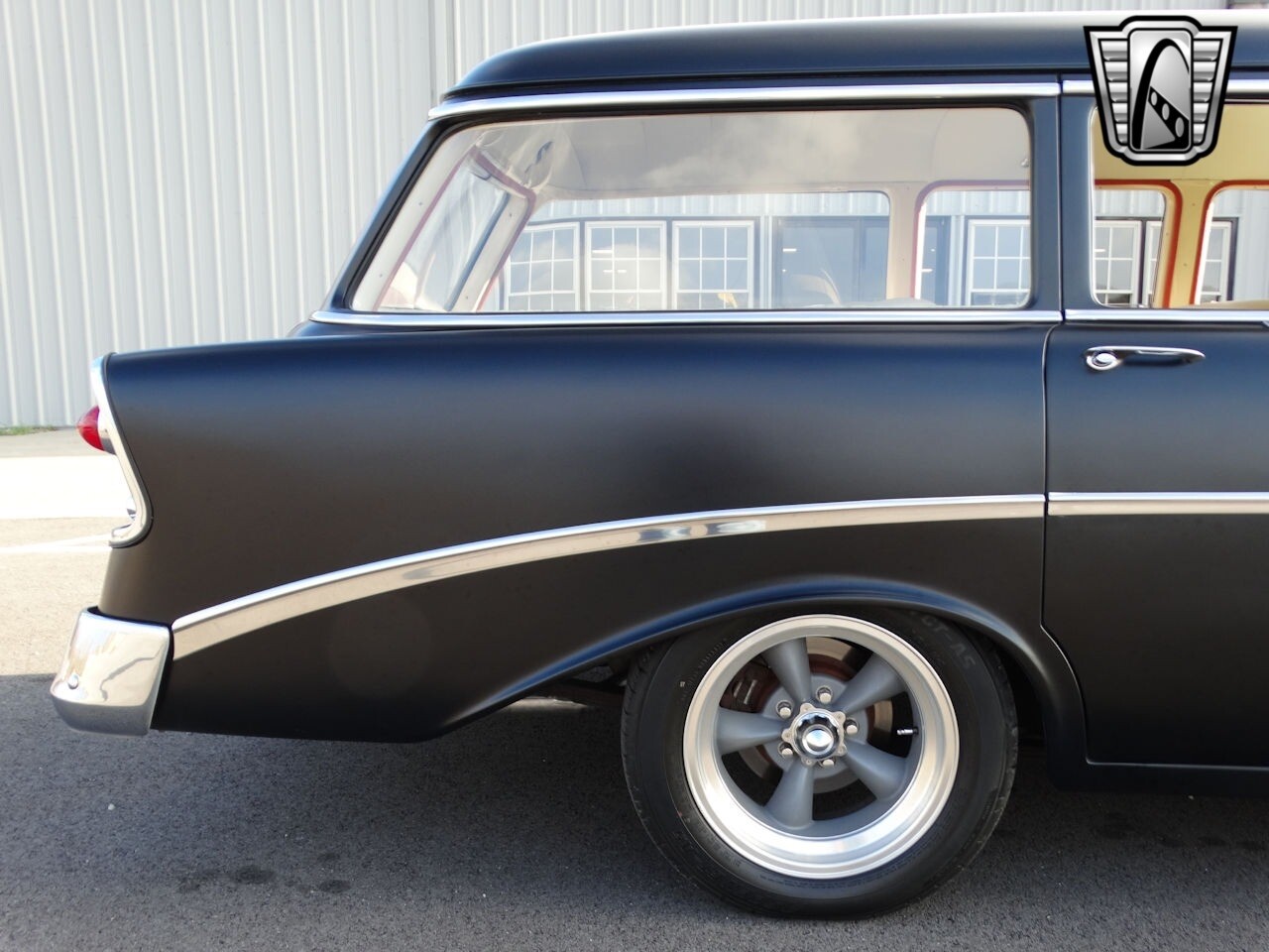 Introducing the 1956 Chevrolet 210 Townsman Wagon, a classic beauty that combines vintage charm with modern comfort. This iconic vehicle is presented in a striking matte black exterior color that exudes an air of sophistication and elegance. The color not only enhances the car's timeless design but also adds a touch of modernity to its overall appeal.
