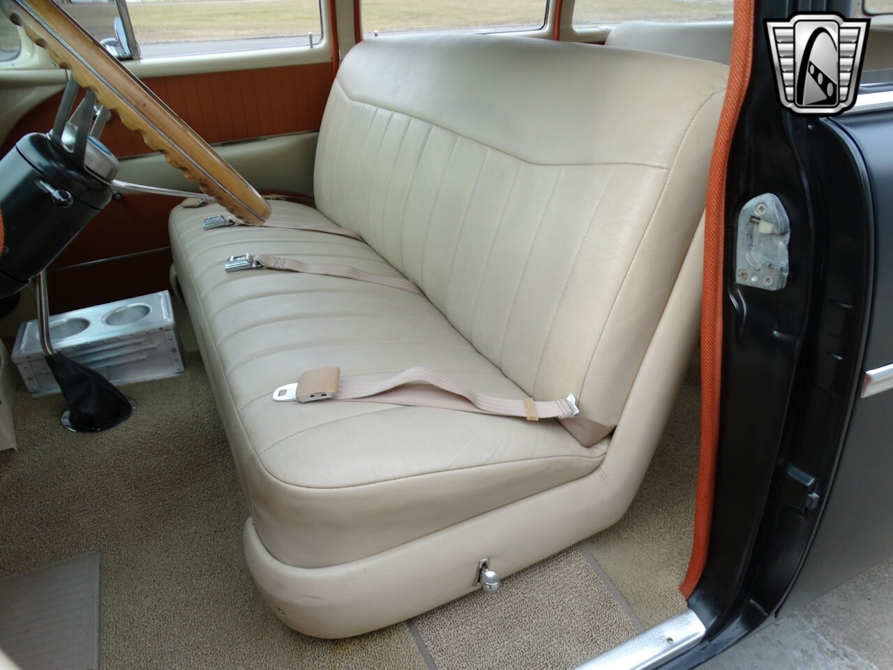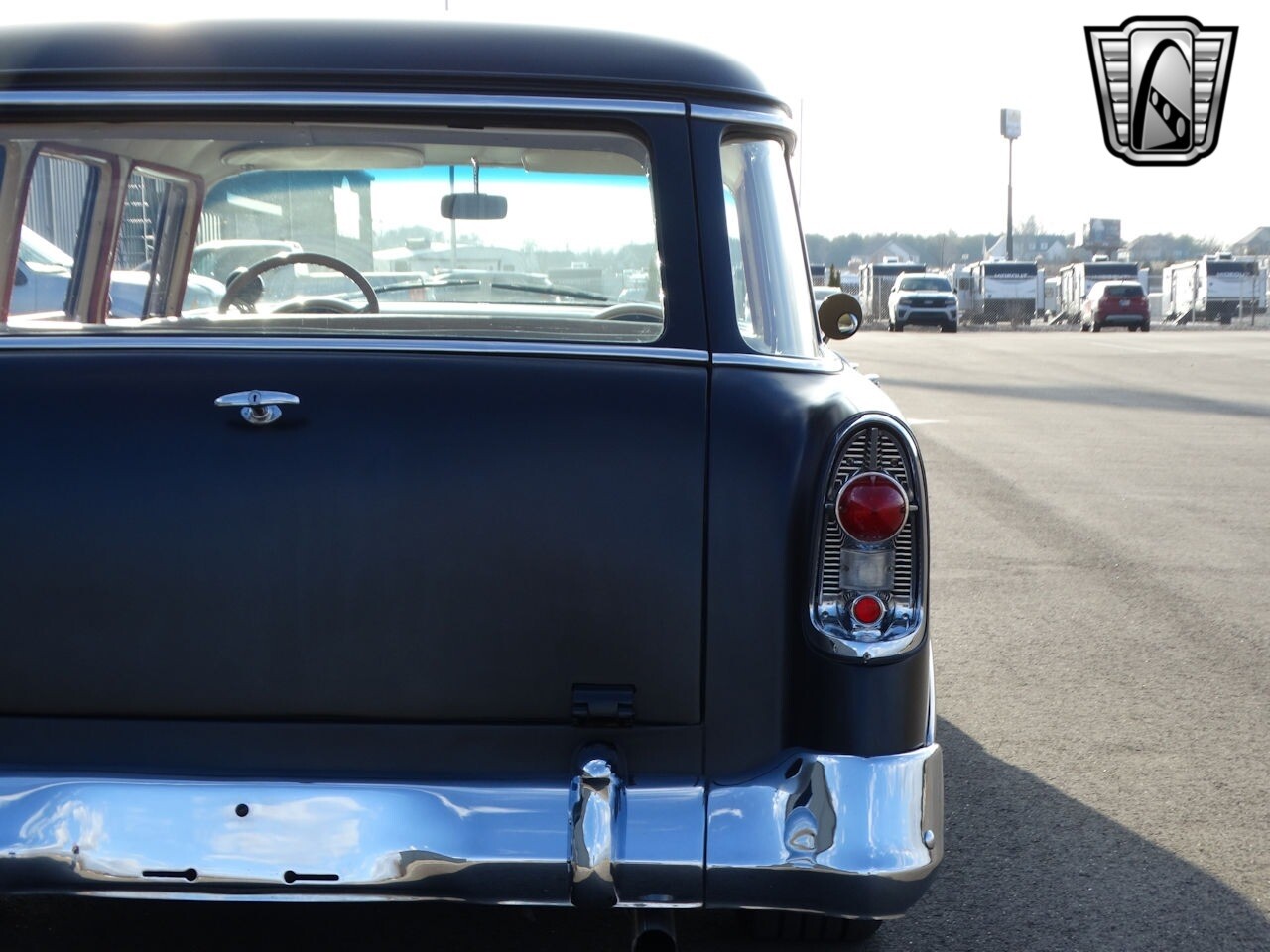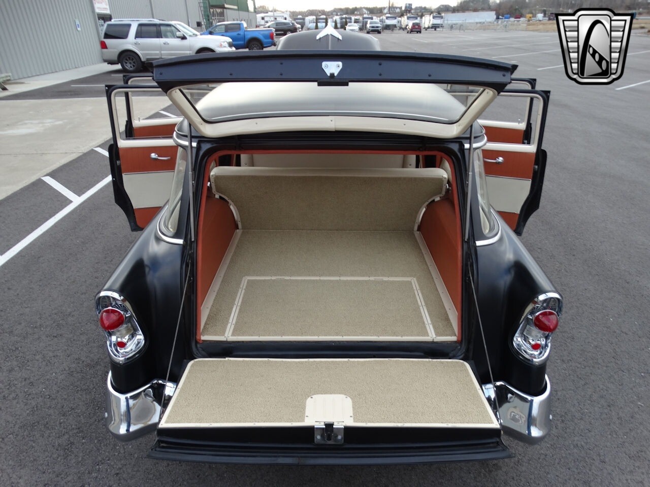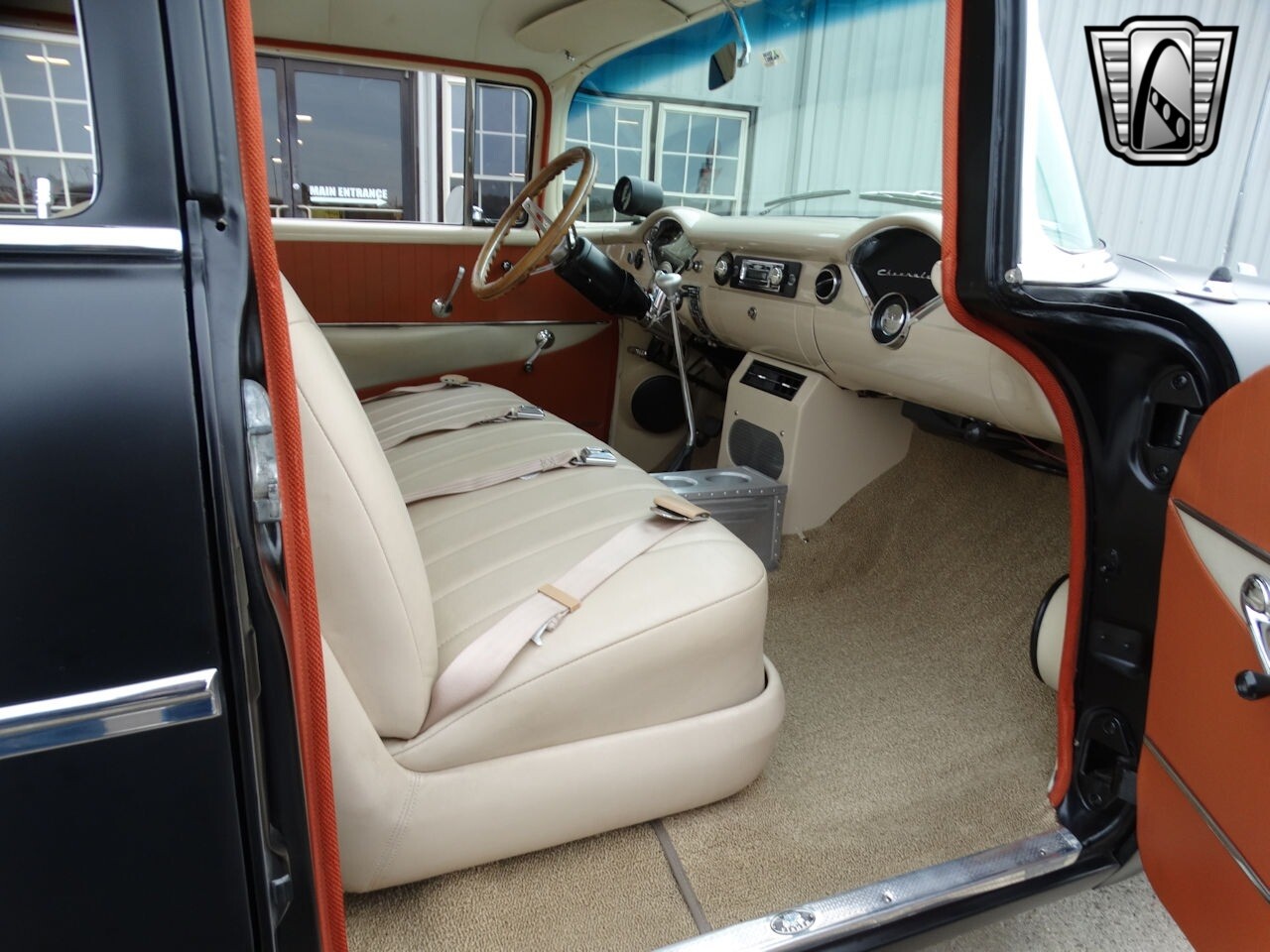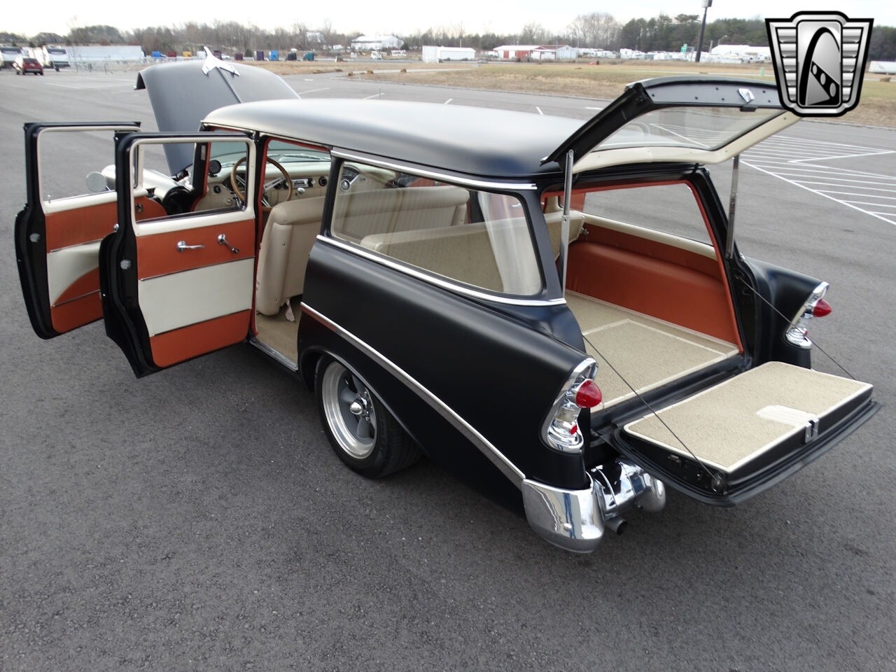 Introducing the 1956 Chevrolet 210 Townsman Wagon, a classic beauty that combines vintage charm with modern comfort. This iconic vehicle is presented in a striking matte black exterior color that exudes an air of sophistication and elegance. The color not only enhances the car's timeless design but also adds a touch of modernity to its overall appeal.