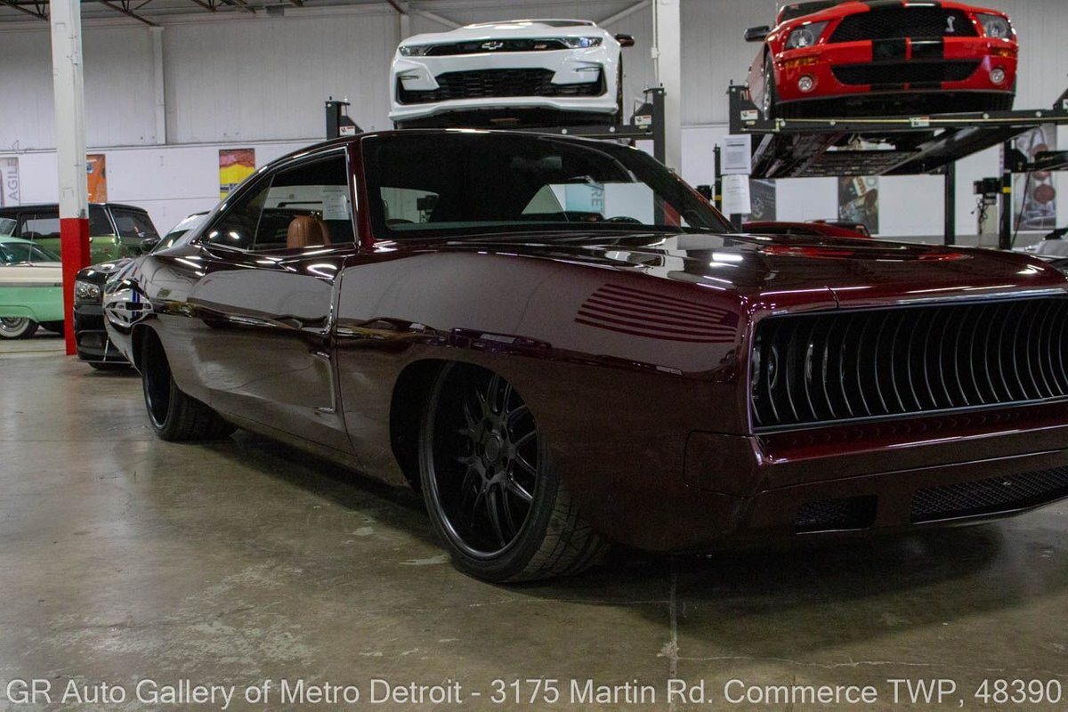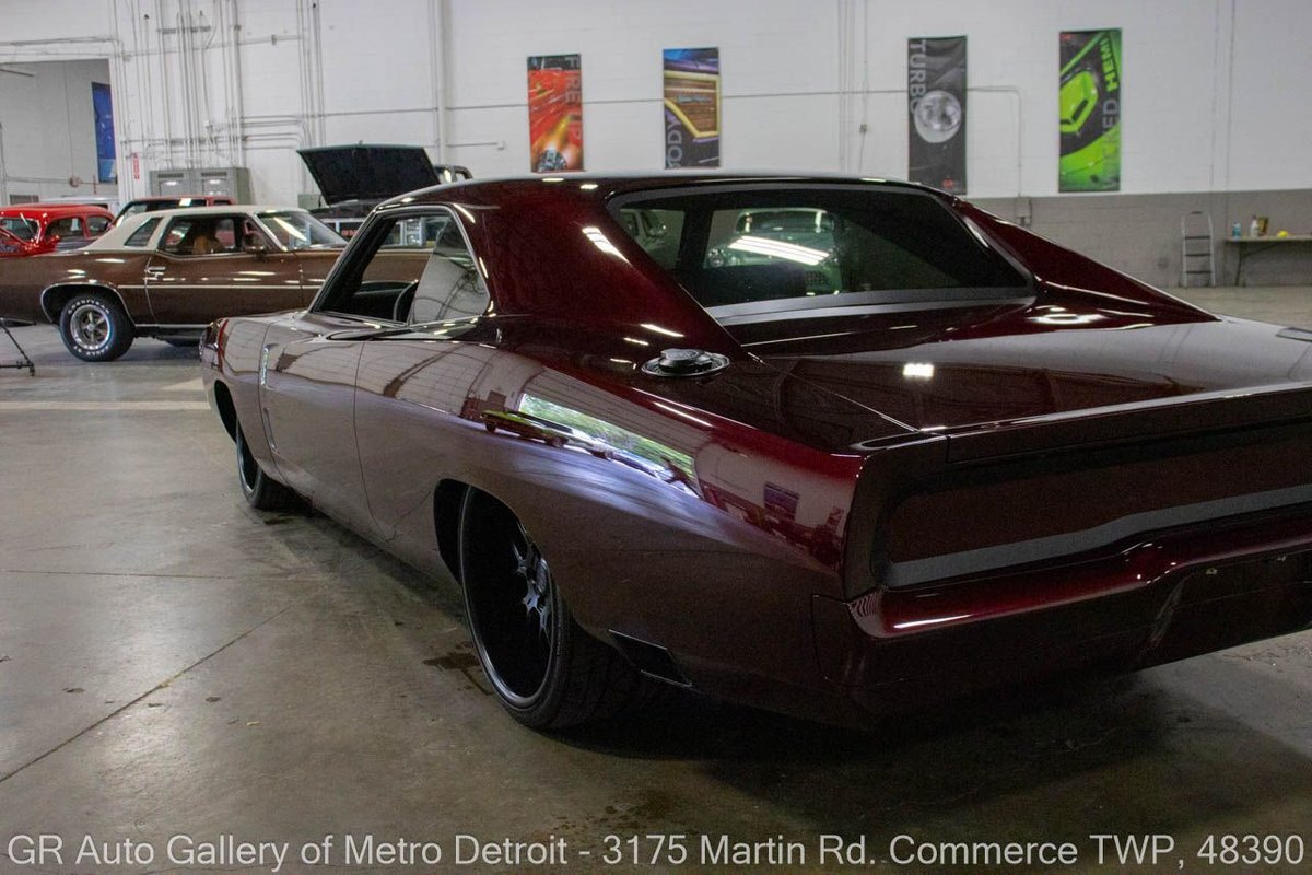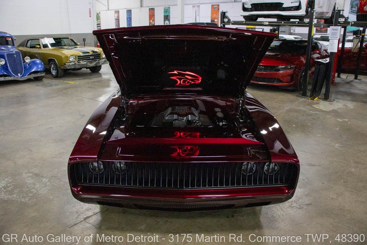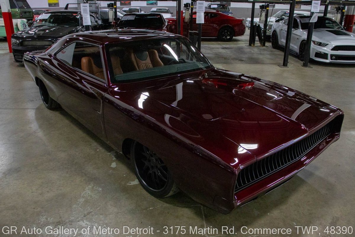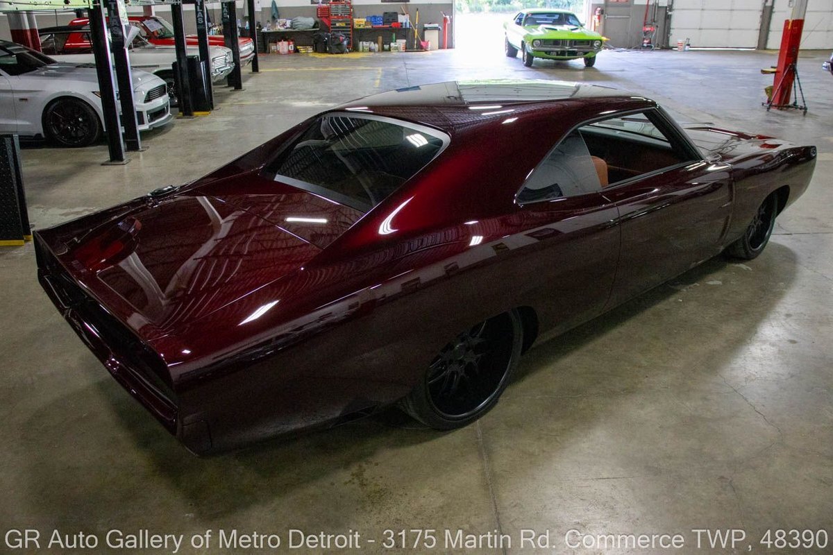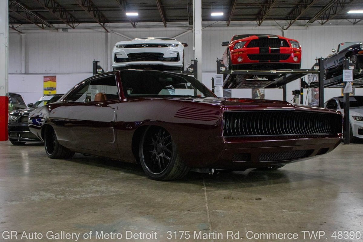 GR Auto Gallery is excited to offer this one-of-a-kind custom 1968 Dodge Charger for your consideration. This Charger features a powerful 6.2 Liter supercharged V8 Hellcat "Hellcrate" motor, producing an impressive 707 horsepower, paired with a 4L80E automatic transmission and Currie rear end. The Brandi Wine Candy metallic exterior pairs beautifully with the Cinnamon leather interior. This Charger boasts an array of custom features including Edelbrock EFI fuel pressure regulators, derale performance frame rail cooler, digital guard dawg g2o keyless push to start, ride tech single adjustable coil over shocks and springs, stainless braided brake hoses and calipers, steel and brass brake fittings for calipers and hard lines, cross-drilled and slotted rotors, Gen 3 hemi engine mounts (5.7/6.1/6.2/6.4), Nu-relics power windows, Kenwood aftermarket stereo, Bwoody performance charger heat exchanger, Howe precision ball joints, aftermarket LED light side steps/under the hood, aftermarket back up camera, sequential tail lights, exhaust valve cut-offs, E-level accu air ride remote. This Charger received a top-tier, no-penny-spared build that started in 2019, and took 2 years to get it on the road. The build was completed by Jesse's Classics and Customs. Every nut and bolt is custom on this vehicle, it has won countless awards, debuted at Sema in 2022, and was endorsed by Mark Worman Graveyard cars. You will not find another build like this - showing in immaculate condition, show built ready for its new home, with tons of documentation of each piece paired with this vehicle and receipts. Don't miss out on your opportunity to own this masterpiece. Drive this one out of our showroom or have us assist with shipping it to you anywhere in the United States! Don't hesitate to call us with any questions or for more information.