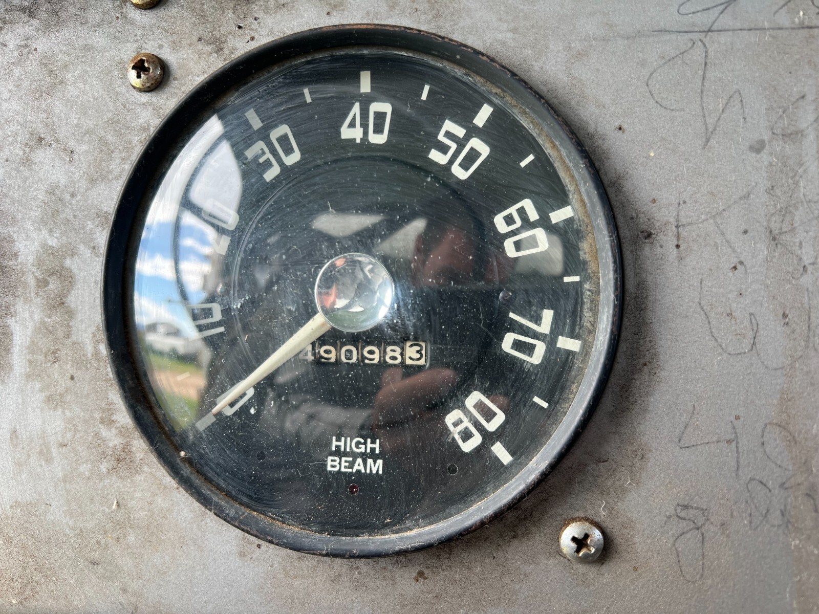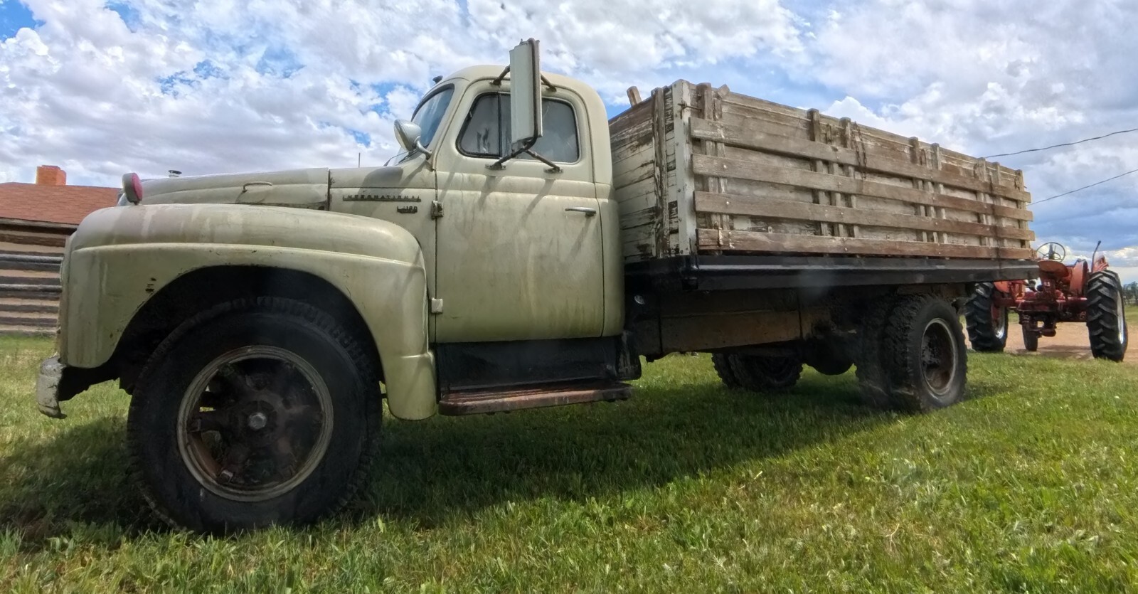 Barn find, solid truck, no rust at all, stored in Wyoming barn for 44 years, last licensed 1987. Windshield has vertical crack in center, does not obstruct vision, driver door window cracked. Engine is free, ran when parked. Gas tanks leaked, and was reason for discontinued service. Used on ranch for livestock, grain, coal, hay and other ranch duties. Five speed + 2 speed rear. Bed is solid, stock racks need some repair, all parts there. Includes spare, lug wrench, and owners manual. Have International logo for passenger side. If you like old Binders this is a great one to restore!