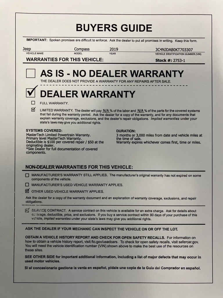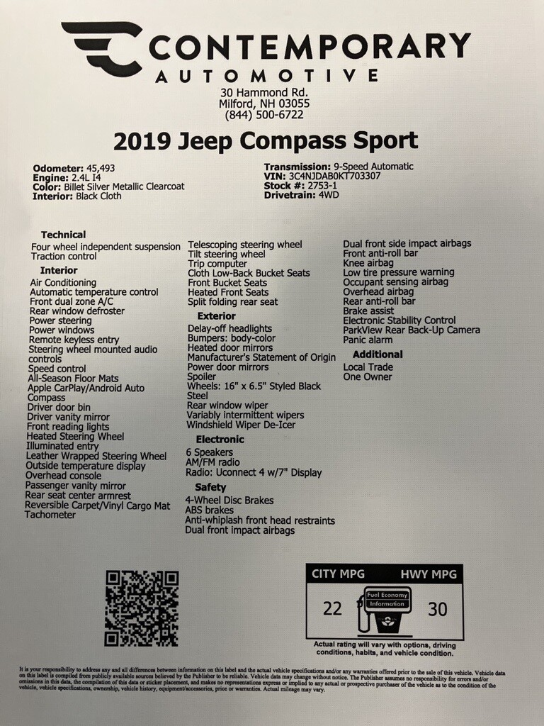 CONTEMPORARY CHRYSLER DODGE JEEP RAM is proud to present you with another True Market Priced Pre-Owned Vehicle. This 2019 Jeep Compass Sport is loaded with the following Factory Options: Cold Weather Group (All-Season Floor Mats, Heated Front Seats, Heated Steering Wheel, Leather Wrapped Steering Wheel, Reversible Carpet/Vinyl Cargo Mat, and Windshield Wiper De-Icer), Quick Order Package 27A (DISC), and 4WD Cold Weather Group (All-Season Floor Mats, Heated Front Seats, Heated Steering Wheel, Leather Wrapped Steering Wheel, Reversible Carpet/Vinyl Cargo Mat, and Windshield Wiper De-Icer), Quick Order Package 27A (DISC), 4WD, 3.833 Axle Ratio, 4-Wheel Disc Brakes, 6 Speakers, ABS brakes, Air Conditioning, AM/FM radio, Anti-whiplash front head restraints, Apple CarPlay/Android Auto, Automatic temperature control, Brake assist, Bumpers: body-color, Cloth Low-Back Bucket Seats, Compass, Delay-off headlights, Driver door bin, Driver vanity mirror, Dual front impact airbags, Dual front side impact airbags, Electronic Stability Control, Four wheel independent suspension, Front anti-roll bar, Front Bucket Seats, Front Center Armrest w/Storage, Front dual zone A/C, Front reading lights, Heated door mirrors, Illuminated entry, Knee airbag, Low tire pressure warning, Manufacturer's Statement of Origin, Occupant sensing airbag, Outside temperature display, Overhead airbag, Overhead console, Panic alarm, ParkView Rear Back-Up Camera, Passenger door bin, Passenger vanity mirror, Power door mirrors, Power steering, Power windows, Radio: Uconnect 4 w/7 Display, Rear anti-roll bar, Rear seat center armrest, Rear window defroster, Rear window wiper, Remote keyless entry, Speed control, Split folding rear seat, Spoiler, Steering wheel mounted audio controls, Tachometer, Telescoping steering wheel, Tilt steering wheel, Traction control, Trip computer, Variably intermittent wipers, and Wheels: 16 x 6.5 Styled Black Steel!!