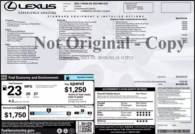 Have a look at this One Owner, Loaded, Extra Clean, Adult Owned, Serviced, & Non Smoker 2021 Lexus RX 350 FWD SUV with Caviar Exterior Paint over Tan Interior Upholstery. This Lexus is Equipped with a 295 Horsepower 3.5L V6 Engine Coupled with 8-Speed Automatic Transmission.