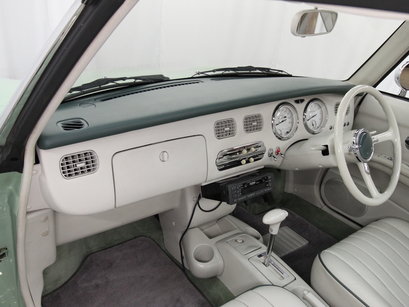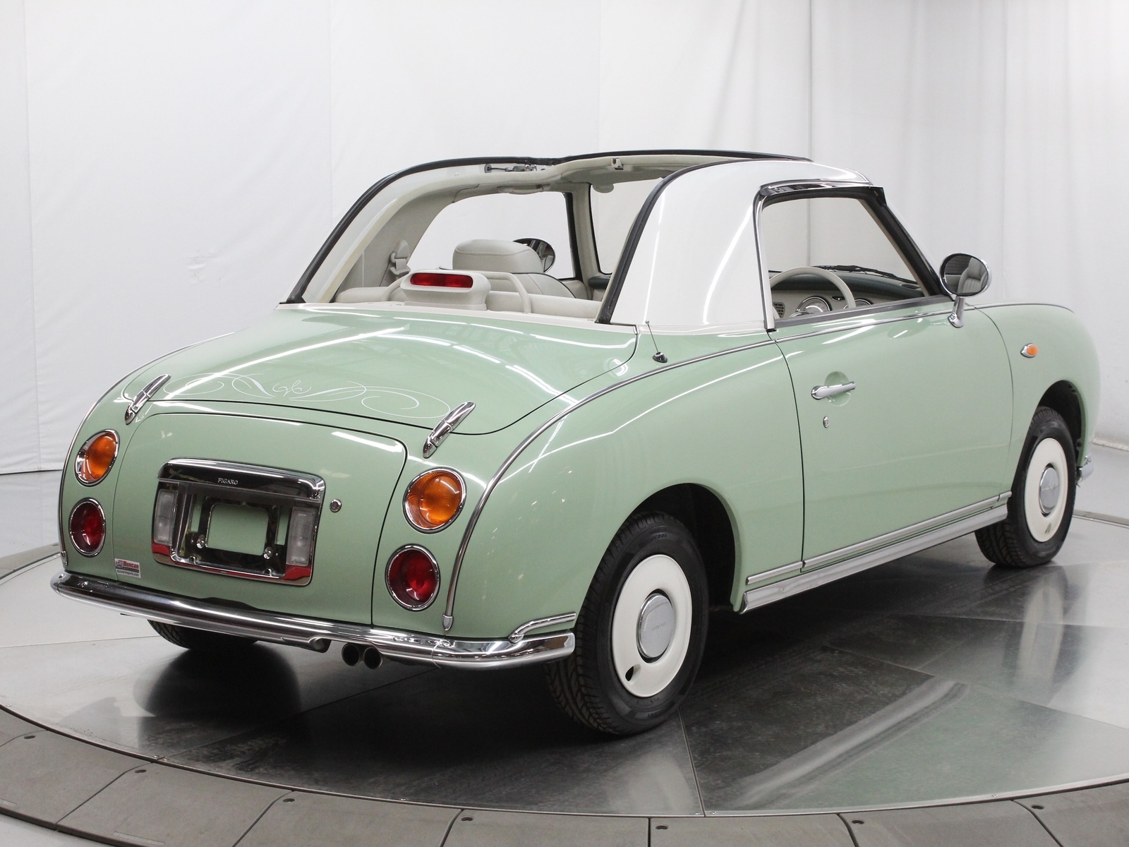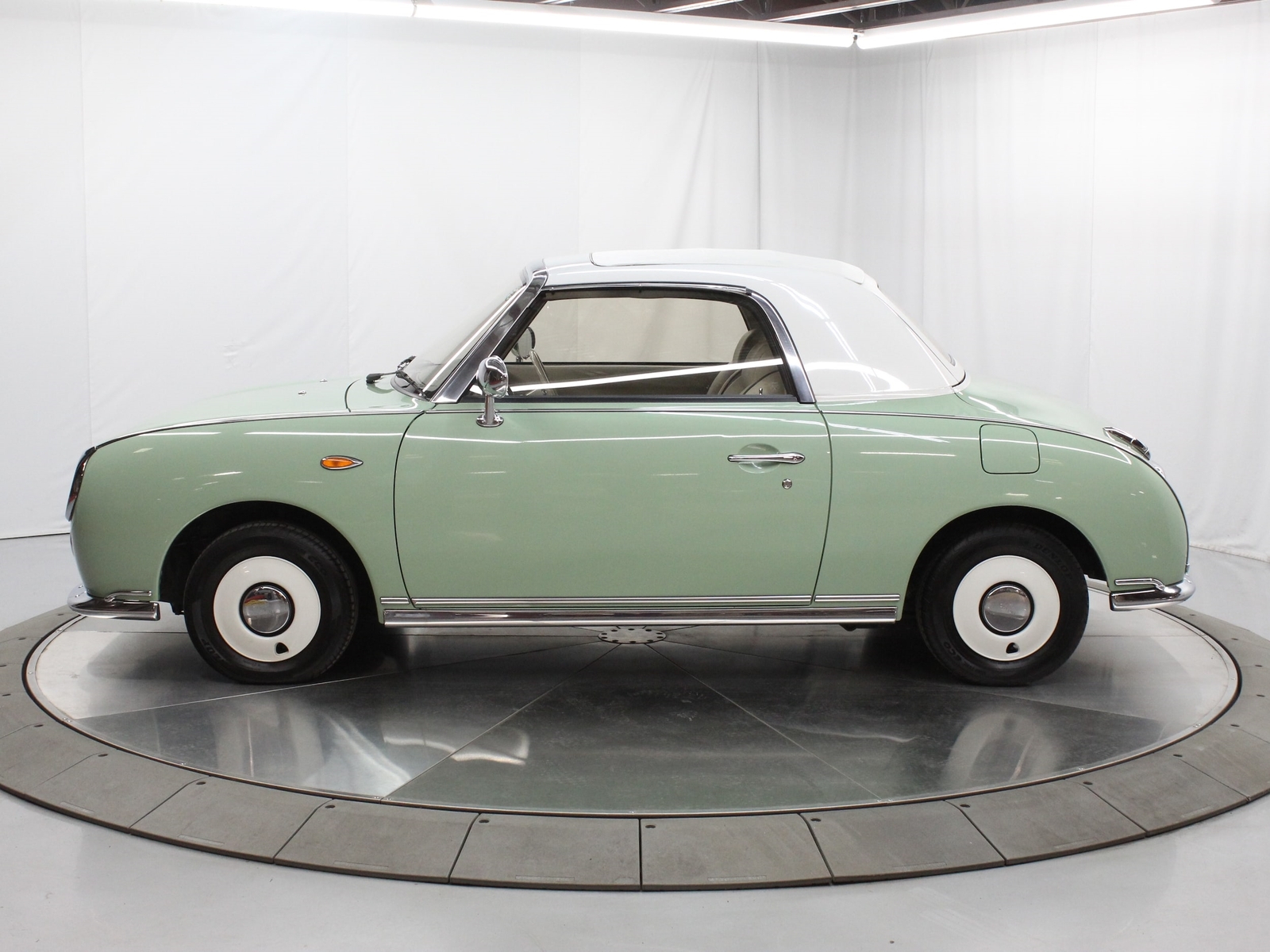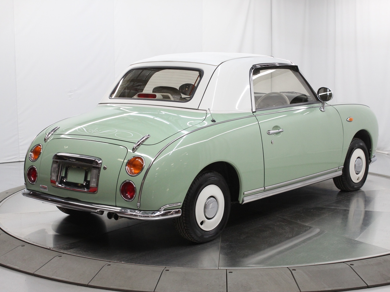 23,981 Kilometers The Nissan Figaro was manufactured in Japan, and the concept debuted at the 1989 Tokyo Motor Show, receiving favorable reviews. Production began in 1991, and there were only 20,073 units ever built all of which were sold exclusively through Nissan Cherry stores in Japan. This “Pike Car” drew inspiration from the art-deco fashion of the 1930’s, combining it with state-of-the-art technology of the 1990’s. Each unit comes with standard features such as ivory leather seats with contrasting piping, soft-feel paint on the dashboard, cd/cassette player, and chrome interior accents. This fixed-profile convertible is powered by a 1.0-liter turbocharged engine paired with a 3-speed automatic transmission, producing 75 horsepower and 78 lb-ft of torque. Finished in only four different colors, the paint choices represented the four seasons: Emerald Green for Spring, Pale Aqua for Summer, Topaz Mist for Autumn, and Lapis Grey for Winter. Third party pre-purchase inspections are welcomed and encouraged. All vehicles sold by Duncan come with a clean U.S. title.