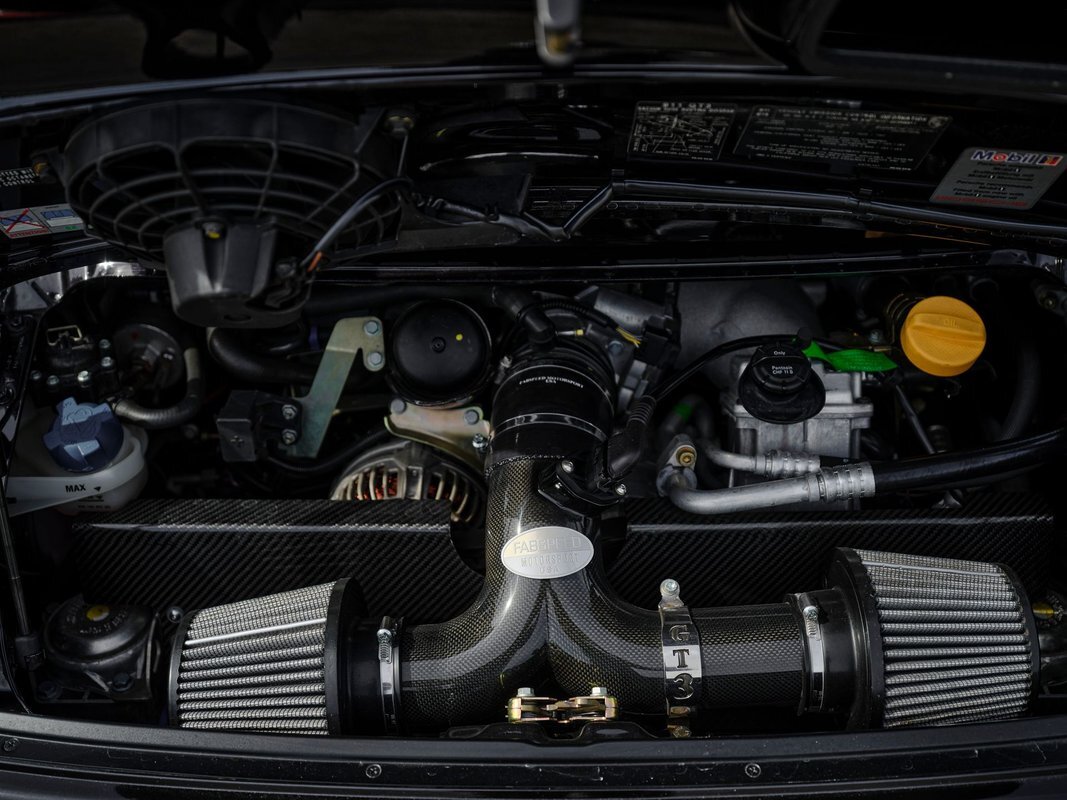 This vehicle is equipped with the GT3's original 3.6L Flat 6, but has seen well over $30,000 in upgrades. The engine was bored out to 3.8L's, and received accommodating supporting mods such as Deman stainless steel headers, FabSpeed 200 cell sport cats, Fabspeed carbon cold air intake, and Fabspeed exhaust. With Deman Motorsport's matching performance ECU software for the now 3.8L Flat 6, this GT3 is now estimated to be producing 450HP.