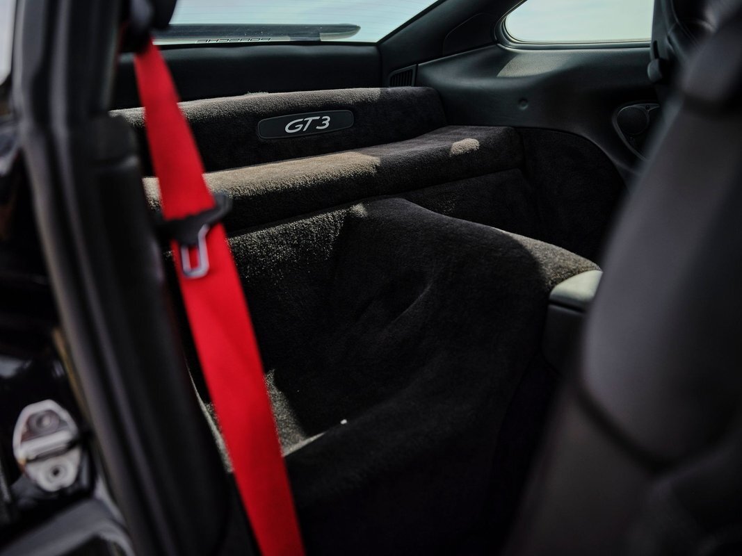 The interior of the vehicle is also in wonderful condition, showing no signs of wear or fading. Even the original “Porsche” matts are in mint condition. The optional Guards Red seat belts, sports seats, and carbon fiber options throughout the interior make this GT3 give a true “racecar” appearance without sacrificing overall comfort and drive ability.