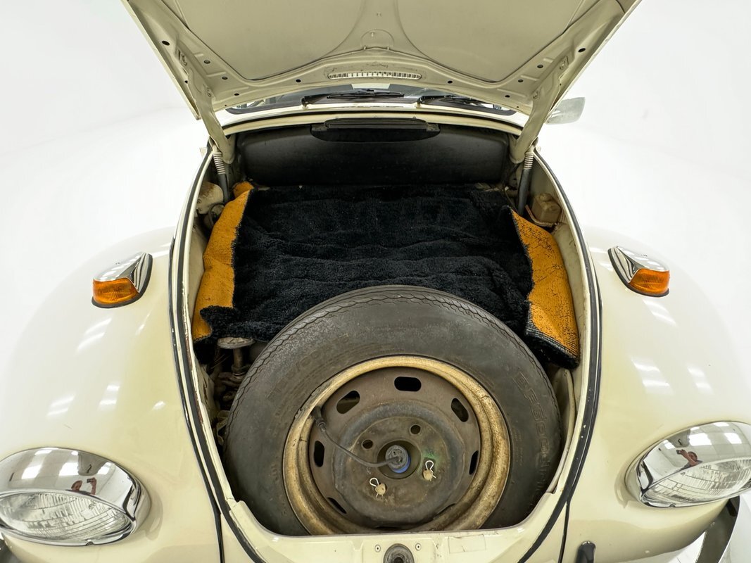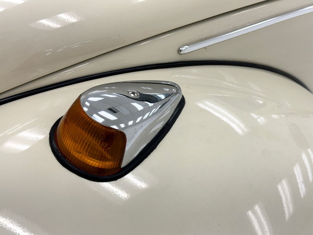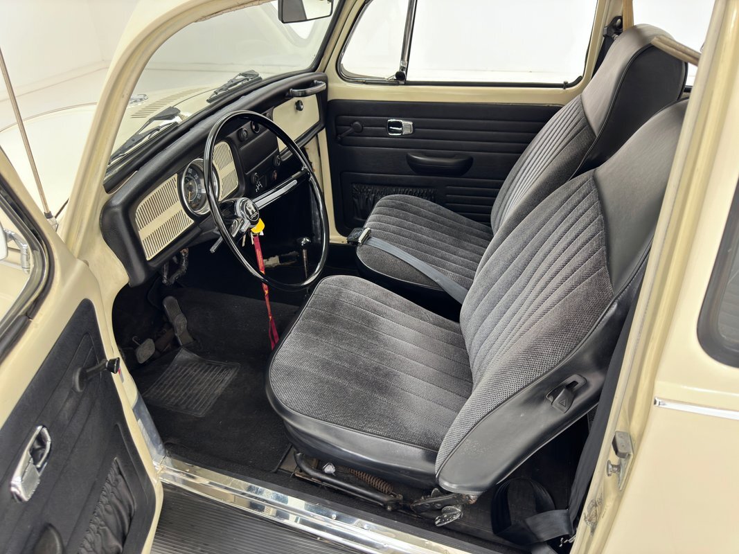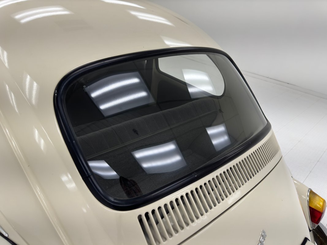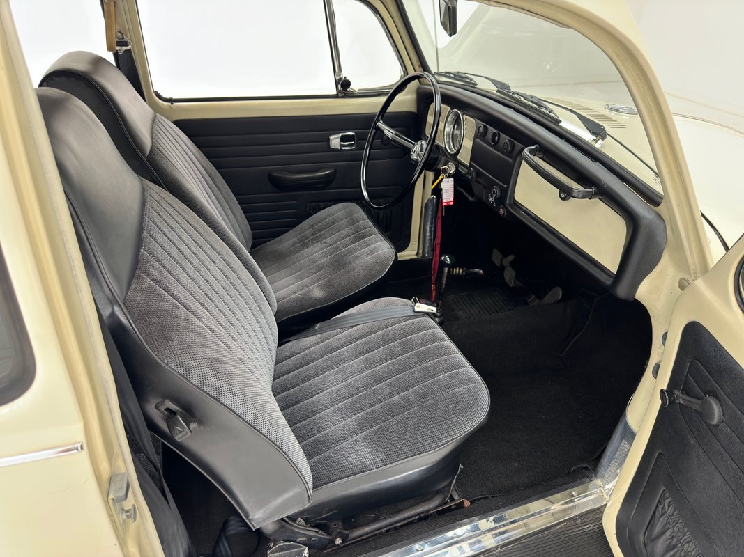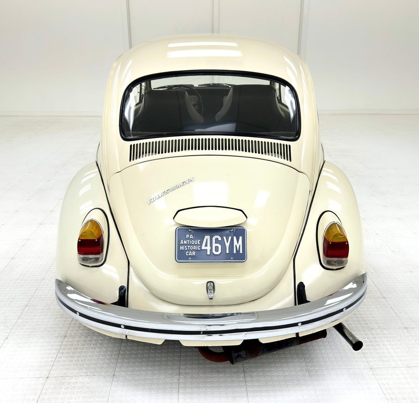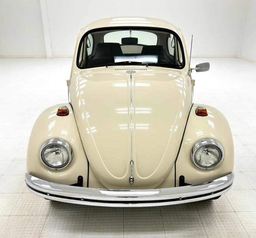 Our Beetle is finished in Ivory which is complemented by chrome features including the headlight rings, handles, midline trim on the hood, bumpers, and marker light housing, all in great shape. It's also contrasted by dark features such as the window trim, bumper braces, fender beading, running board, and of course, the tires. What we're saying is that Ivory is a fantastic color on this car! VW hubcaps adorn the color keyed 14-inch steel wheels and we note some chipping on a few of them. The body is straight and so are the gap lines and few imperfections exist. We note a paint drip, an area of orange peel, a scuff, and a crack in the paint.