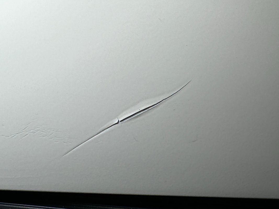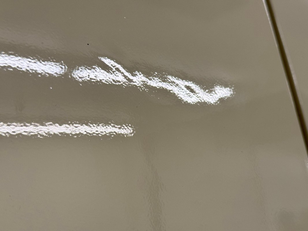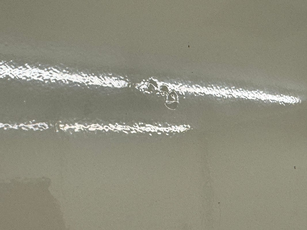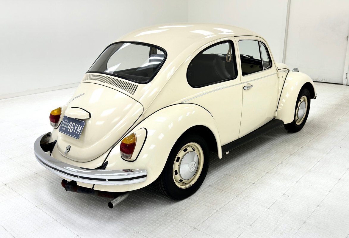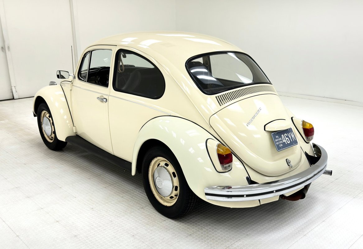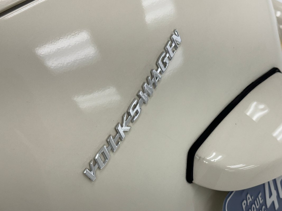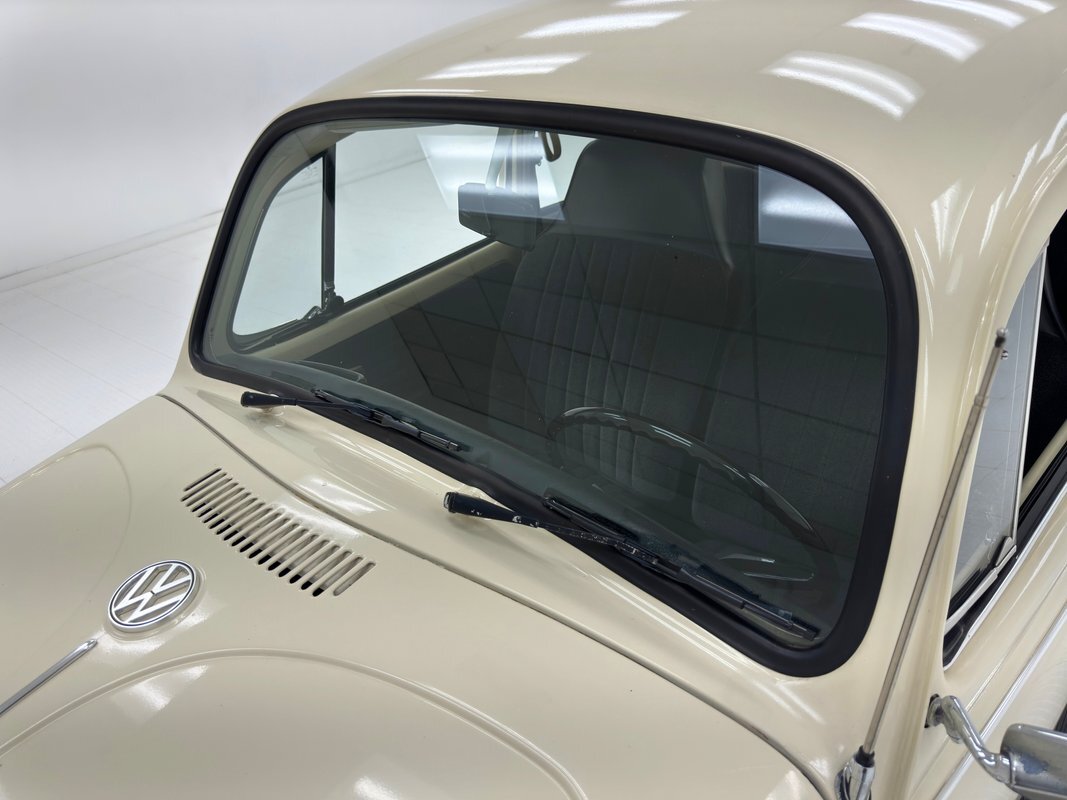 Our Beetle is finished in Ivory which is complemented by chrome features including the headlight rings, handles, midline trim on the hood, bumpers, and marker light housing, all in great shape. It's also contrasted by dark features such as the window trim, bumper braces, fender beading, running board, and of course, the tires. What we're saying is that Ivory is a fantastic color on this car! VW hubcaps adorn the color keyed 14-inch steel wheels and we note some chipping on a few of them. The body is straight and so are the gap lines and few imperfections exist. We note a paint drip, an area of orange peel, a scuff, and a crack in the paint.