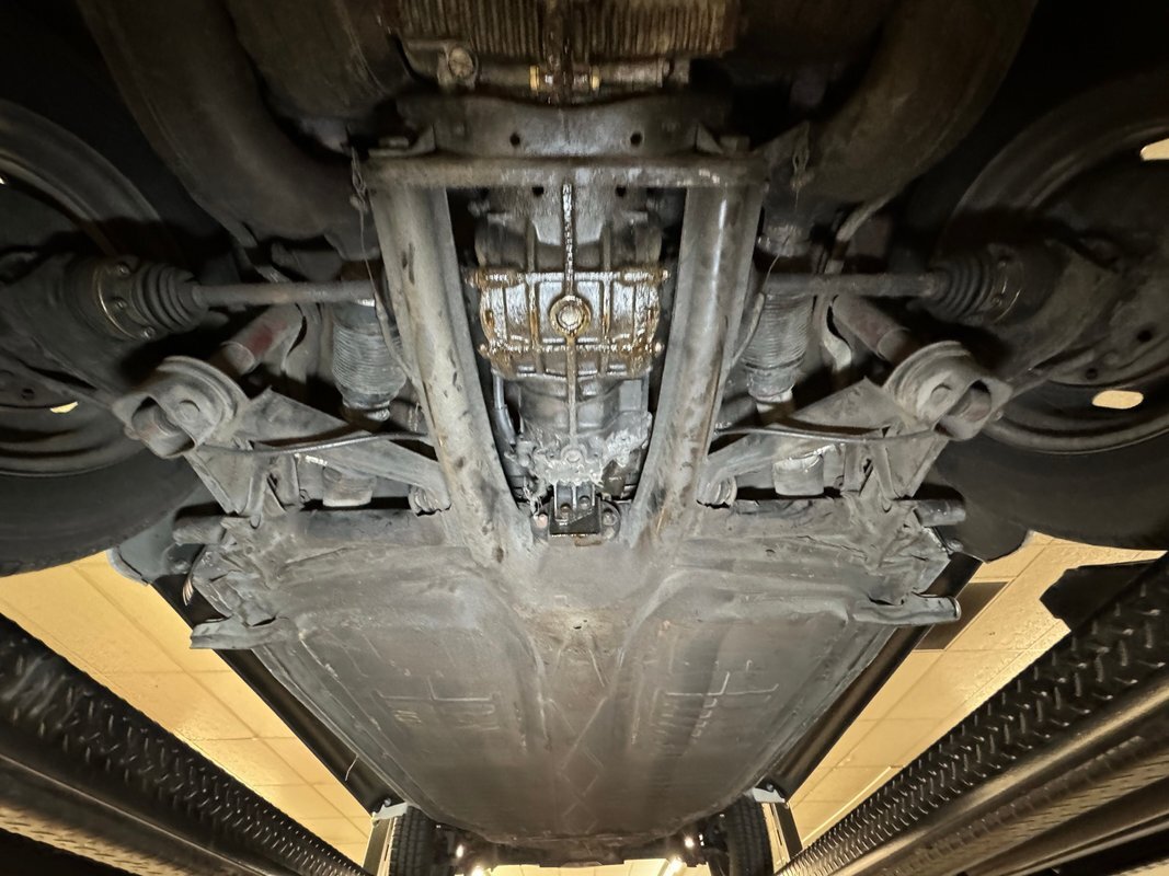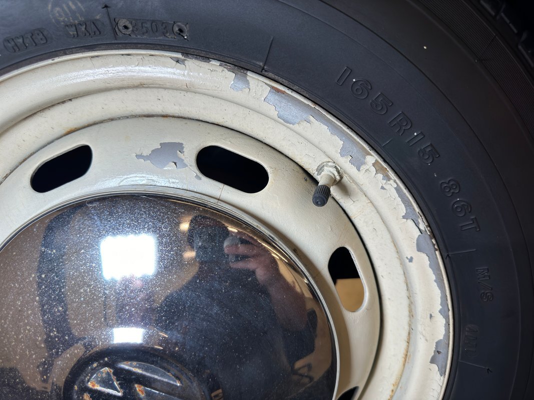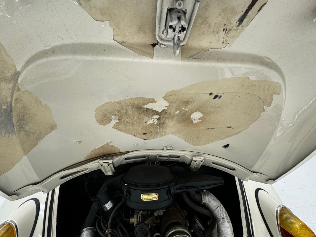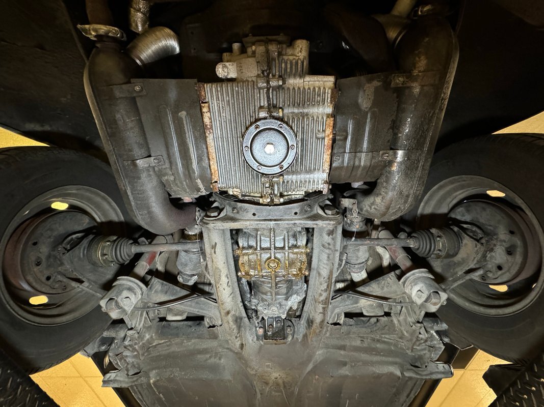 Starting from the back, the headers and exhaust pipe have typical surface rust, enter a stock style muffler then exit via a longer than normal tailpipe. We also note some oil on the transaxle but from there it's clear sailing as clean belly pans cover the rest of the underside. Wheel components are clean and rubber boots are intact. VW suspension consists of transverse torsion bars in the front and semi trailing arm with torsion bar in the back.