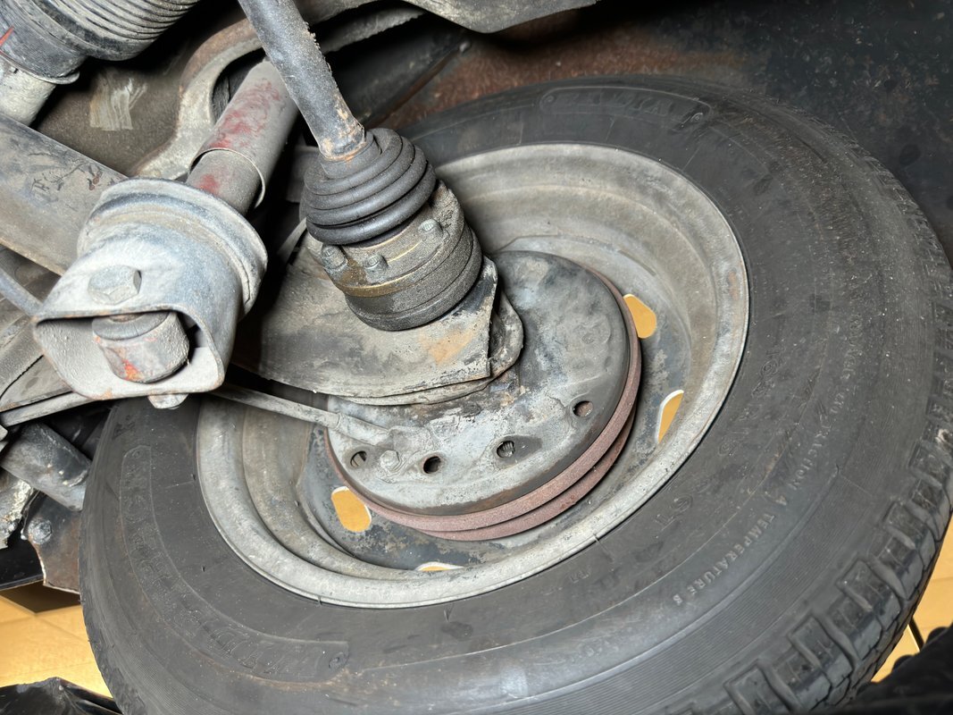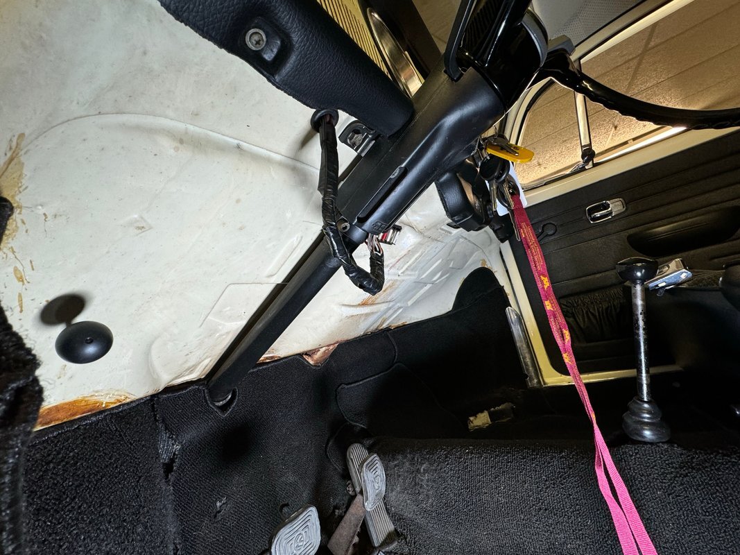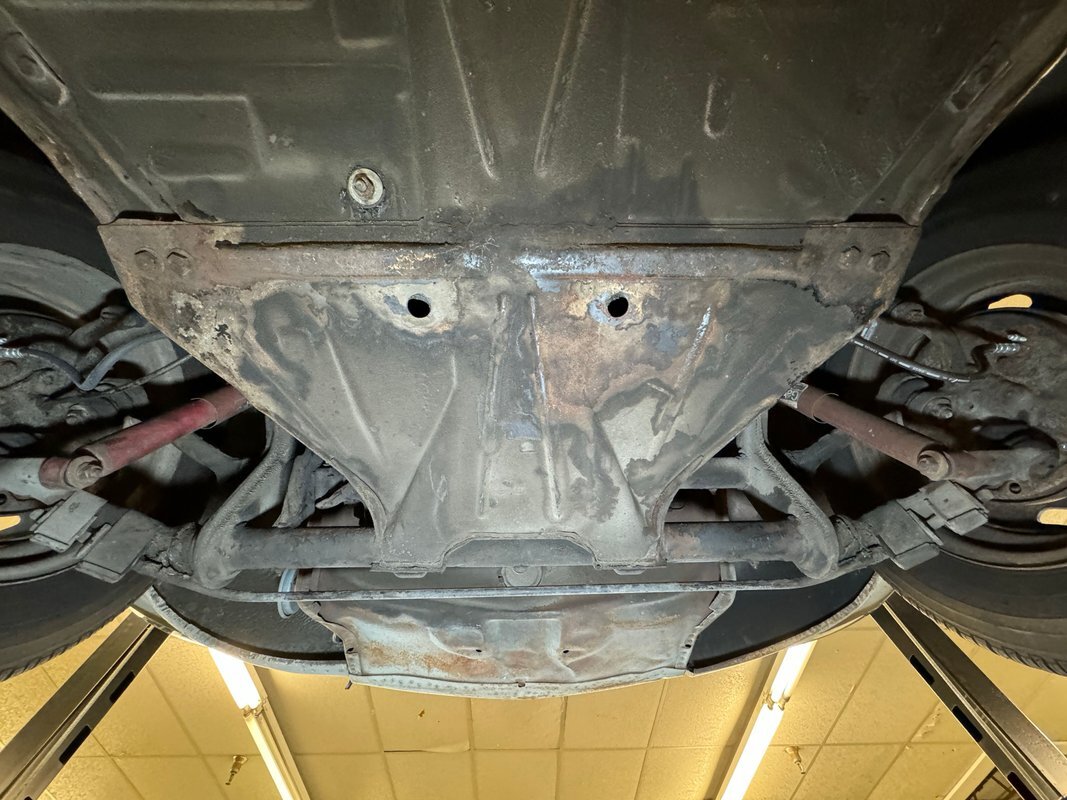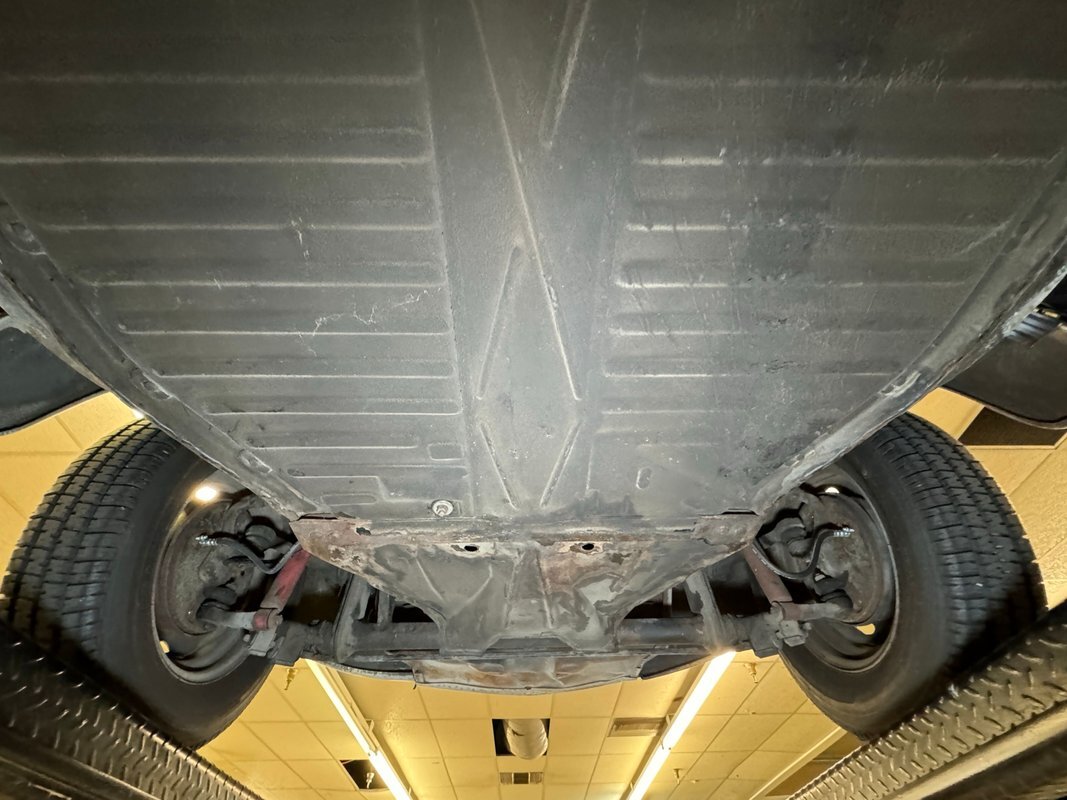 Starting from the back, the headers and exhaust pipe have typical surface rust, enter a stock style muffler then exit via a longer than normal tailpipe. We also note some oil on the transaxle but from there it's clear sailing as clean belly pans cover the rest of the underside. Wheel components are clean and rubber boots are intact. VW suspension consists of transverse torsion bars in the front and semi trailing arm with torsion bar in the back.