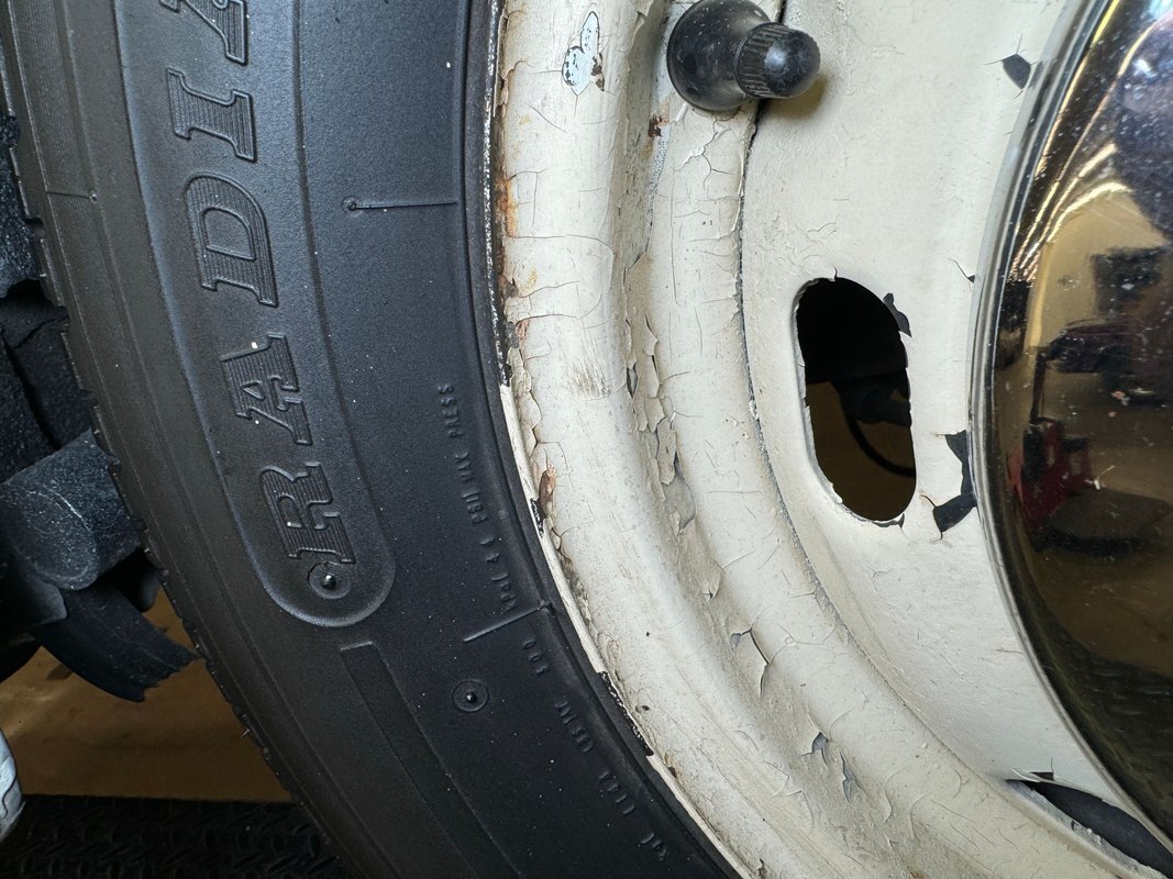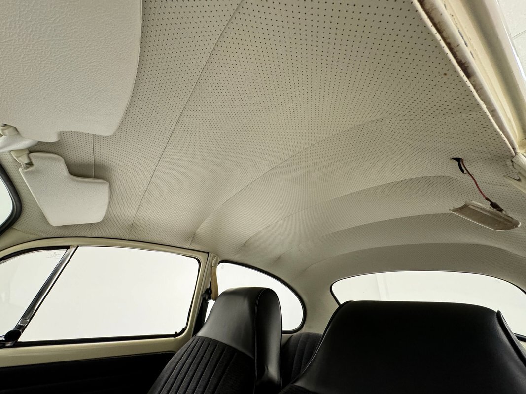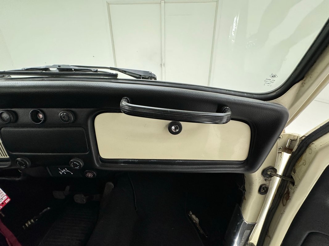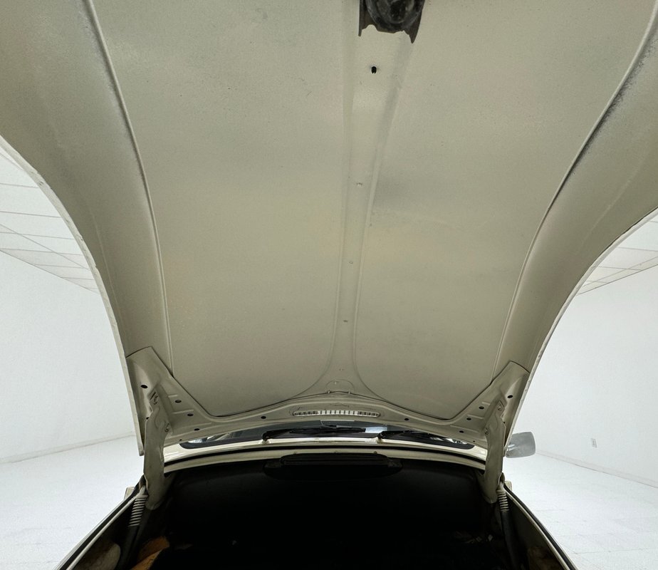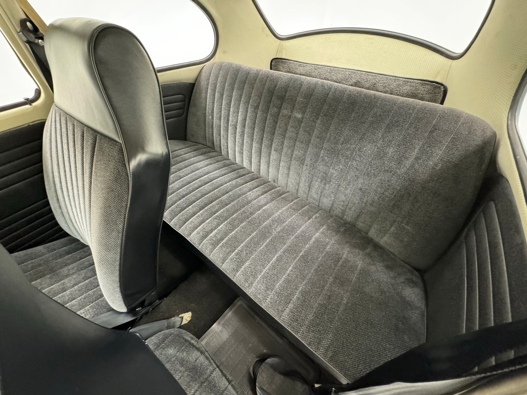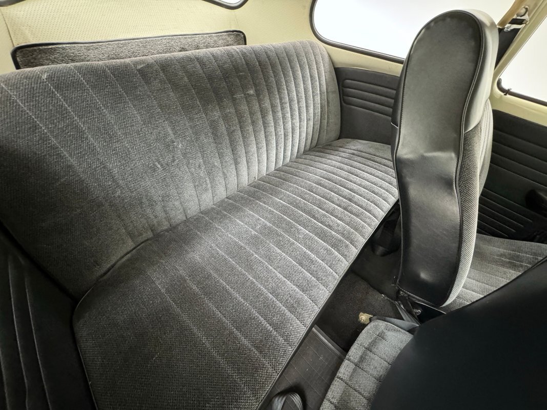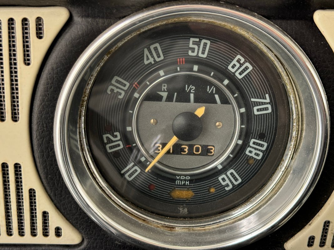 The black vinyl door cards are clean and mostly straight with some separation on the edge from the body colored door. Tall backed black cloth seats are lined in black vinyl including the headrest and look to be in good shape as does the rear bench which is upholstered in the same velour like cloth. Basic configuration is found from the steering wheel forward, all in clean and tidy condition, a single gauge in the sightline relaying speed, fuel, and miles traveled. An ivory mesh grille is embedded in the black plastic dashboard and matches the painted glove box for a clean and coordinated presentation. Looped carpet mats in black cover the floor where we find the shifter with some patina on shaft and knob, the shift pattern is on the dash as a reminder. The white perforated headliner is in decent condition save for the dome light which has come loose and is hanging but the wire. The visors look good and the "frunk" is covered in a remnant carpet piece in black and has a spare.