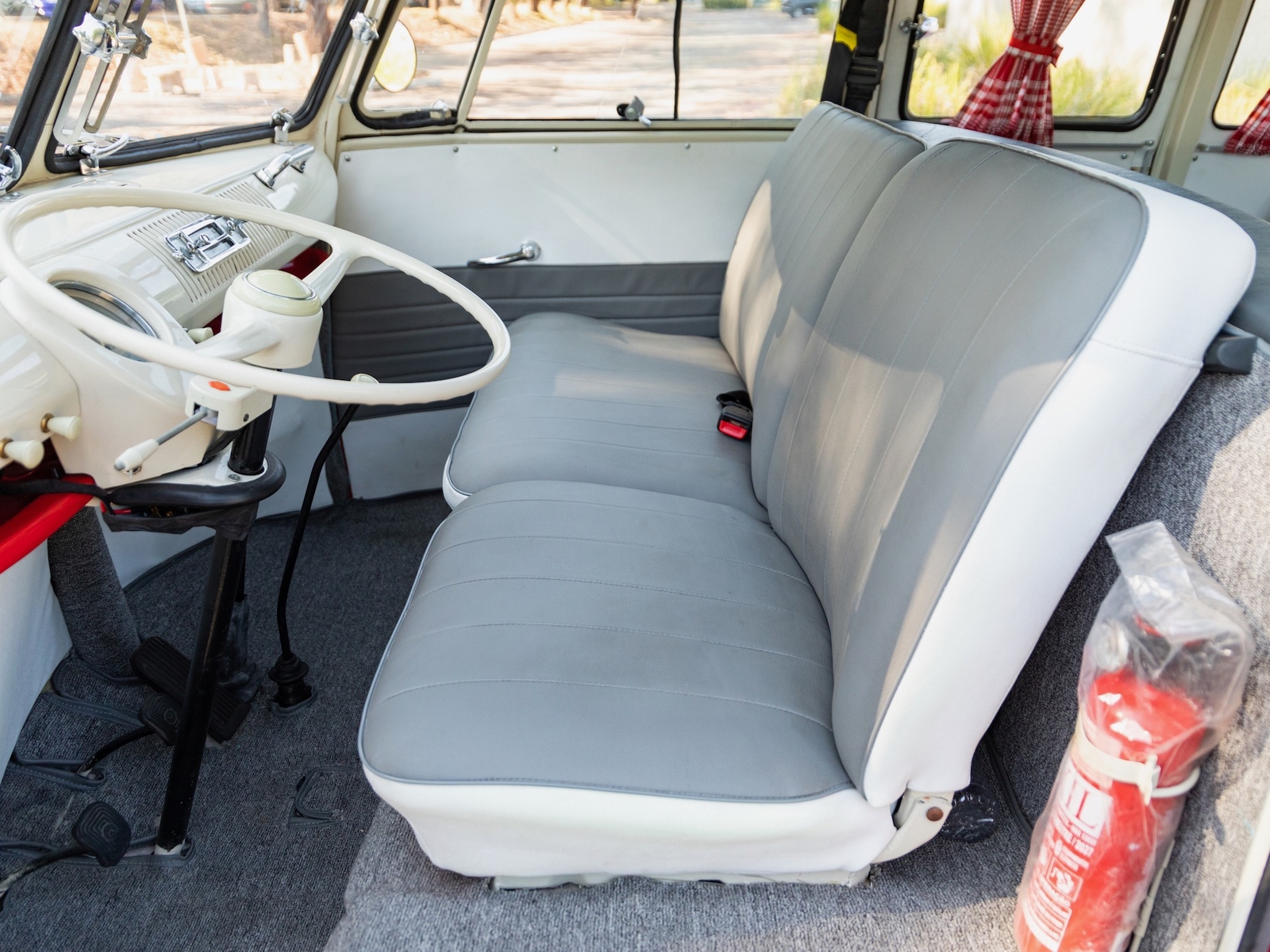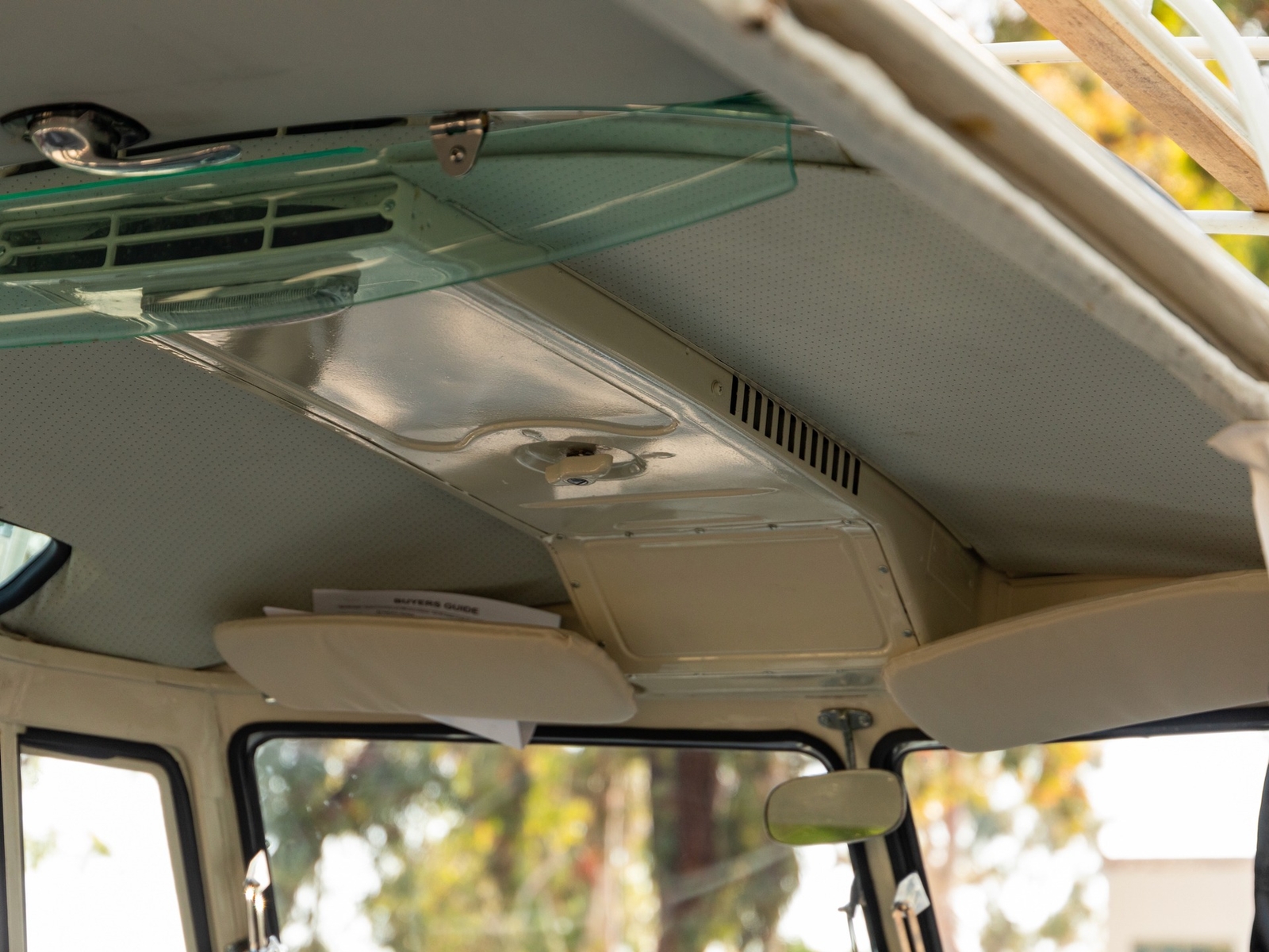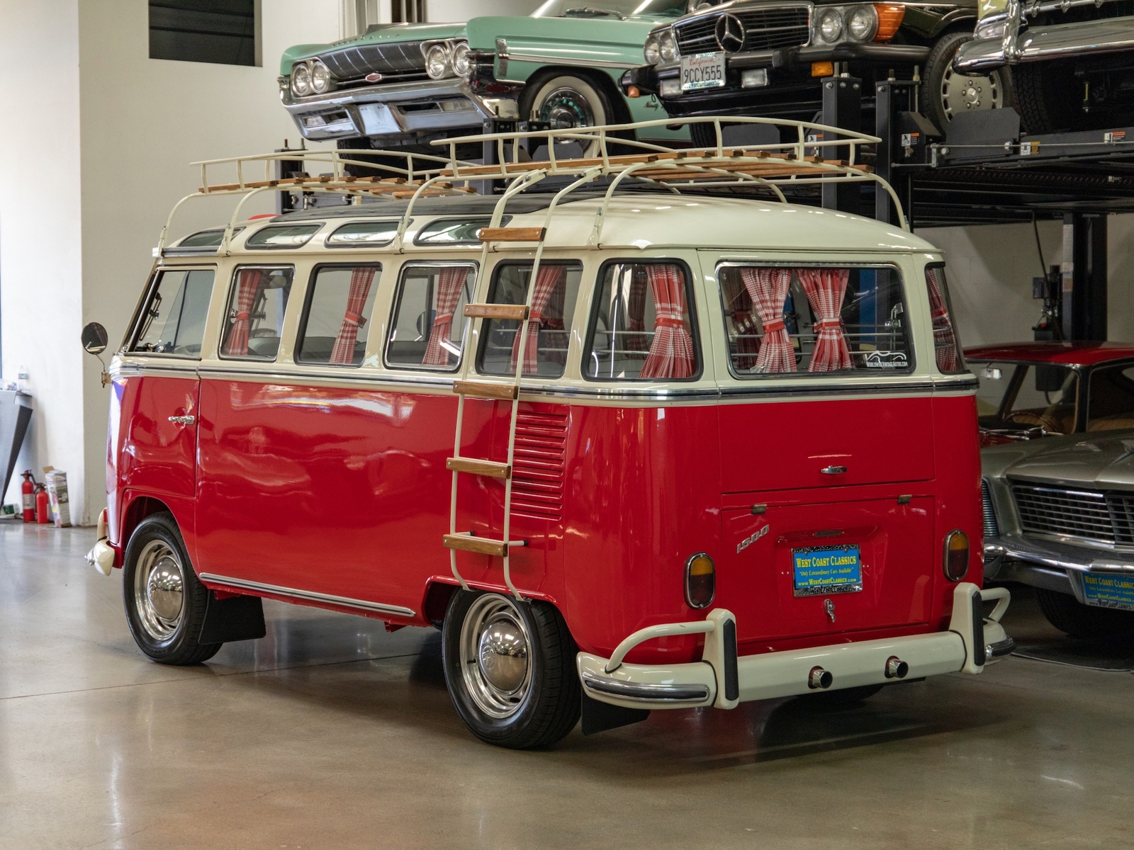 The bus is fitted with highly desirable 'original German' Safari front windows. The 1830 single carb 4 cylinder engine was rebuilt and is matched to a 4 speed manual transaxle. It features eight chrome framed panoramic samba windows, a retractable ragtop canvas sunroof, a split windshield with safari windows, a wider trunk lid and a roof rack and ladder that combines stainless steel and wood.