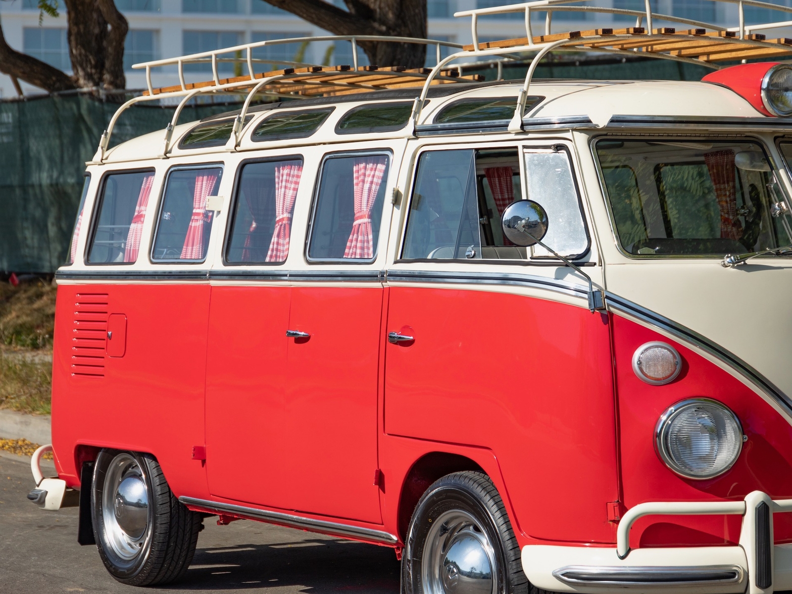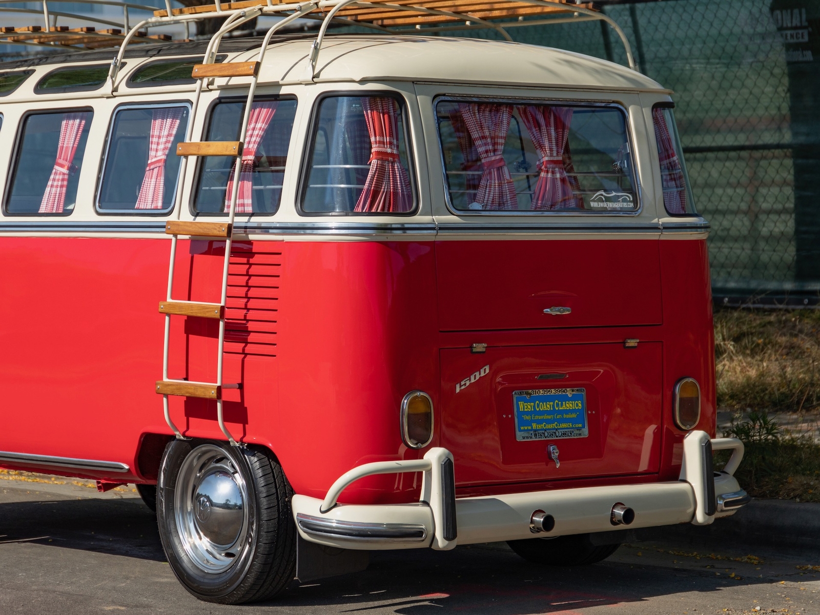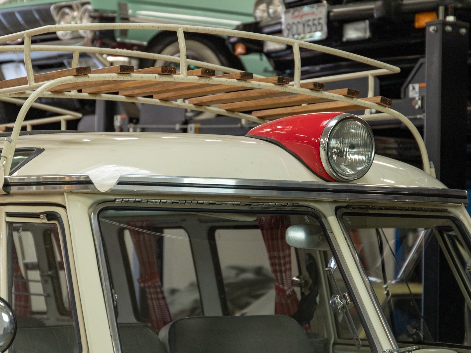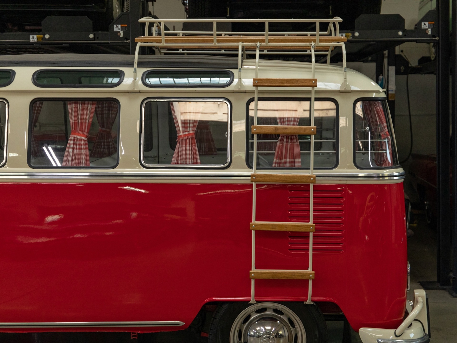 The bus is finished in two-tone colors with an Ivory White top and a Red bottom over a White and Gray interior. It features safari front windows, two sets of pop-out windows on each side, a full center retractable ragtop sunroof, double cargo side doors and seating for nine. The rear wooden roof rack provides for additional storage.