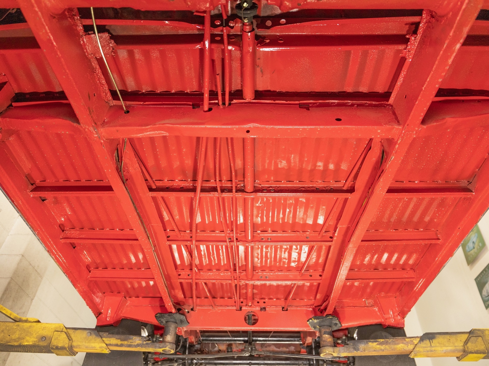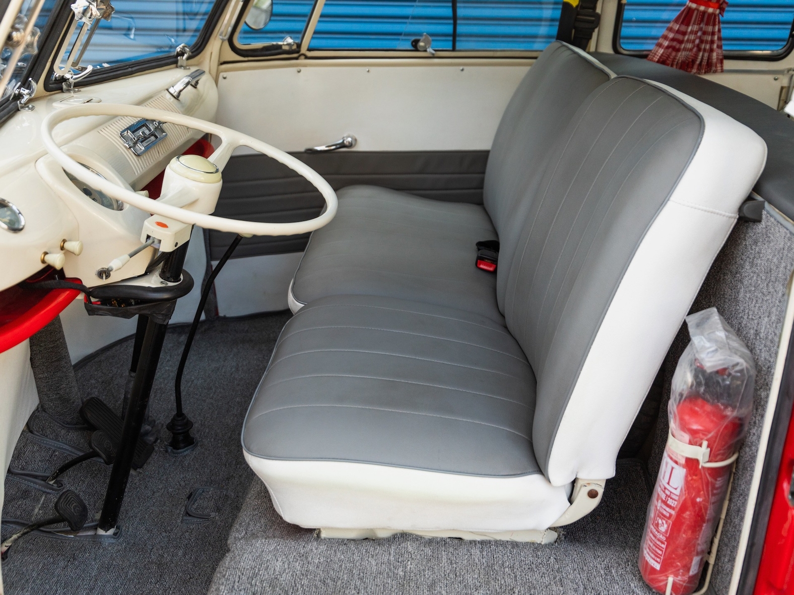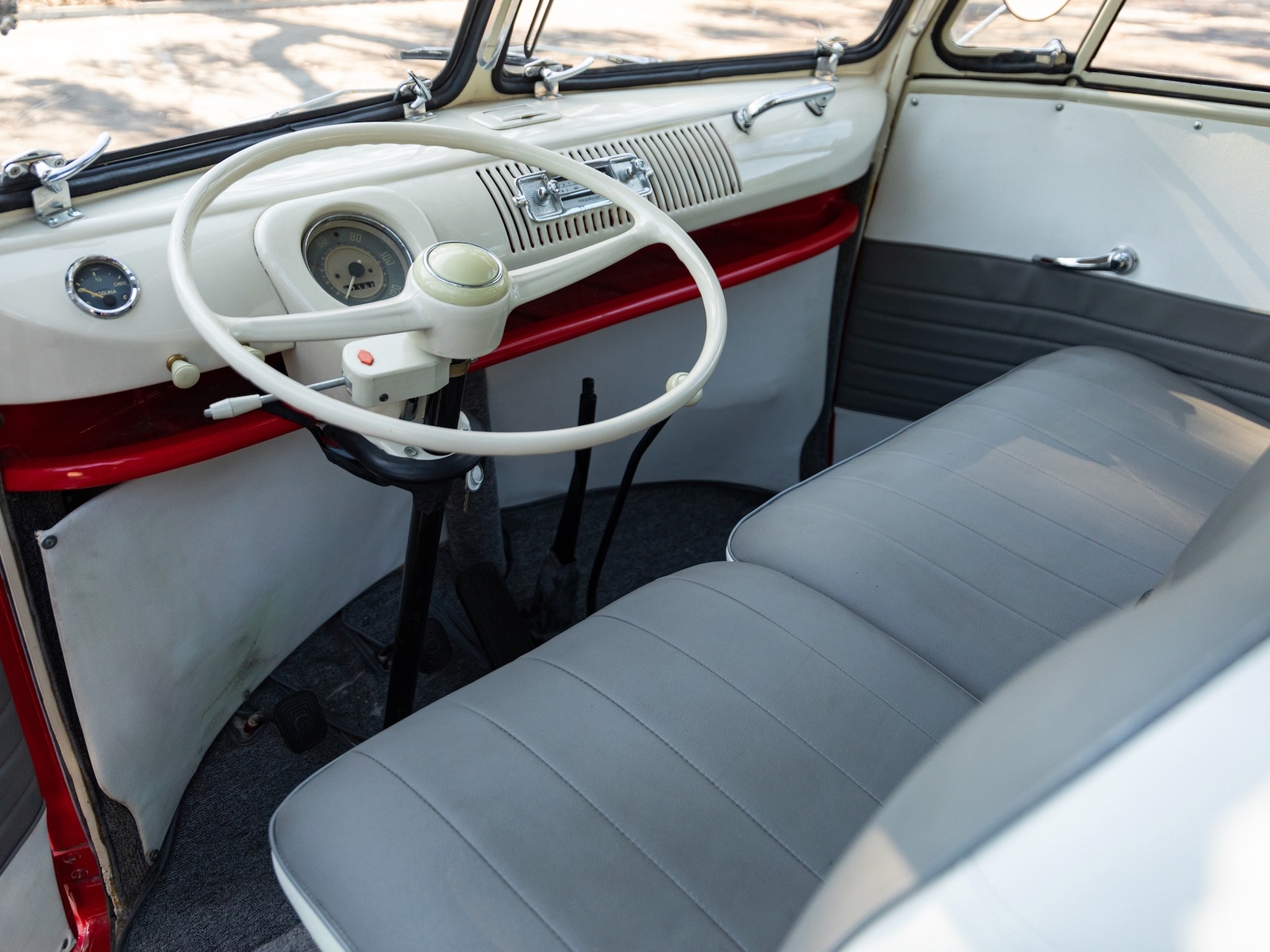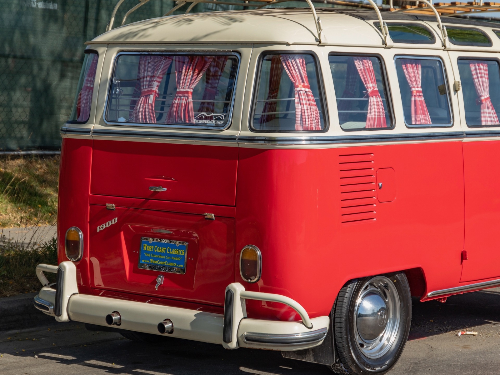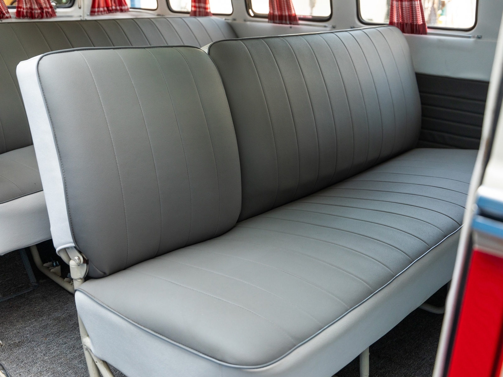 The bus is finished in two-tone colors with an Ivory White top and a Red bottom over a White and Gray interior. It features safari front windows, two sets of pop-out windows on each side, a full center retractable ragtop sunroof, double cargo side doors and seating for nine. The rear wooden roof rack provides for additional storage.