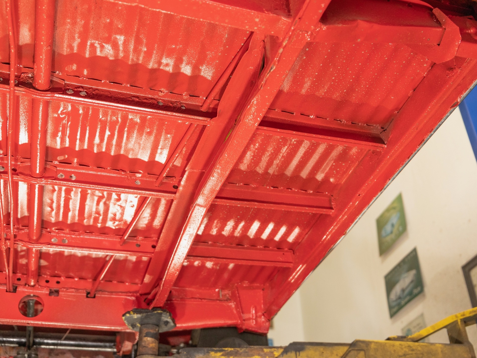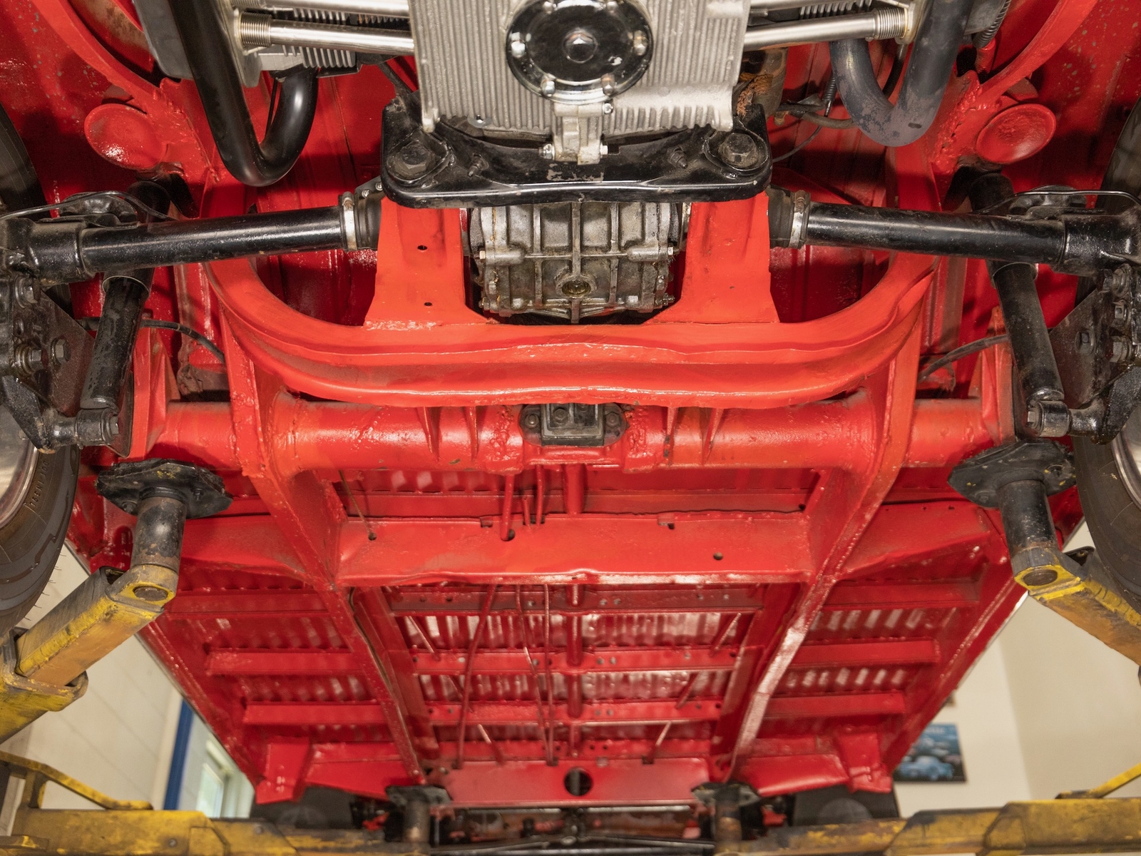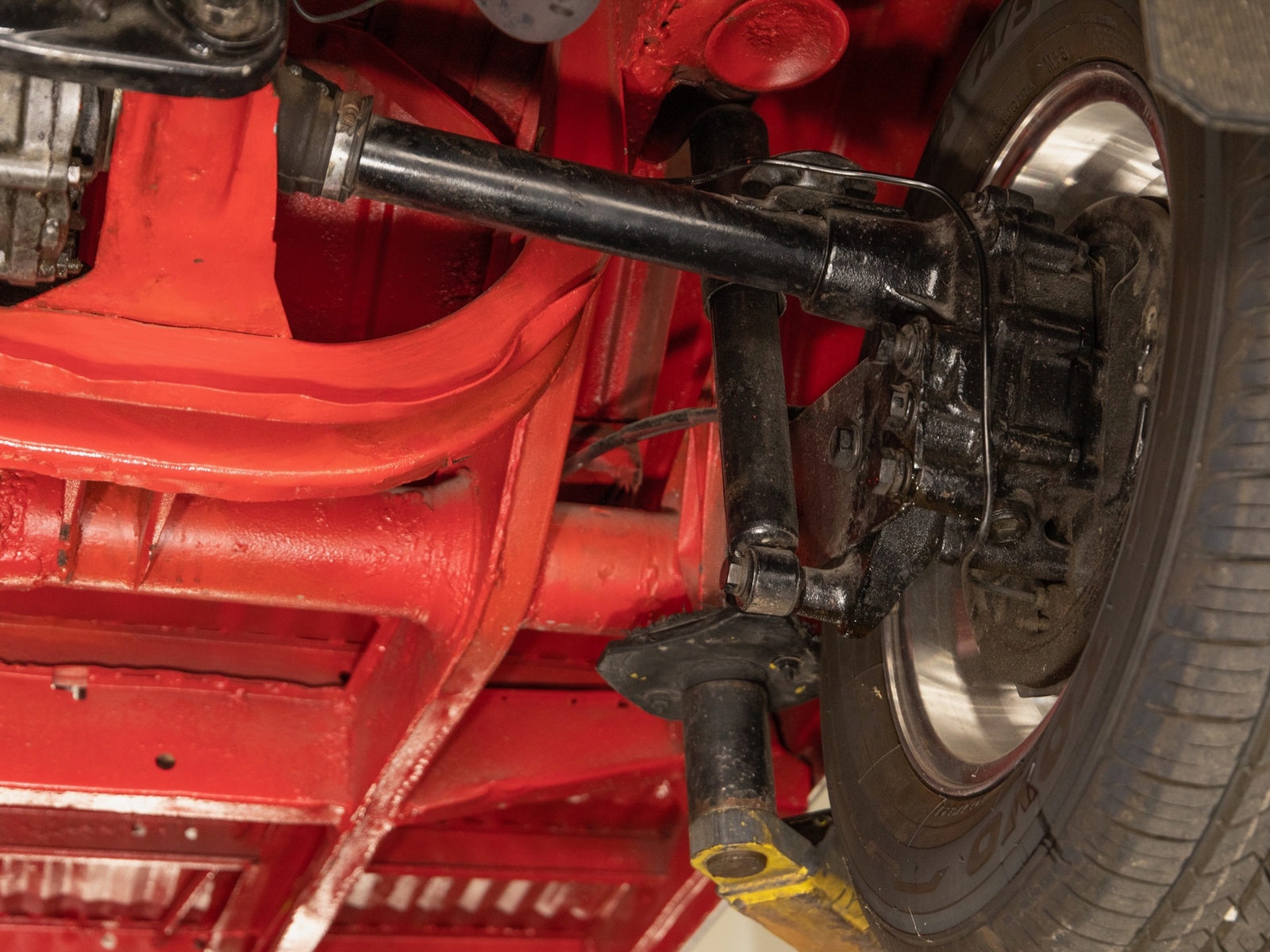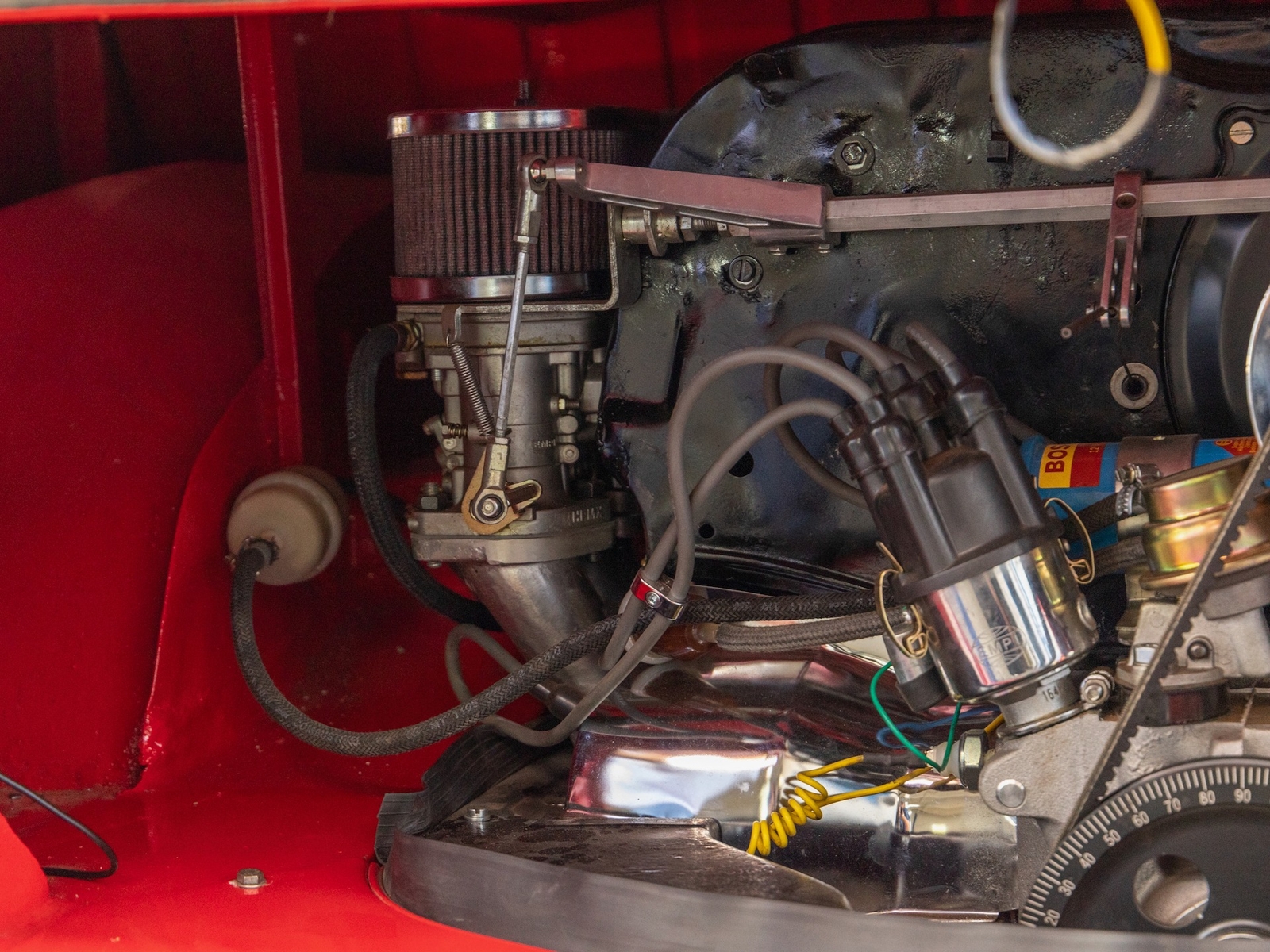 The bus is finished in two-tone colors with an Ivory White top and a Red bottom over a White and Gray interior. It features safari front windows, two sets of pop-out windows on each side, a full center retractable ragtop sunroof, double cargo side doors and seating for nine. The rear wooden roof rack provides for additional storage.