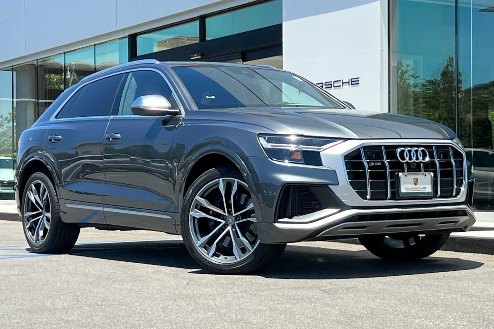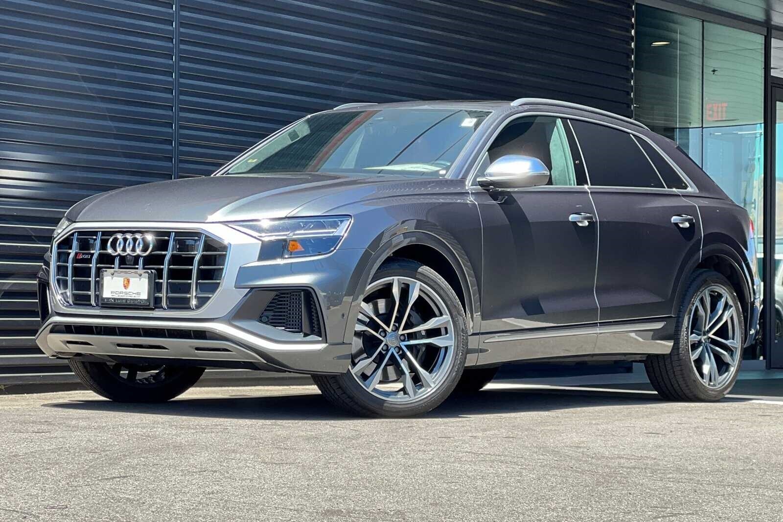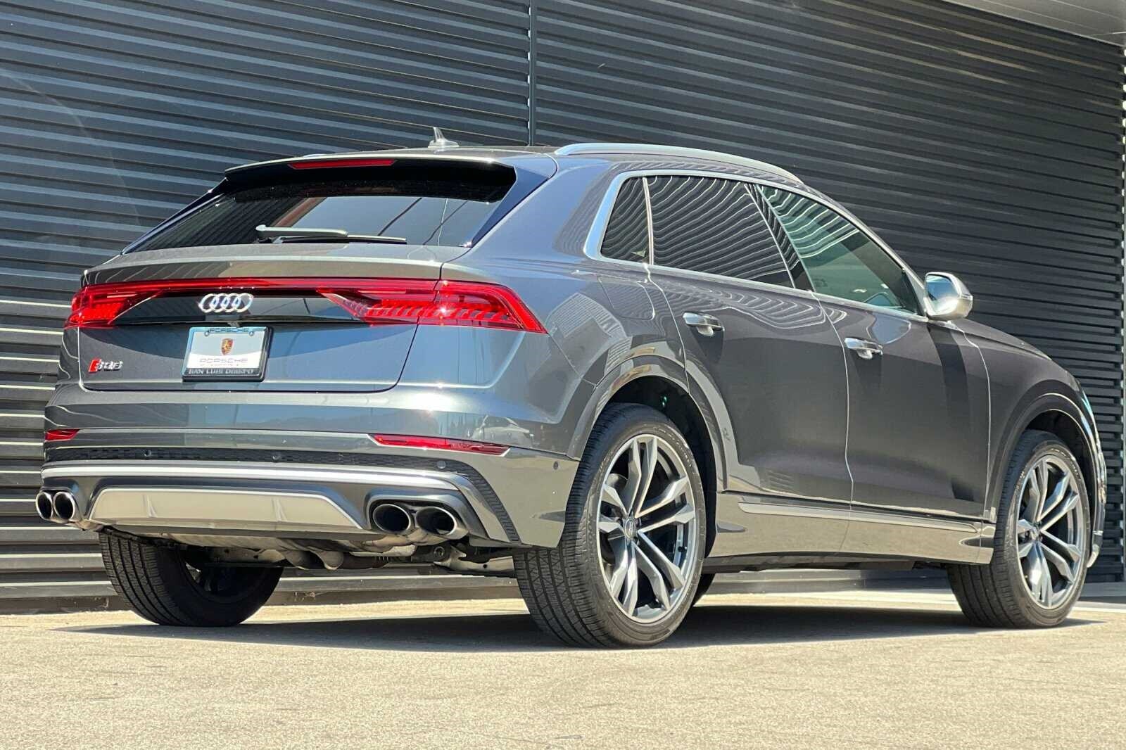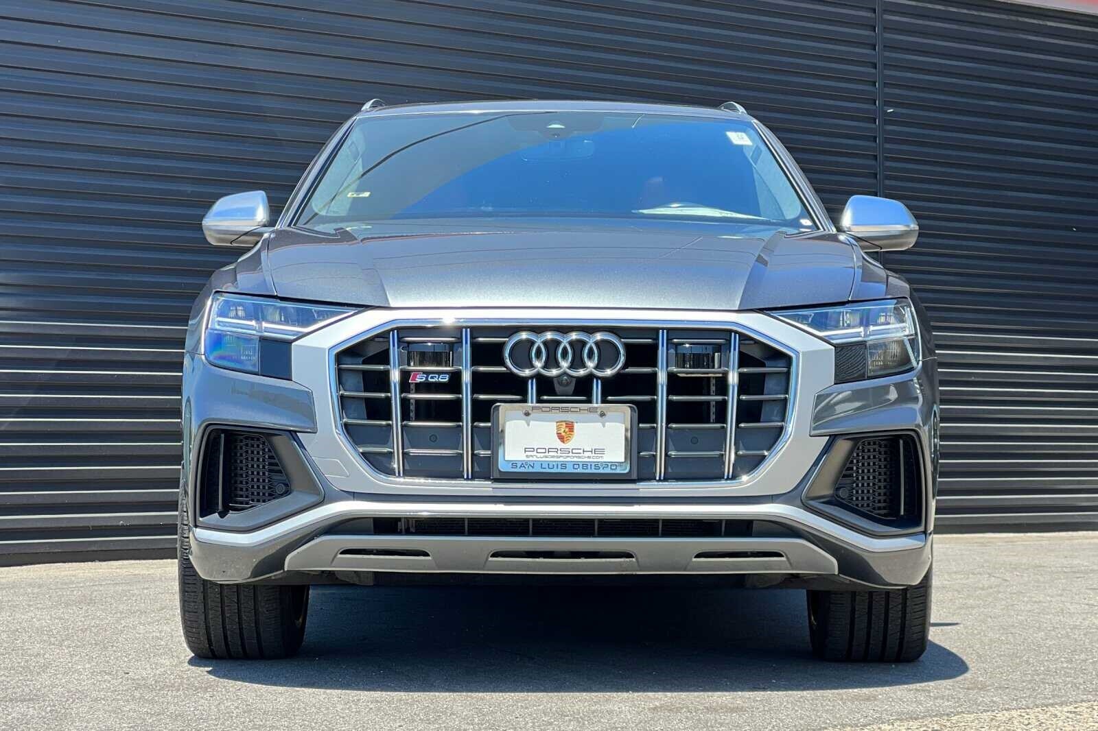 This Porsche San Luis Obispo 2020 Daytona Gray Pearl Effect Audi SQ8 4.0T Premium Plus AWD is well equipped and includes these features and benefits: 17 Speakers, 4-Wheel Disc Brakes, ABS brakes, Adaptive suspension, Air Conditioning, Alloy wheels, AM/FM radio: SiriusXM, Audi smartphone interface (Apple CarPlay/Android Auto), Auto High-beam Headlights, Auto-dimming door mirrors, Auto-dimming Rear-View mirror, Auto-leveling suspension, Automatic temperature control, Brake assist, Bumpers: body-color, Compass, Delay-off headlights, Driver door bin, Driver vanity mirror, Dual front impact airbags, Dual front side impact airbags, Electronic Stability Control, Emergency communication system: Audi connect CARE, PRIME & PLUS, Four wheel independent suspension, Front anti-roll bar, Front Bucket Seats, Front Center Armrest, Front dual zone A/C, Front fog lights, Front reading lights, Fully automatic headlights, Garage door transmitter: HomeLink, Heated & Ventilated S Sport Seats, Heated door mirrors, Heated front seats, Heated steering wheel, Illuminated entry, Leather Shift Knob, Leather steering wheel, Low tire pressure warning, Memory seat, Navigation system: MMI Navigation plus, Occupant sensing airbag, Outside temperature display, Overhead airbag, Overhead console, Panic alarm, Passenger door bin, Passenger vanity mirror, Power door mirrors, Power driver seat, Power Liftgate, Power moonroof: Panoramic, Power passenger seat, Power steering, Power windows, Radio data system, Radio: Bang & Olufsen 3D Premium Sound System, Rain sensing wipers, Rear air conditioning, Rear anti-roll bar, Rear dual zone A/C, Rear fog lights, Rear reading lights, Rear seat center armrest, Rear window defroster, Rear window wiper, Remote keyless entry, Roof rack: rails only, Security system, Speed control, Speed-sensing steering, Split folding rear seat, Spoiler, Steering wheel memory, Steering wheel mounted audio controls, Tachometer, TBD Axle Ratio, Telescoping steering wheel, Tilt steering wheel, Traction control, Trip computer, Turn signal indicator mirrors, Valcona Leather Seating Surfaces, Variably intermittent wipers, Ventilated front seats, and Wheels: 21 10-V-Spoke Partly Polished S Design.