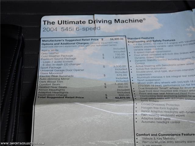 MSRP$67K 2004 BMW 545I SPORT. CLEAN CARFAX, CLEAN AUTOCHECK AND CLEAN TITIEL. BLACK SAPPHIRE METALLIC WITH GRAY DAKOTA LEATHER INTERIOR. WELL-EQUIPPED SPORT PACKAGE, PREMIUM SOUND PACKAGE, COLD WEATHER PACKAGE, REAR SEAT HEATING, HEATED STEERING WHEEL, SPLIT FORLD REAR SEAT, 18S AND MUCH MORE…