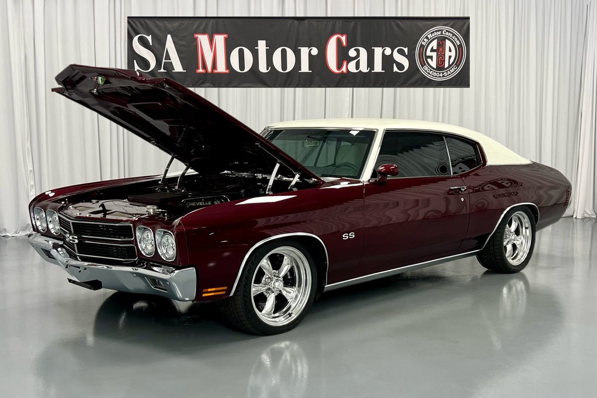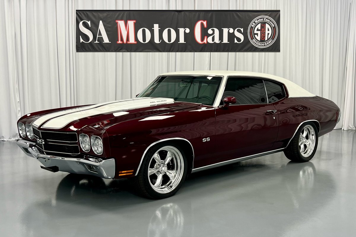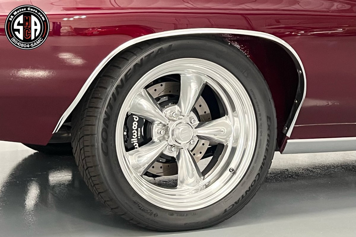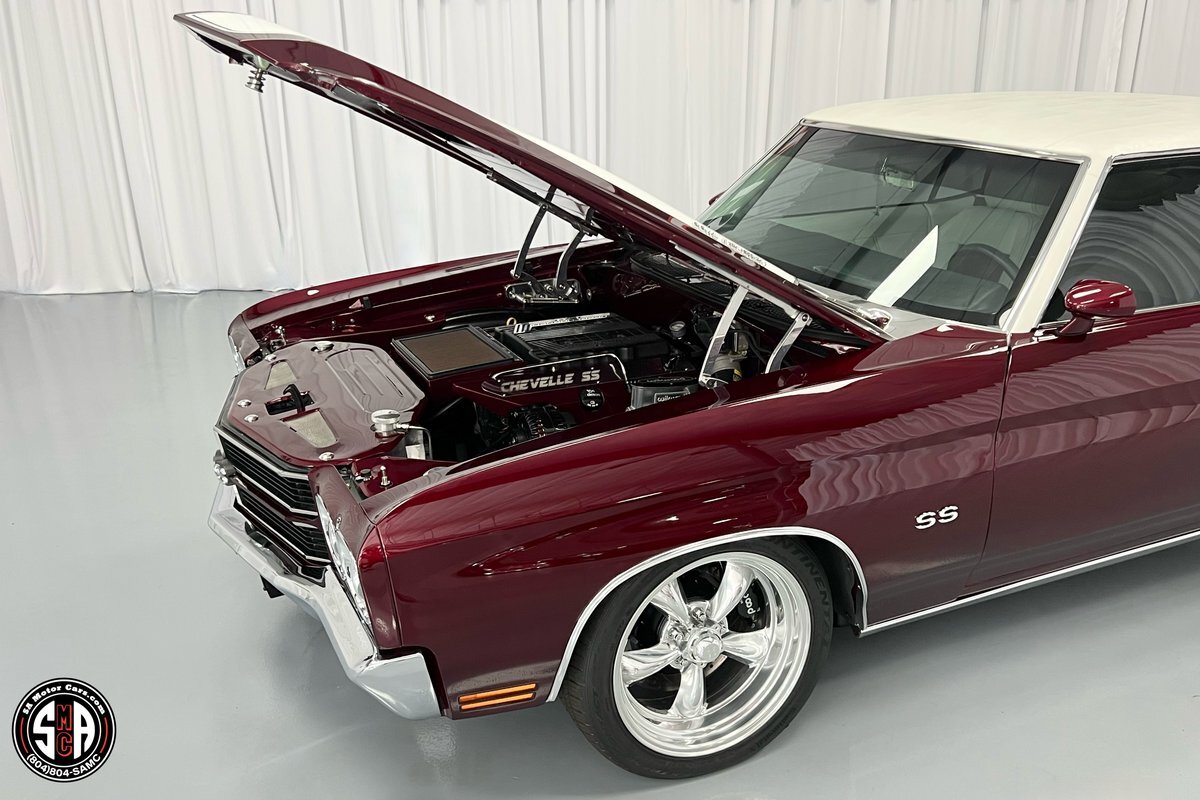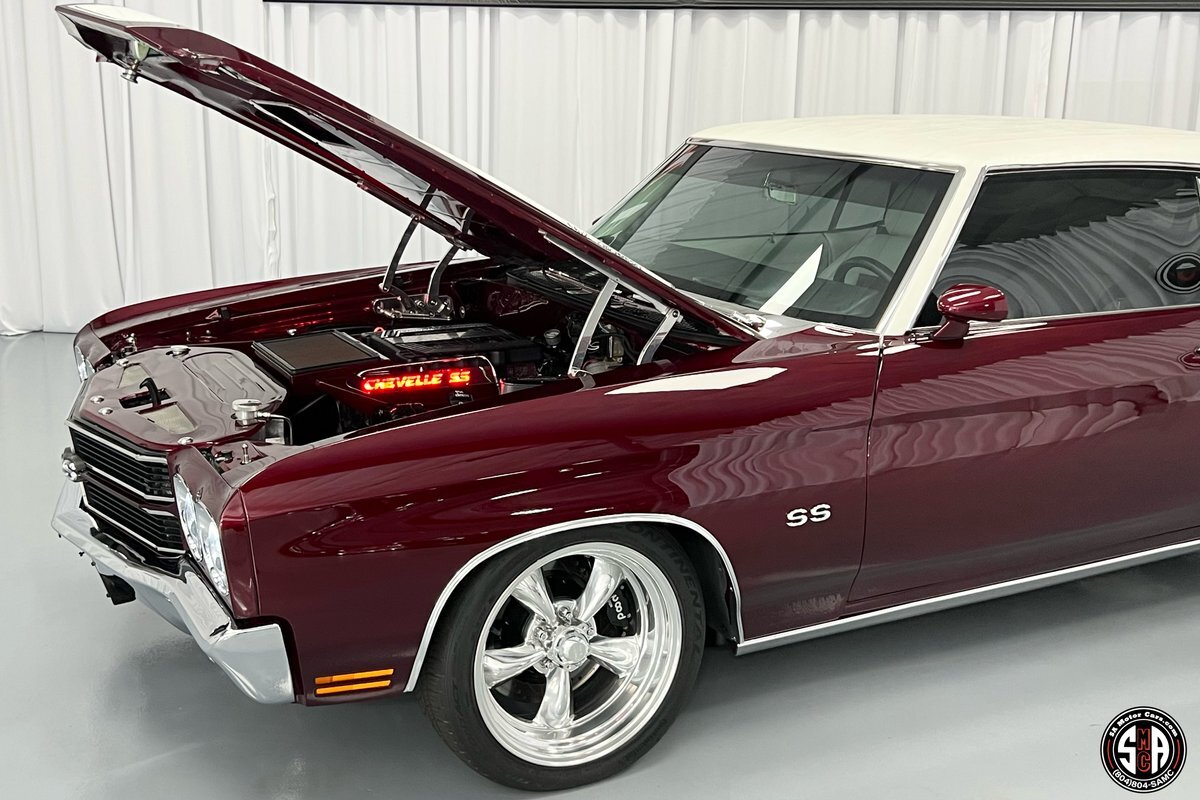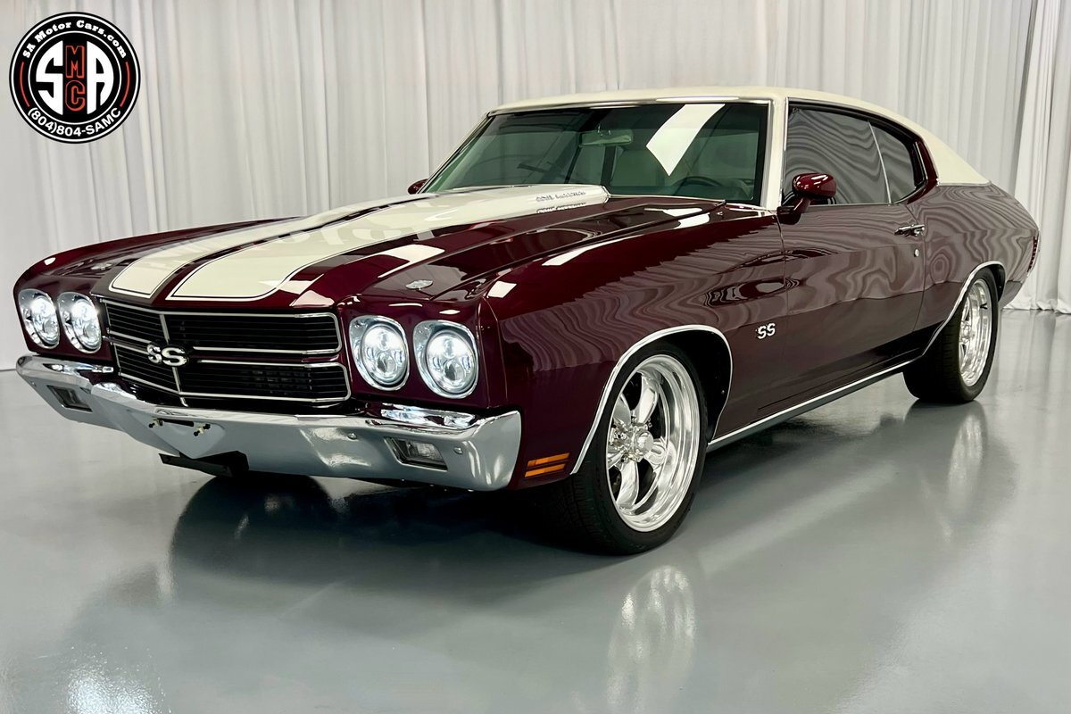 Check out this meticulous 1970 Chevrolet Chevelle Restomod! This Chevelle has undergone an extensive Frame-Off, Rotisserie Build. It has lots of custom and performance upgrades that were added during the process! Take a look at this beautifully straight body with Lowered Rocker Panels to hide visibility of the frame, Brandywine Exterior Paint with Pearl White Rally Stripes, Custom White Vinyl Top, Functional Cowl Hood with Hood Pins, 18'' Polished Aluminum American Racing Wheels with Continental Extreme Contact Tires, Aftermarket Headlights, Chrome Bumpers, Polished Trim, and Polished Exhaust Tips. The inside is sporting a Custom Interior with Burgundy and White Vinyl Upholstery, TMI Bucket Seating, Front Shoulder Belts and Rear Lap Belts, Power Windows, Flaming River Tilt Steering Column and 3-Spoke Steering wheel, Dakota Digital Dashboard Gauges, Custom Center Console, Floor Shifter with an LED Gear Indicator, Aftermarket Audio System, and a Custom Upholstered Trunk with Billet Aluminum Trunk Hinges.