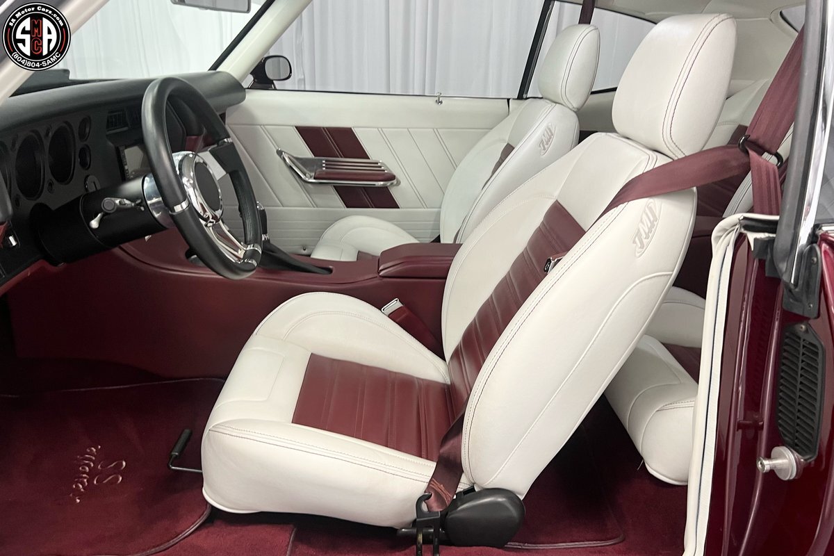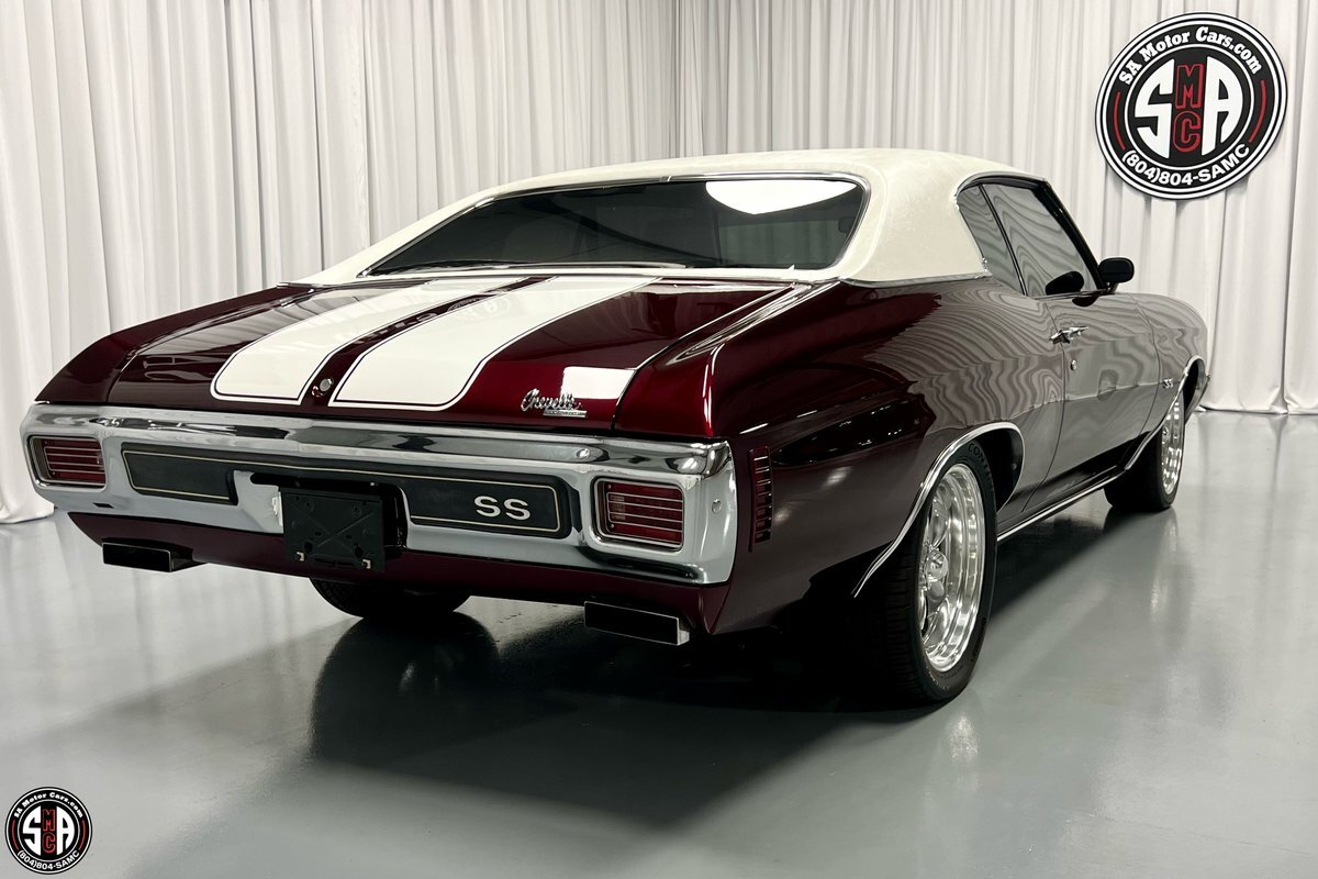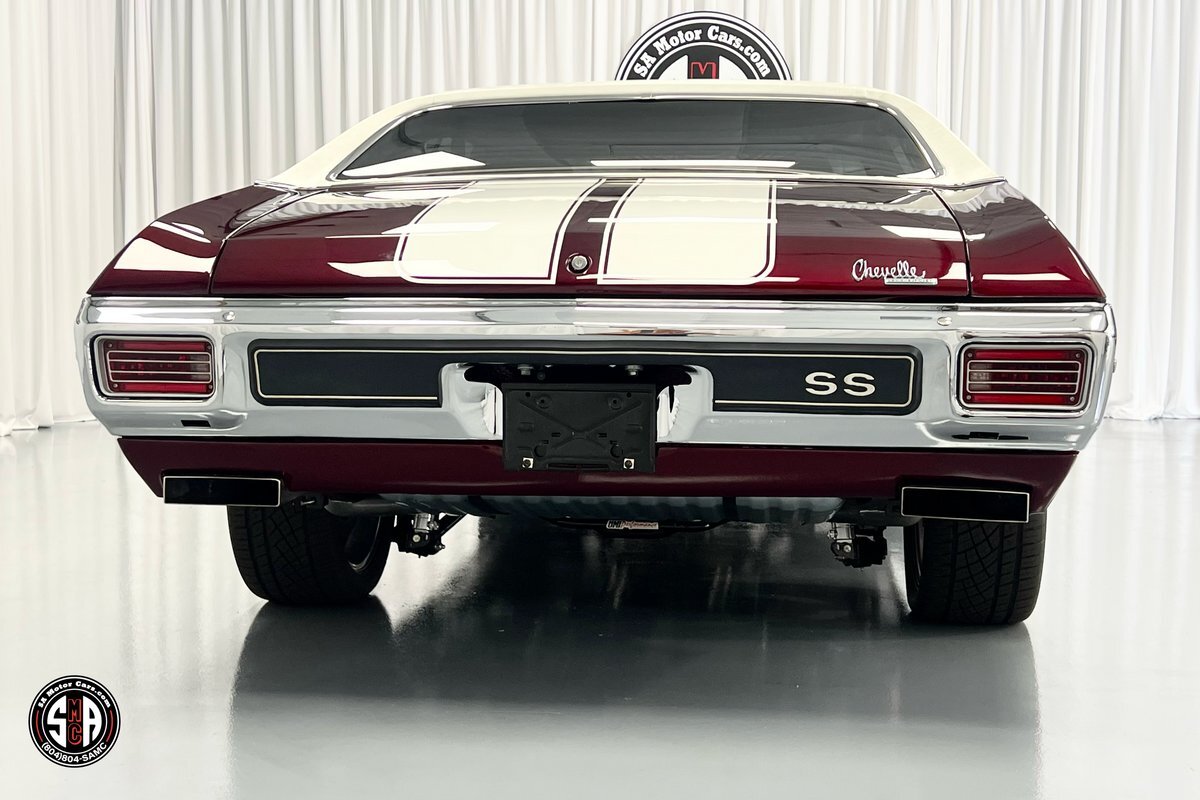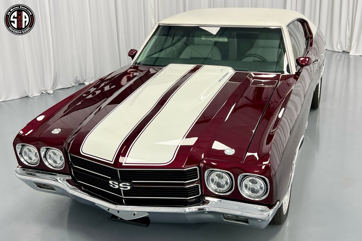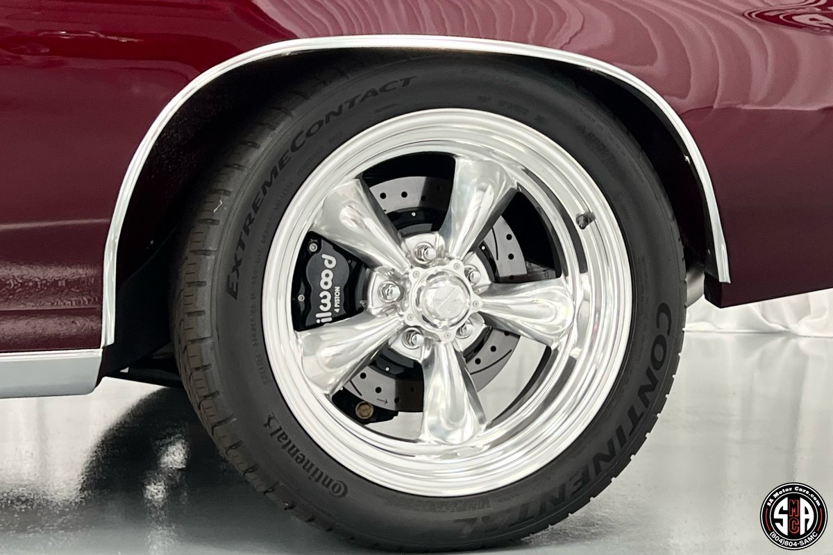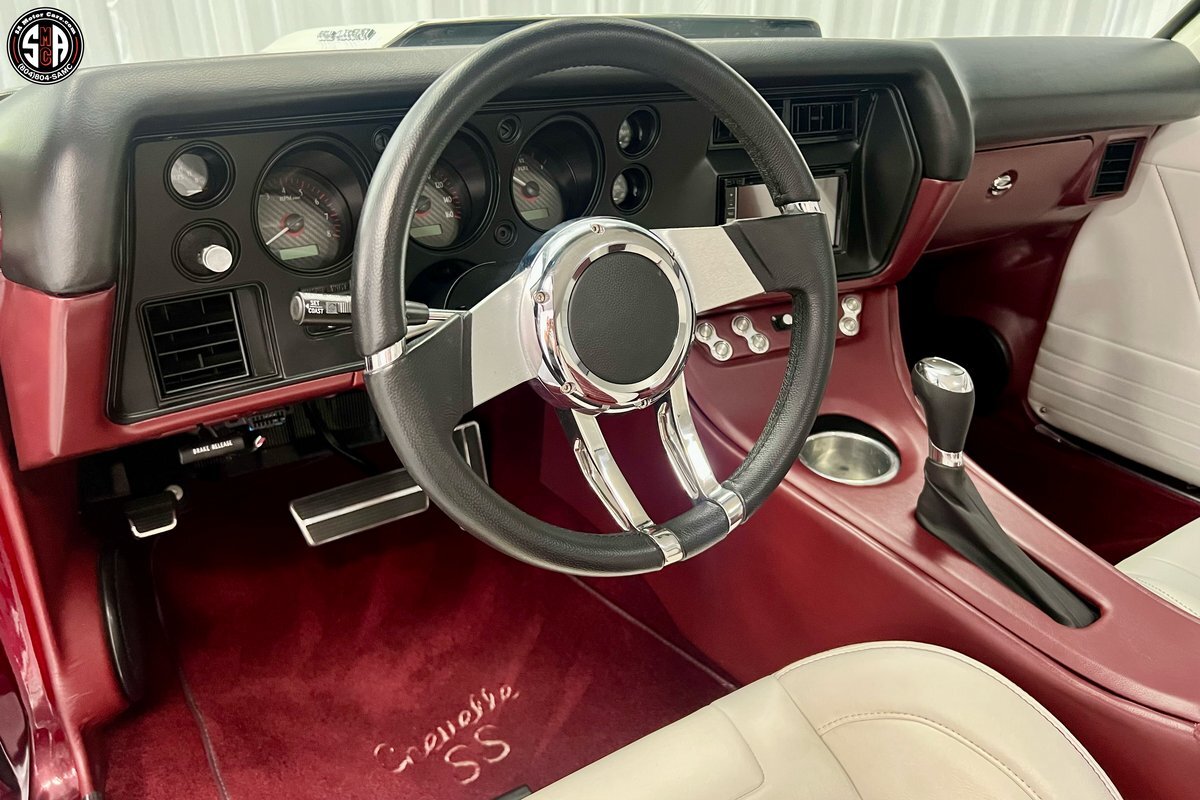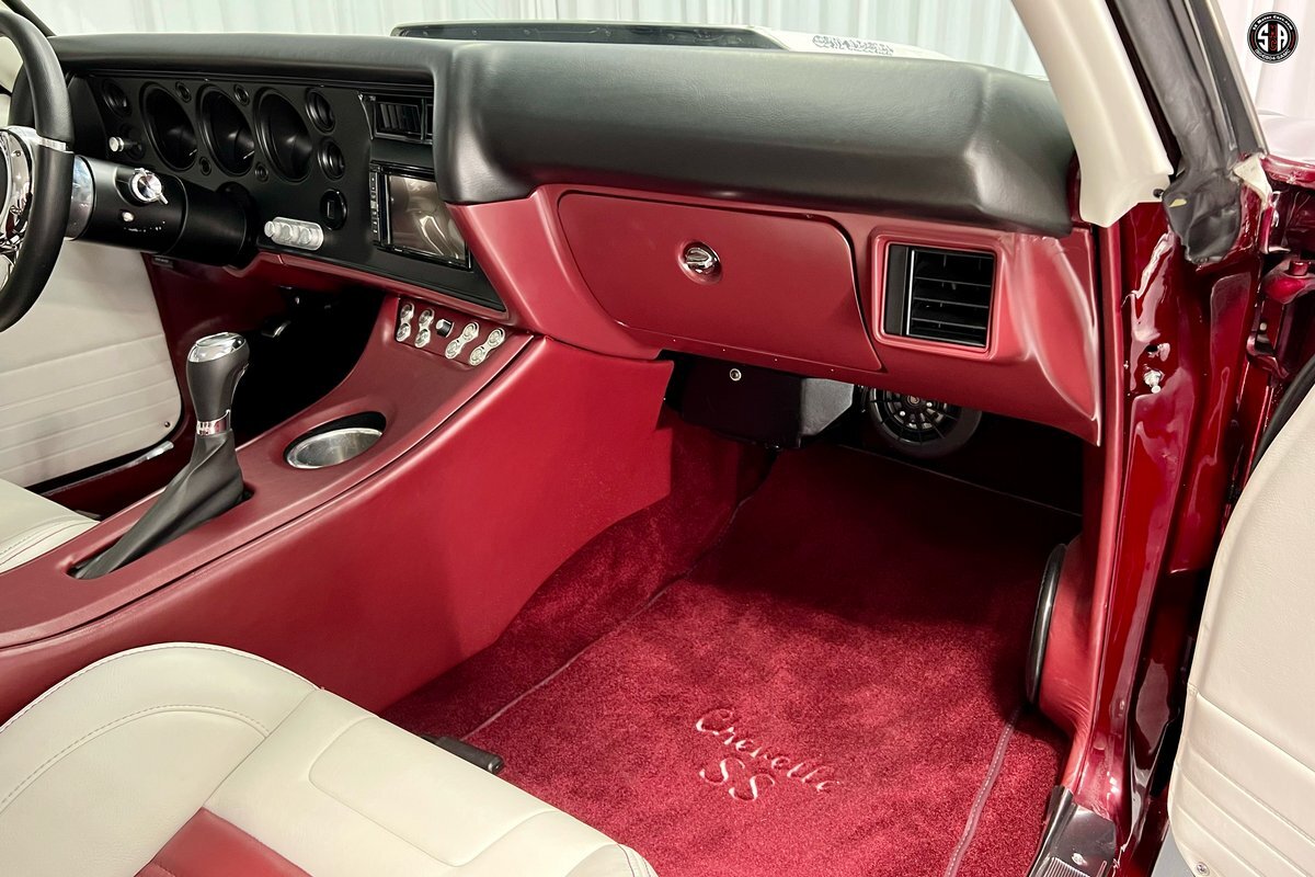 Check out this meticulous 1970 Chevrolet Chevelle Restomod! This Chevelle has undergone an extensive Frame-Off, Rotisserie Build. It has lots of custom and performance upgrades that were added during the process! Take a look at this beautifully straight body with Lowered Rocker Panels to hide visibility of the frame, Brandywine Exterior Paint with Pearl White Rally Stripes, Custom White Vinyl Top, Functional Cowl Hood with Hood Pins, 18'' Polished Aluminum American Racing Wheels with Continental Extreme Contact Tires, Aftermarket Headlights, Chrome Bumpers, Polished Trim, and Polished Exhaust Tips. The inside is sporting a Custom Interior with Burgundy and White Vinyl Upholstery, TMI Bucket Seating, Front Shoulder Belts and Rear Lap Belts, Power Windows, Flaming River Tilt Steering Column and 3-Spoke Steering wheel, Dakota Digital Dashboard Gauges, Custom Center Console, Floor Shifter with an LED Gear Indicator, Aftermarket Audio System, and a Custom Upholstered Trunk with Billet Aluminum Trunk Hinges.