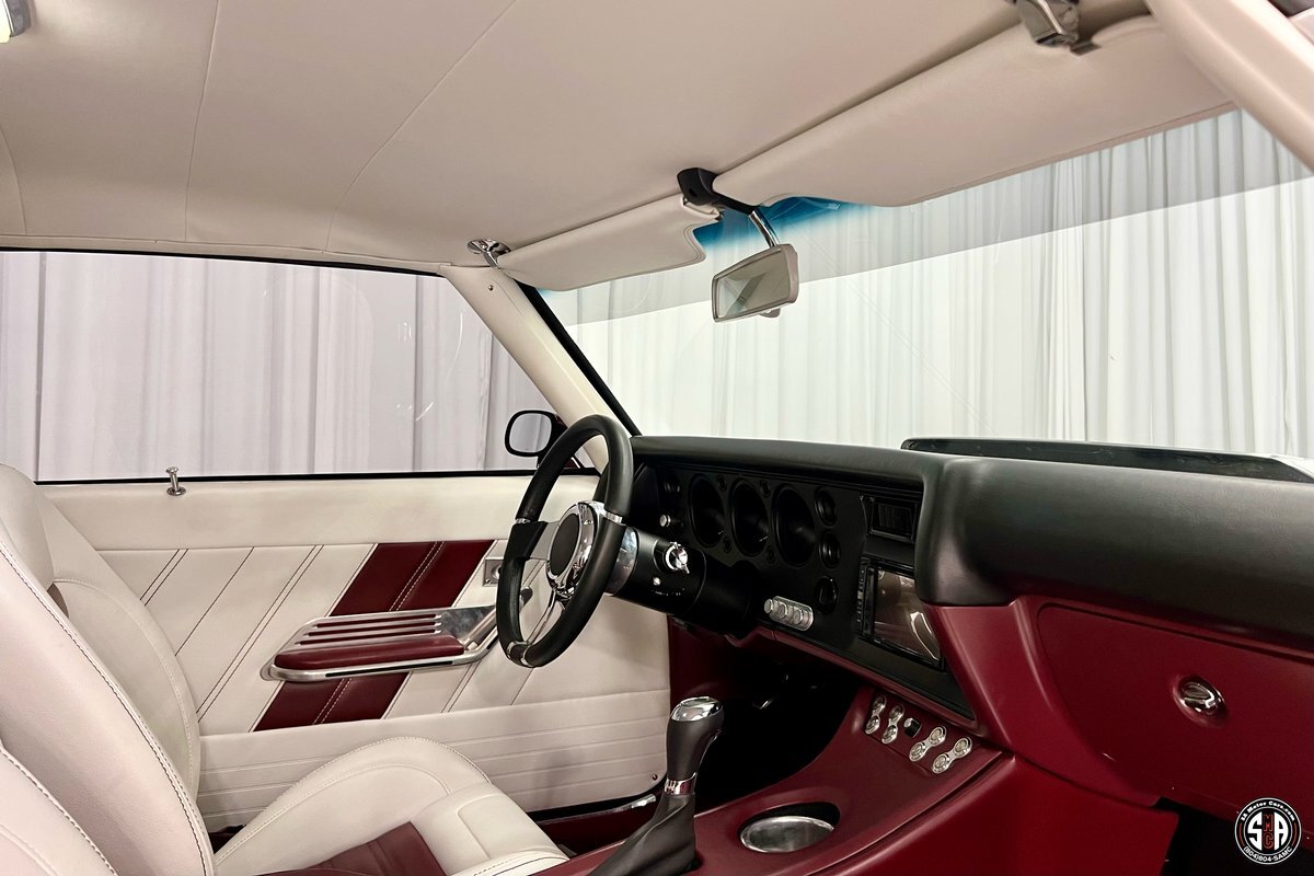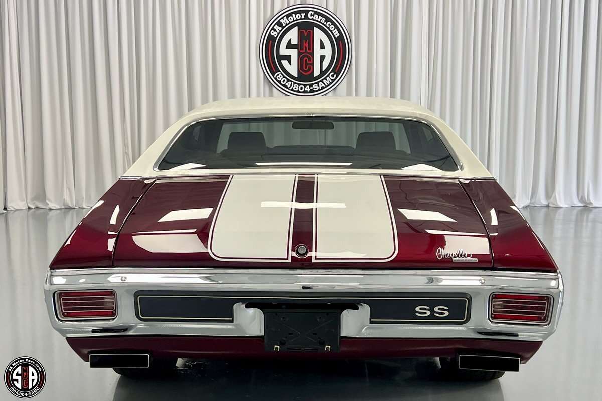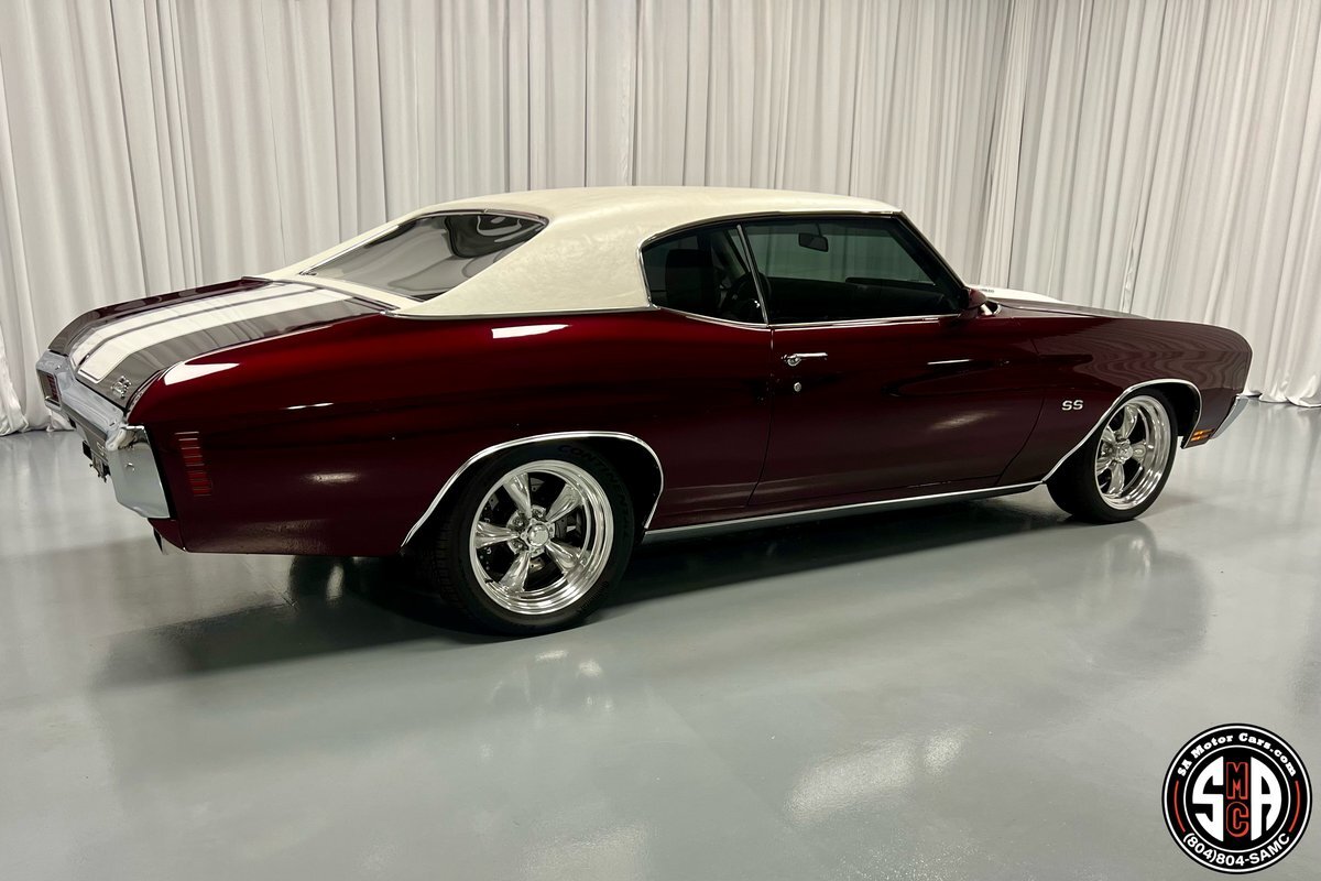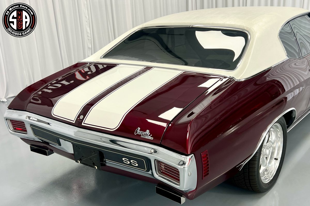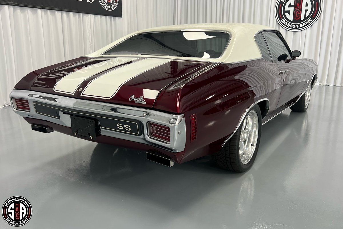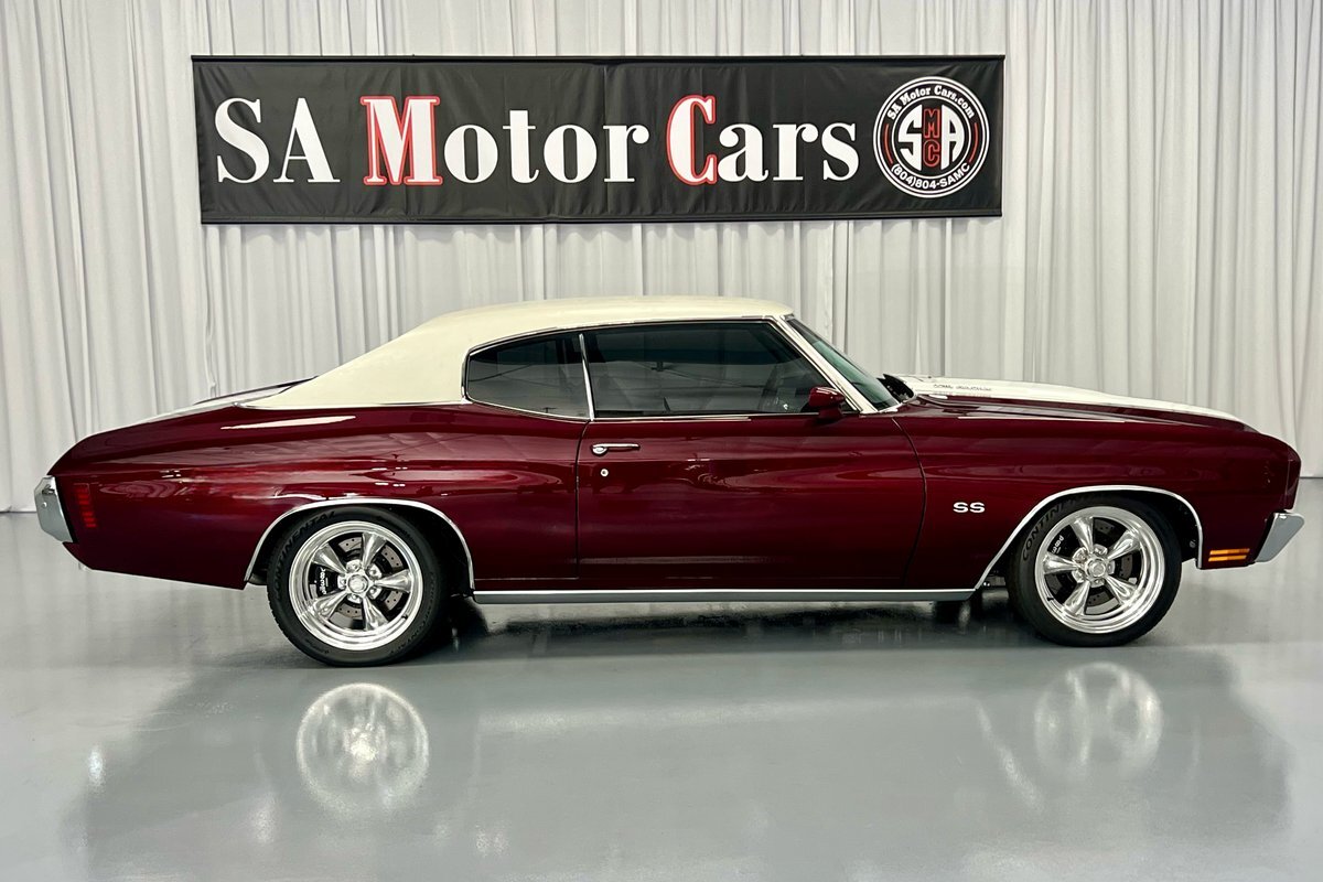 Check out this meticulous 1970 Chevrolet Chevelle Restomod! This Chevelle has undergone an extensive Frame-Off, Rotisserie Build. It has lots of custom and performance upgrades that were added during the process! Take a look at this beautifully straight body with Lowered Rocker Panels to hide visibility of the frame, Brandywine Exterior Paint with Pearl White Rally Stripes, Custom White Vinyl Top, Functional Cowl Hood with Hood Pins, 18'' Polished Aluminum American Racing Wheels with Continental Extreme Contact Tires, Aftermarket Headlights, Chrome Bumpers, Polished Trim, and Polished Exhaust Tips. The inside is sporting a Custom Interior with Burgundy and White Vinyl Upholstery, TMI Bucket Seating, Front Shoulder Belts and Rear Lap Belts, Power Windows, Flaming River Tilt Steering Column and 3-Spoke Steering wheel, Dakota Digital Dashboard Gauges, Custom Center Console, Floor Shifter with an LED Gear Indicator, Aftermarket Audio System, and a Custom Upholstered Trunk with Billet Aluminum Trunk Hinges.