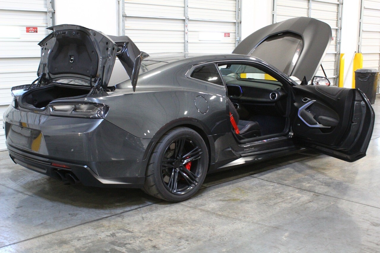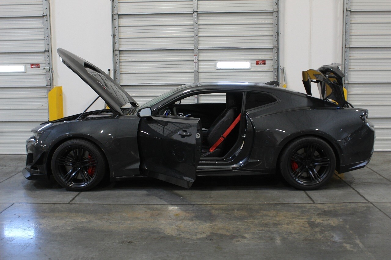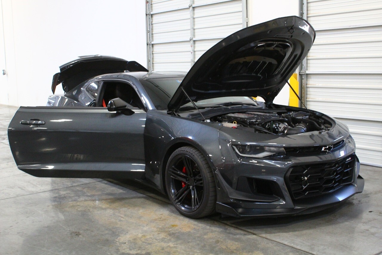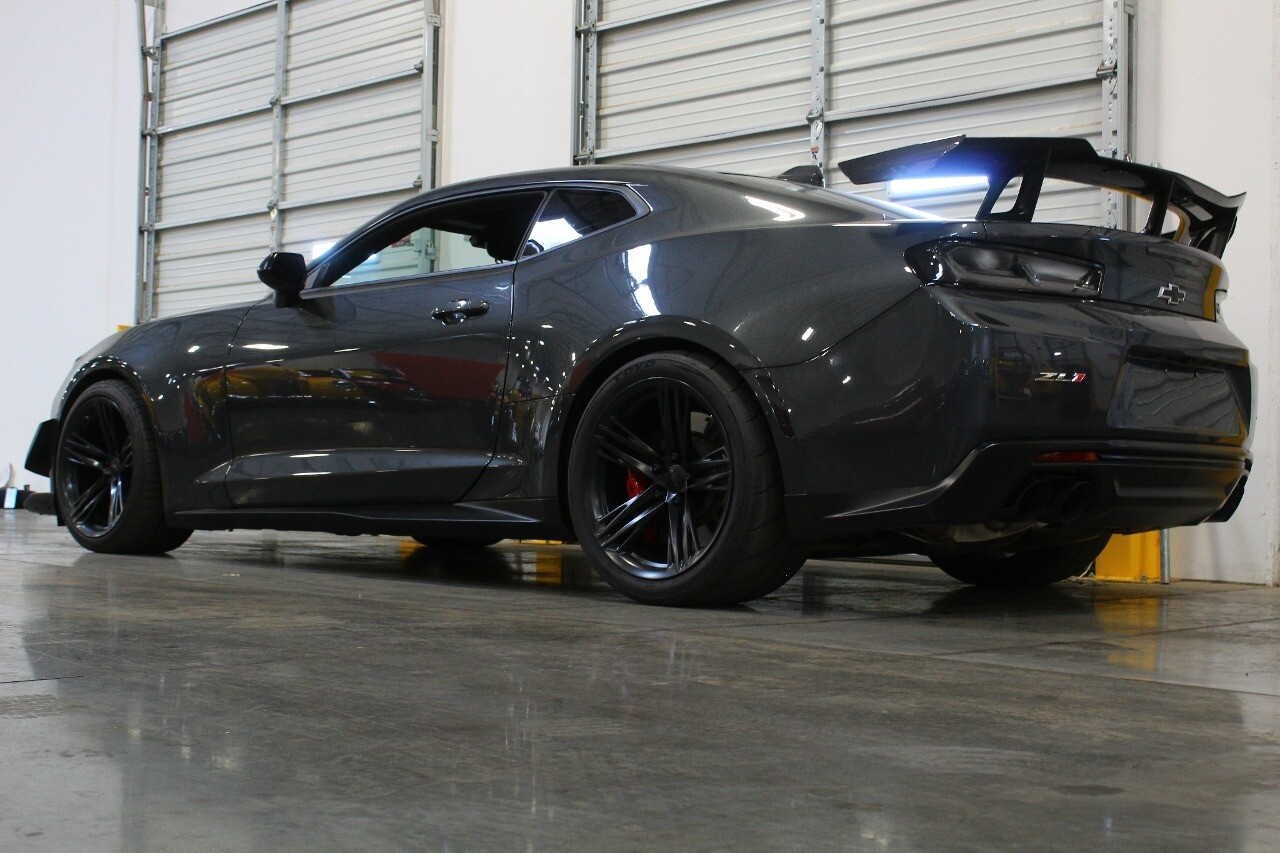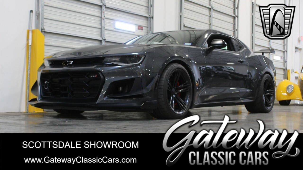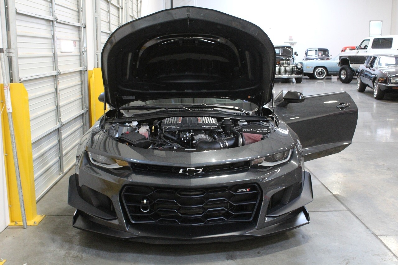 Gateway Classic Cars of Scottsdale is honored to present for sale, on consignment, this absolute beast of a 2018 Chevrolet Camaro ZL1 finished in Nightfall Gray exterior over Dark Gray interior. The current owner has supplied a Dynojet sheet revealing a peak 873hp and 742 ft lbs. of torque at 14.91 psi of boost thanks to a Magnuson Supercharger and supporting mods running E-85 fuel! This power is surprisingly manageable during standard driving, the clutch is easy, shifting is fluid and even the exhaust note is tame. A mere flick of your ankle brings this monster to life and creates a massive rush of adrenaline when you unleash that kind of power. This car has what you want, 19" forged aluminum wheels, summer tires, performance suspension, red calipers, satin black hood with carbon fiber insert, carbon fiber rear spoiler, front dive planes, front splitter, MyLink audio system w/ 8" touchscreen, LED Lighting, Recaro Seats, Red Seatbelts, 6 speed manual transmission and that beautiful 6.2L V8. Improving on a masterpiece can sometimes result in taking it too far but this car holds a delicate balance between a daily driver and a track monster. This car is well documented with aftermarket parts receipts, copy of the window sticker, dyno results and vehicle inspection sheet. A clean CarFax is available upon request. Other Features and Options include A/C, AM/FM/Bluetooth/Satellite Radio, Anti-Lock Brakes, Vented Discs, Cruise Control, Forged Wheels, Airbags, GPS, Heated Seats, Performance Tires, Power Brakes, Power Locks, Power Windows with Tint, Power Seats, Power Mirrors, Power Steering, Rear Defogger, Ride Control, Seatbelts, Tilt/Telescoping Wheel and Traction Control. I can't say enough about how cool this car is when you get behind the wheel, if an ear to ear grin is the feeling you want to have, hop behind the wheel of this car and you will not be disappointed. [ omitted ].