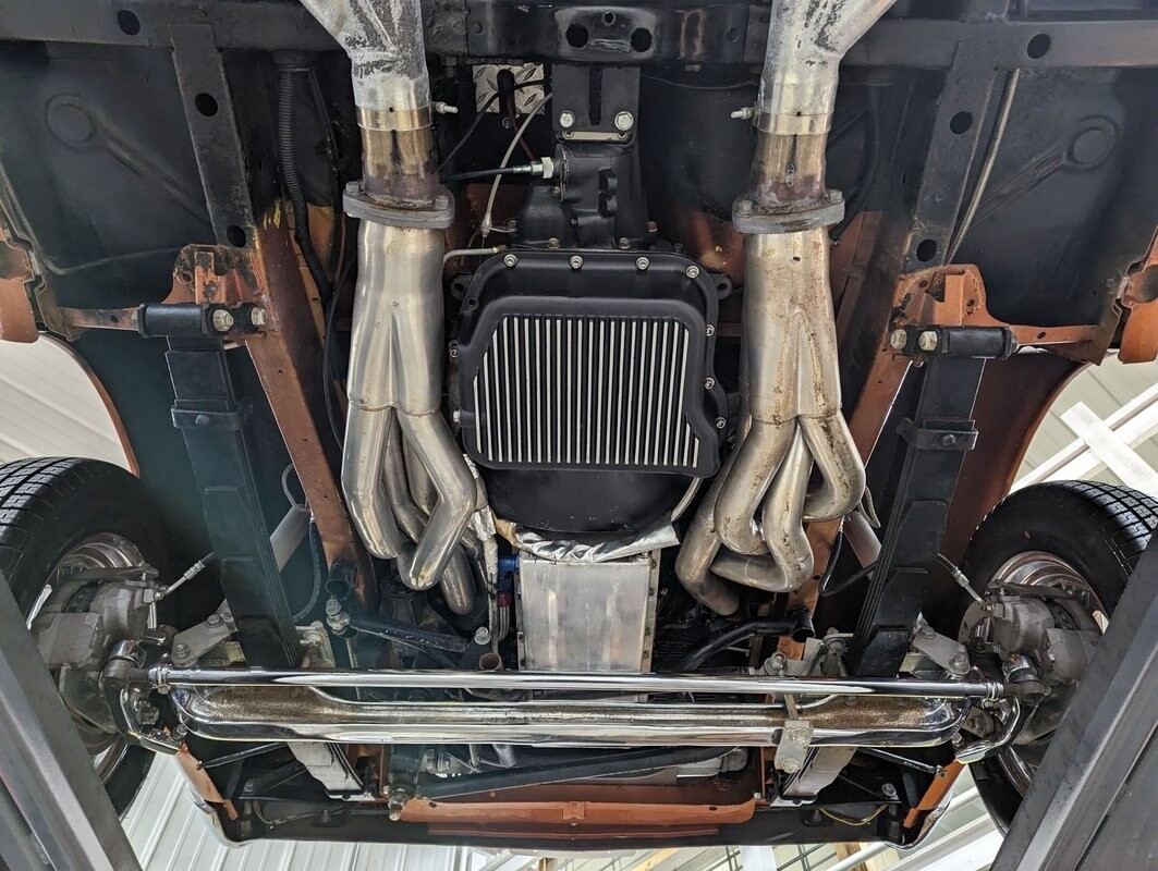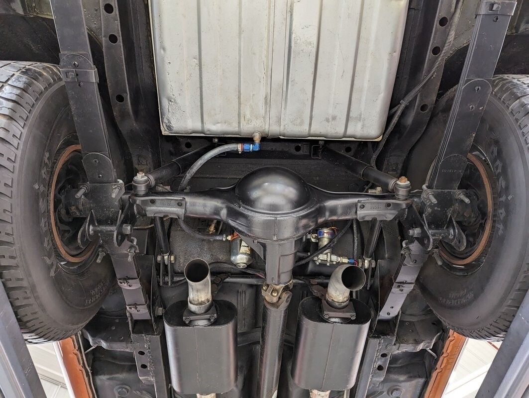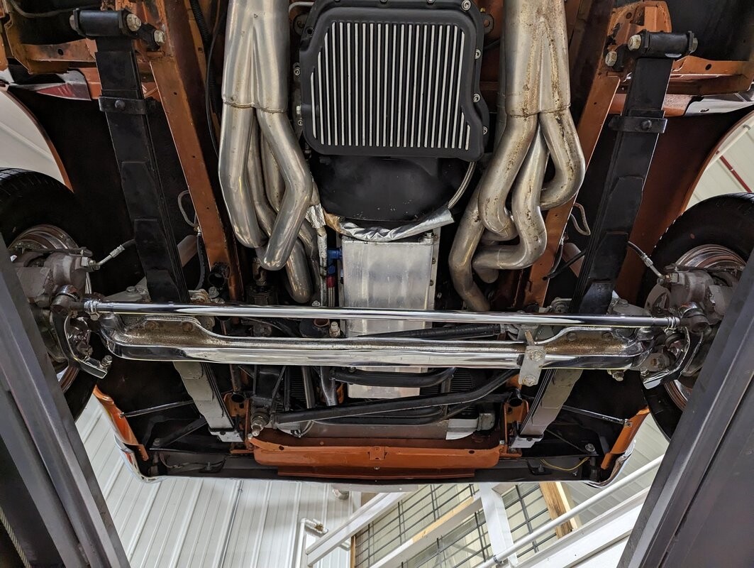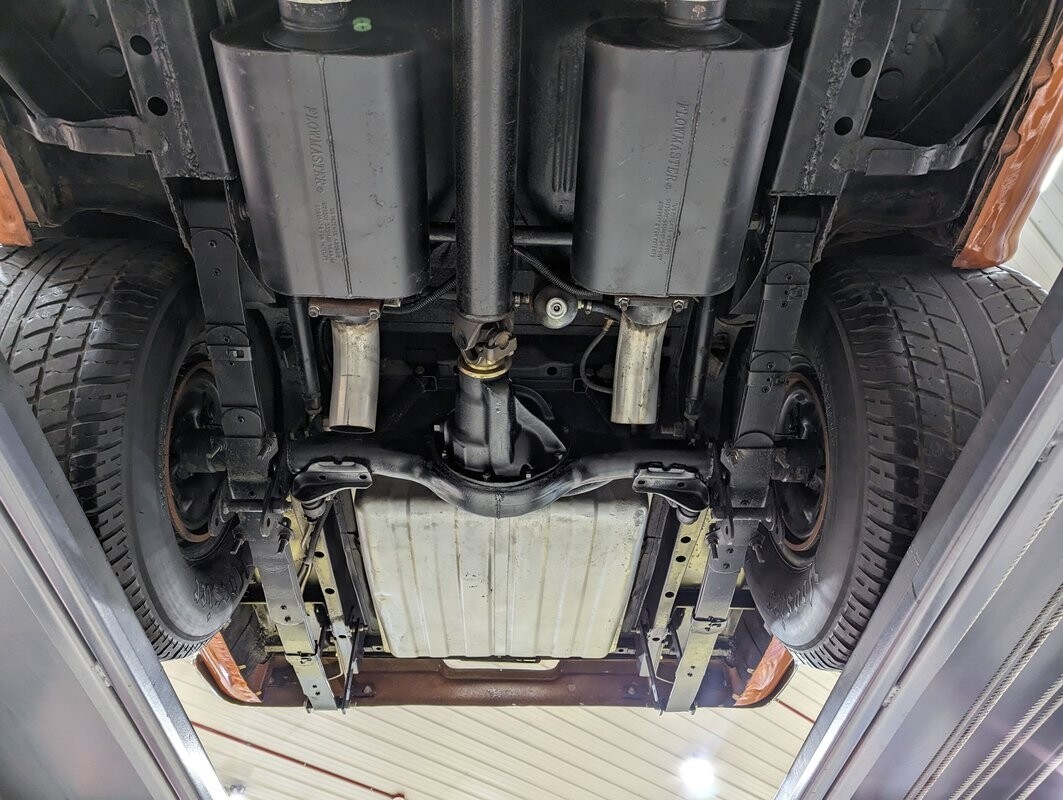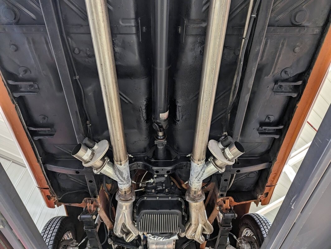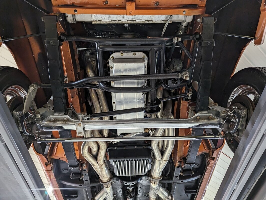 UNDERSIDE: Up front has a chromed straight axle with leaf springs. This redistributes the weight to the rear tires. It has a tubular K member, welded in frame connectors and in back the leaf springs were relocated inward for the wide tires. All the suspension and steering has been rebuilt. TTI exhaust with X-pipe, electric dumps and Flowmaster mufflers. The fuel tank was replaced, it has an electric fuel pump. The brakes were rebuilt and upgraded with disc in front inside the trunk is rock solid It's all painted the same copper color has the two-piece trunk mat batteries relocated to the trunk and has a disconnect. 8 quart aluminum oil pan on the motor. Level 4 GearStar 727 Torqueflite automatic with 3400 stall and finned aluminum pan. Custom built and balanced drive shaft. Performance built 8 3/4 rear end with Auburn 3.91 Sure Grip gears. The floors appear to be very dry; it is a California car.