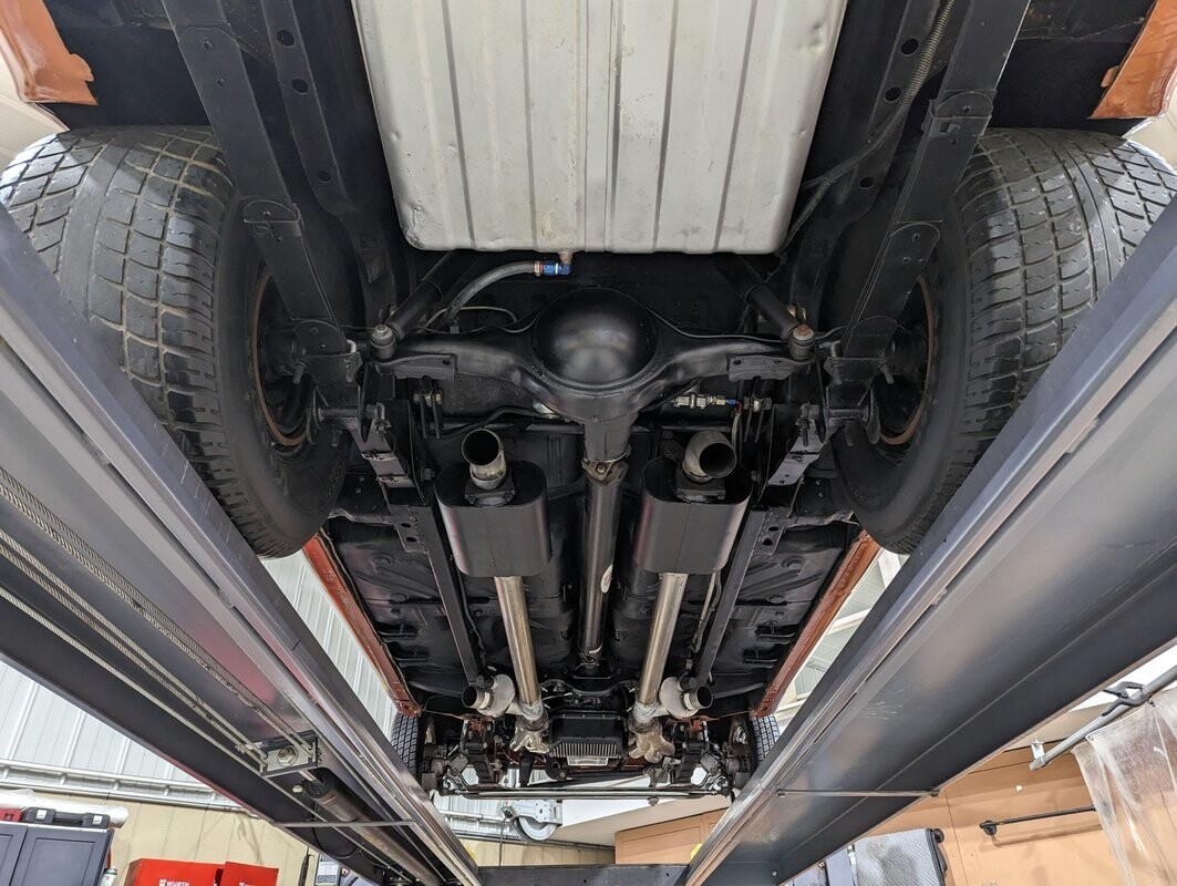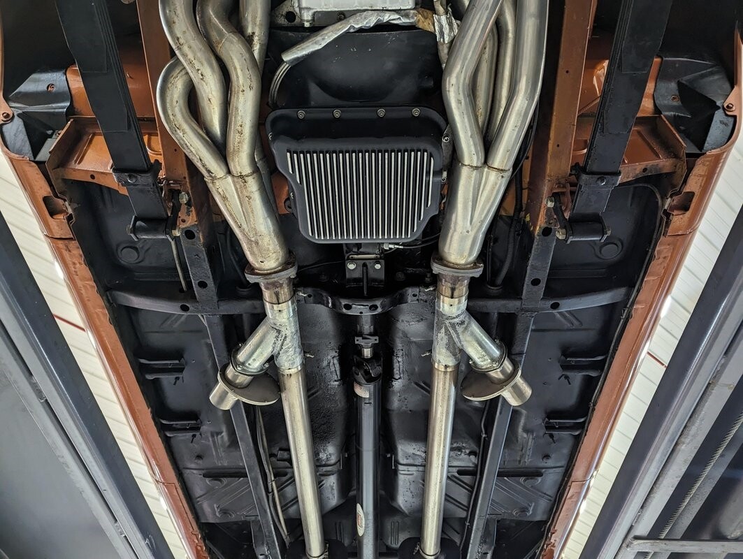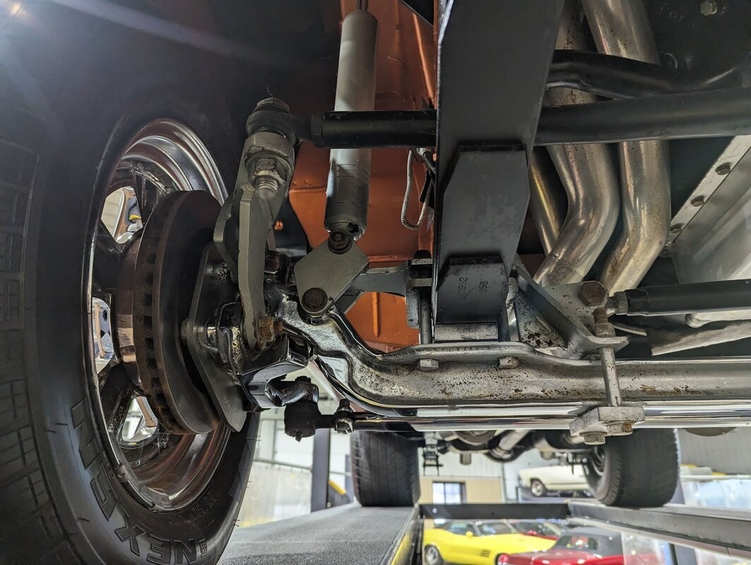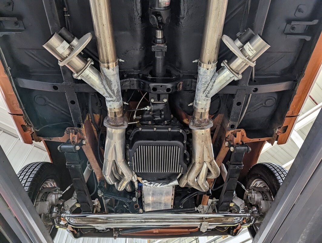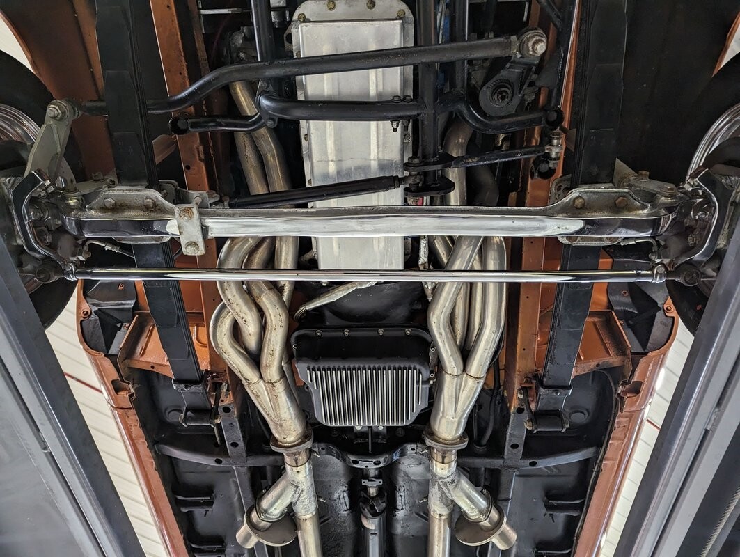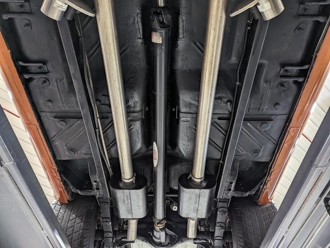 UNDERSIDE: Up front has a chromed straight axle with leaf springs. This redistributes the weight to the rear tires. It has a tubular K member, welded in frame connectors and in back the leaf springs were relocated inward for the wide tires. All the suspension and steering has been rebuilt. TTI exhaust with X-pipe, electric dumps and Flowmaster mufflers. The fuel tank was replaced, it has an electric fuel pump. The brakes were rebuilt and upgraded with disc in front inside the trunk is rock solid It's all painted the same copper color has the two-piece trunk mat batteries relocated to the trunk and has a disconnect. 8 quart aluminum oil pan on the motor. Level 4 GearStar 727 Torqueflite automatic with 3400 stall and finned aluminum pan. Custom built and balanced drive shaft. Performance built 8 3/4 rear end with Auburn 3.91 Sure Grip gears. The floors appear to be very dry; it is a California car.