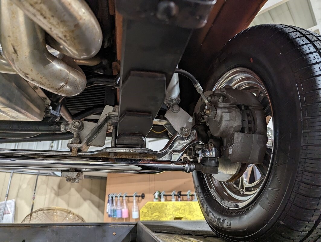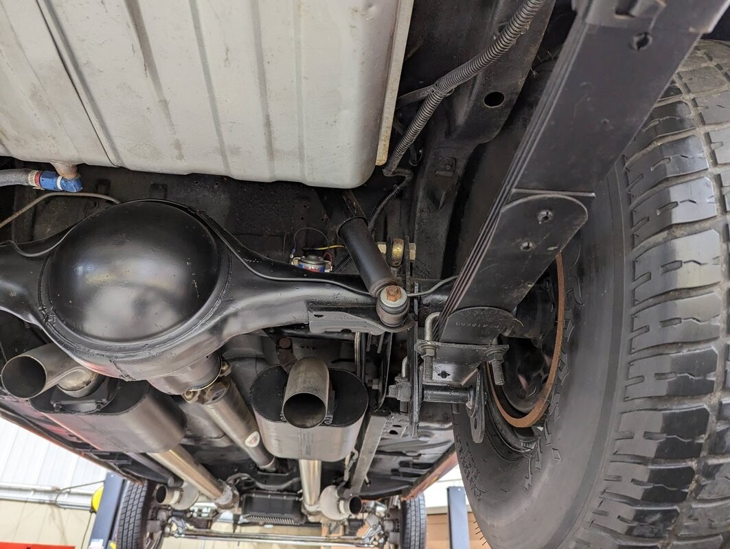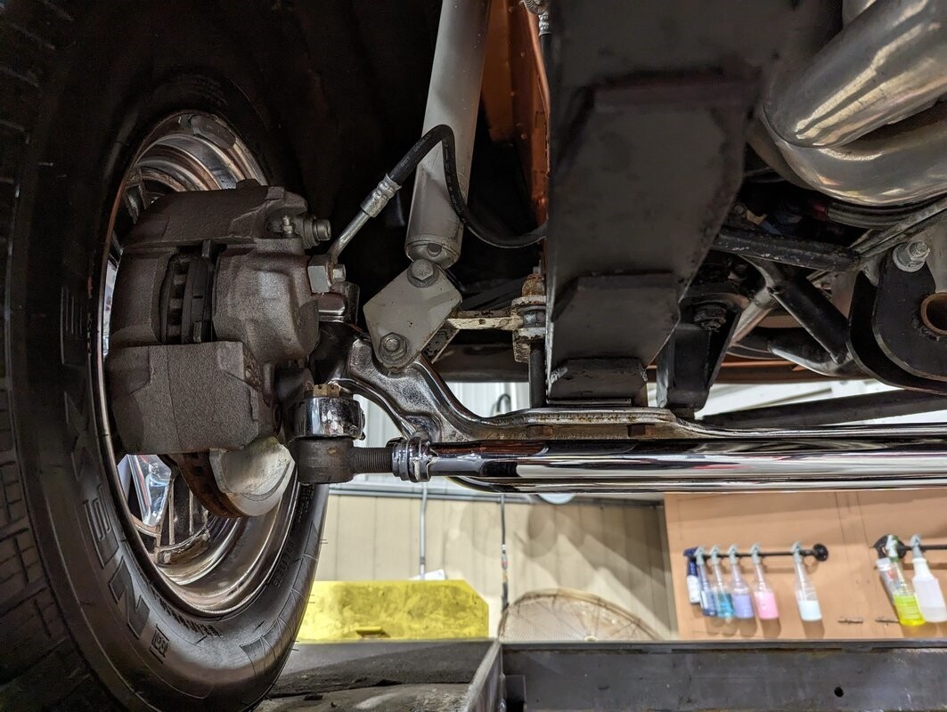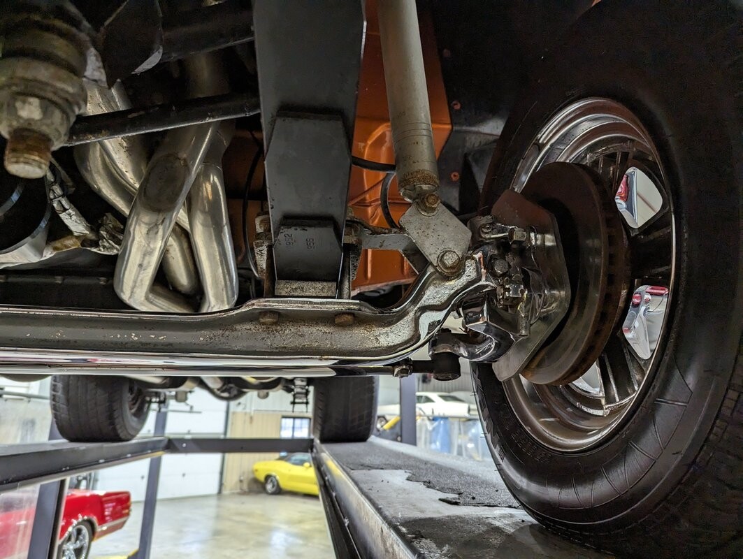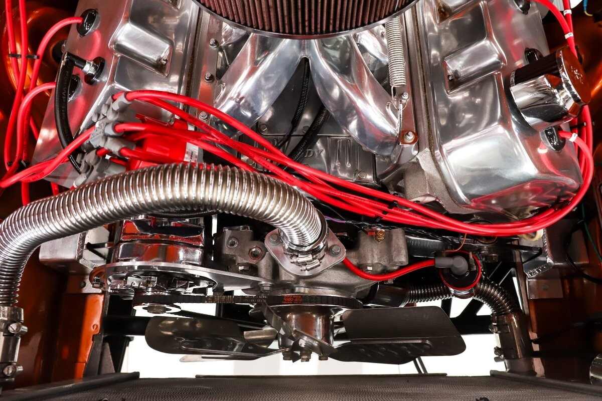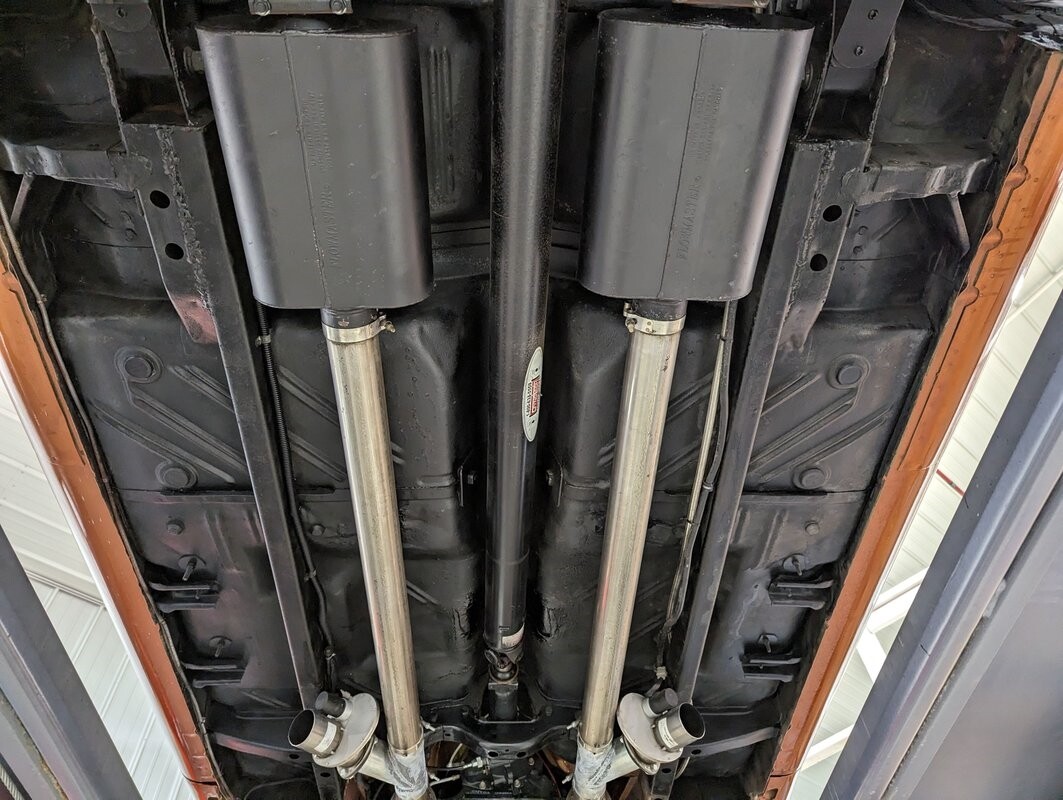 UNDERSIDE: Up front has a chromed straight axle with leaf springs. This redistributes the weight to the rear tires. It has a tubular K member, welded in frame connectors and in back the leaf springs were relocated inward for the wide tires. All the suspension and steering has been rebuilt. TTI exhaust with X-pipe, electric dumps and Flowmaster mufflers. The fuel tank was replaced, it has an electric fuel pump. The brakes were rebuilt and upgraded with disc in front inside the trunk is rock solid It's all painted the same copper color has the two-piece trunk mat batteries relocated to the trunk and has a disconnect. 8 quart aluminum oil pan on the motor. Level 4 GearStar 727 Torqueflite automatic with 3400 stall and finned aluminum pan. Custom built and balanced drive shaft. Performance built 8 3/4 rear end with Auburn 3.91 Sure Grip gears. The floors appear to be very dry; it is a California car.