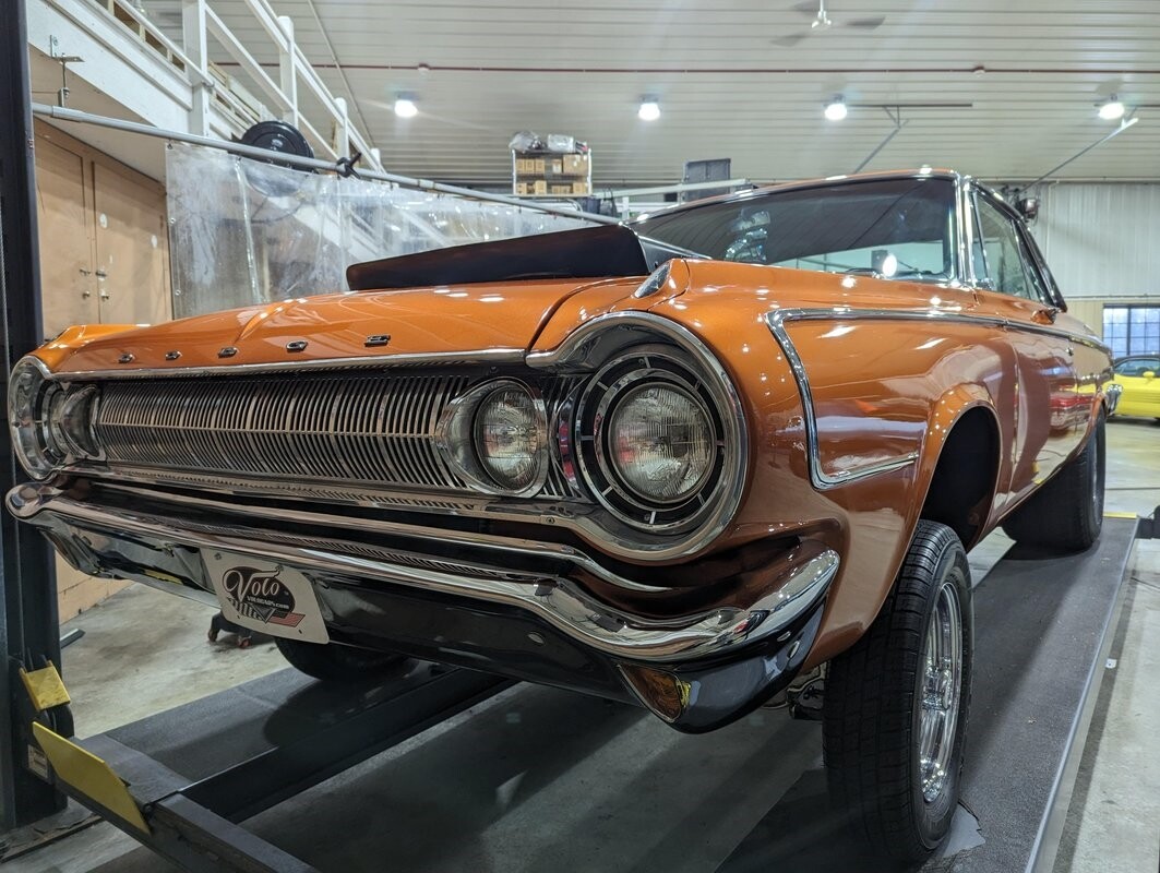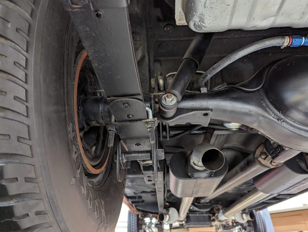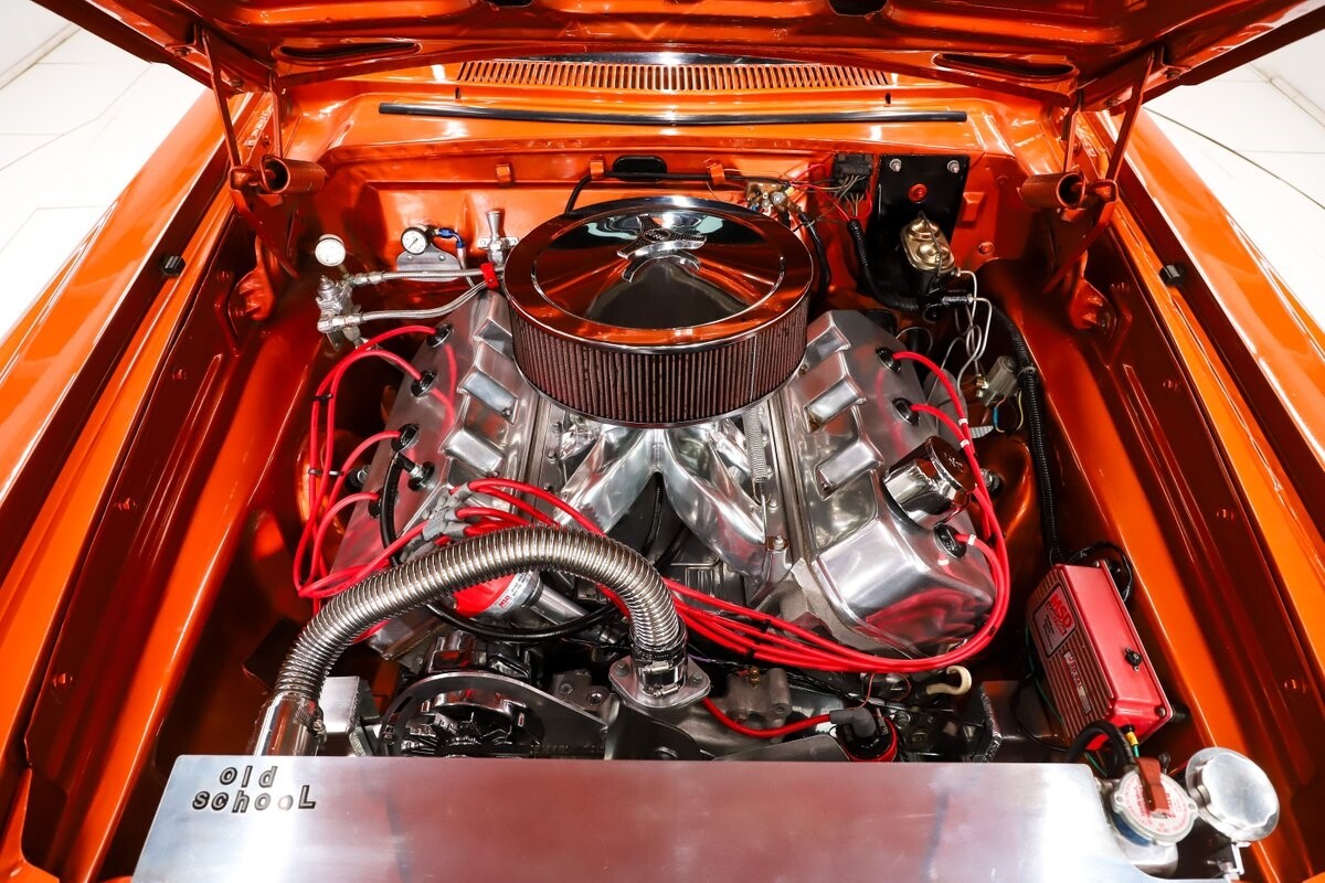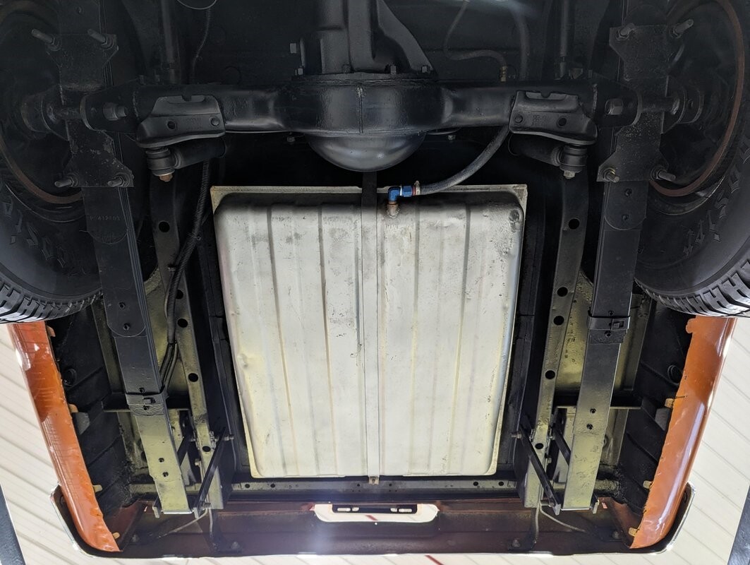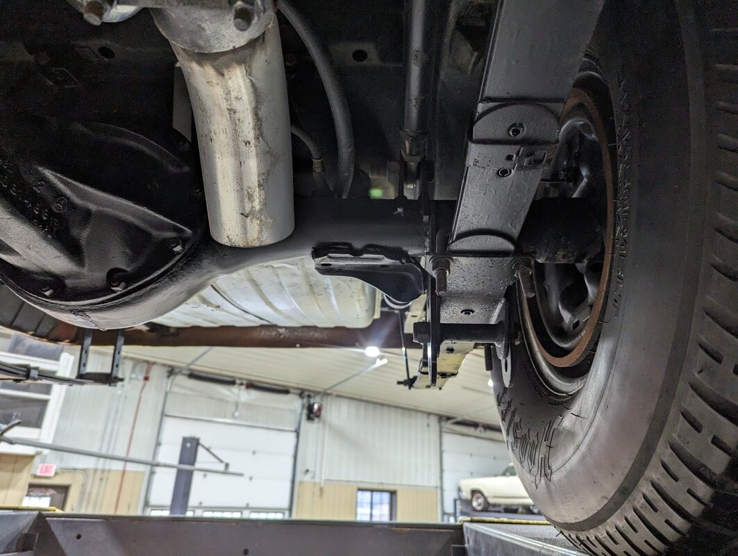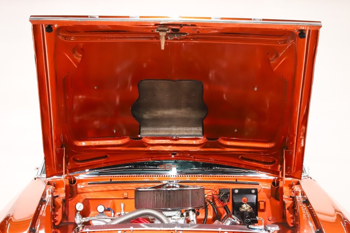 UNDERSIDE: Up front has a chromed straight axle with leaf springs. This redistributes the weight to the rear tires. It has a tubular K member, welded in frame connectors and in back the leaf springs were relocated inward for the wide tires. All the suspension and steering has been rebuilt. TTI exhaust with X-pipe, electric dumps and Flowmaster mufflers. The fuel tank was replaced, it has an electric fuel pump. The brakes were rebuilt and upgraded with disc in front inside the trunk is rock solid It's all painted the same copper color has the two-piece trunk mat batteries relocated to the trunk and has a disconnect. 8 quart aluminum oil pan on the motor. Level 4 GearStar 727 Torqueflite automatic with 3400 stall and finned aluminum pan. Custom built and balanced drive shaft. Performance built 8 3/4 rear end with Auburn 3.91 Sure Grip gears. The floors appear to be very dry; it is a California car.