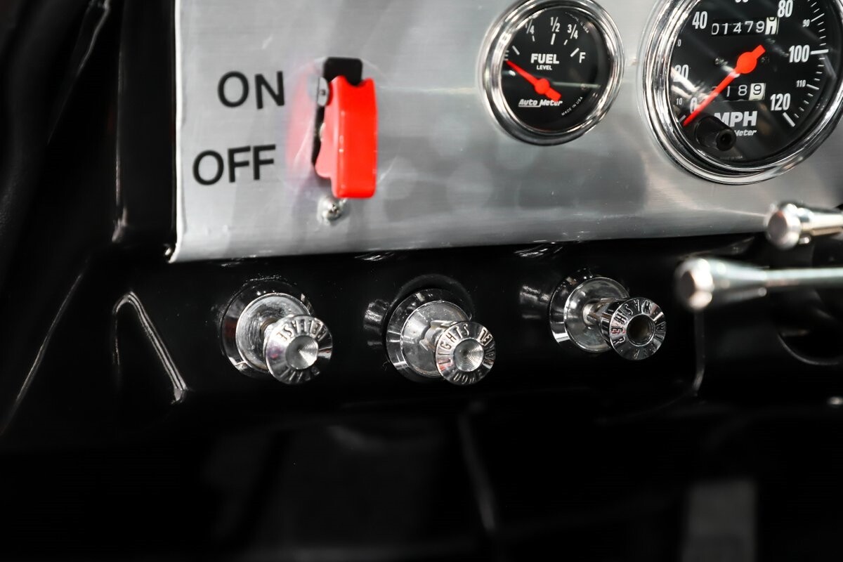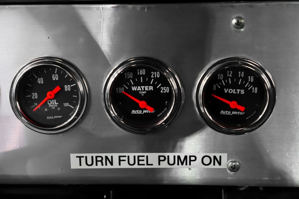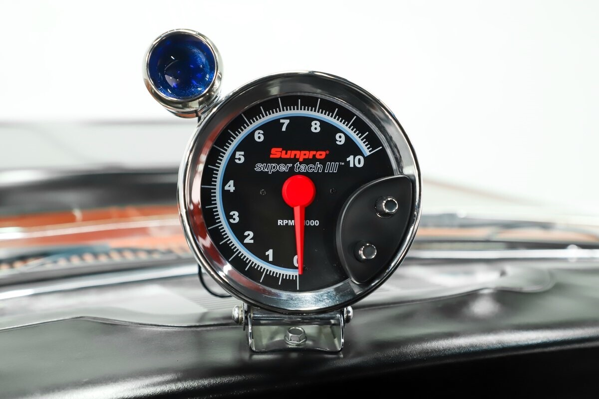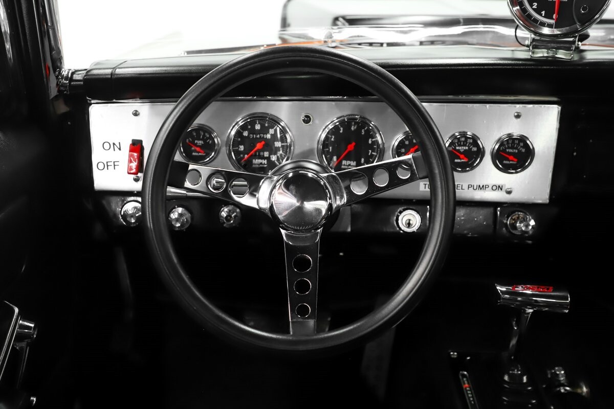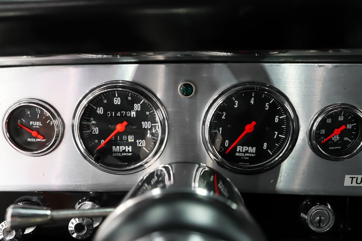 INTERIOR: It's a very well restored interior. Recushioned and upholstered seats. It looks like 4 bucket seats, in front it has a fold down armrest cushion. Reproduction door panels. It has a B&M ratchet shifter on the floor. In front of you is a custom instrument panel with a matched set of gauges. The giant tachometer is mounted on the dash. The tilt column has a vintage style cushion grip wheel. Racing style seat belts.