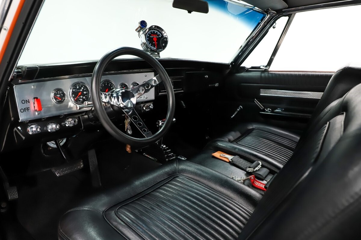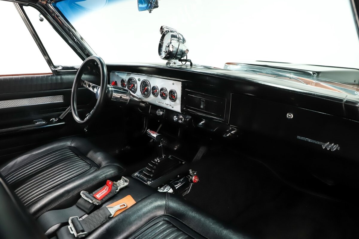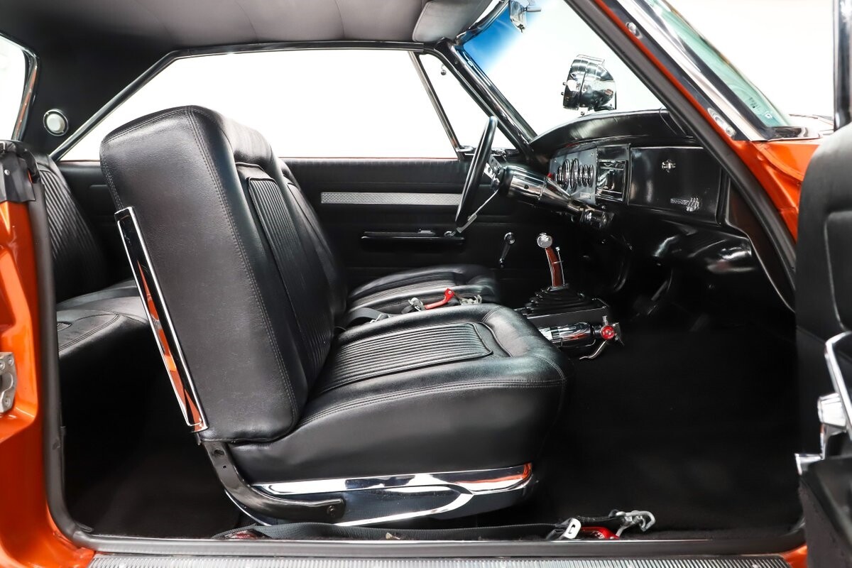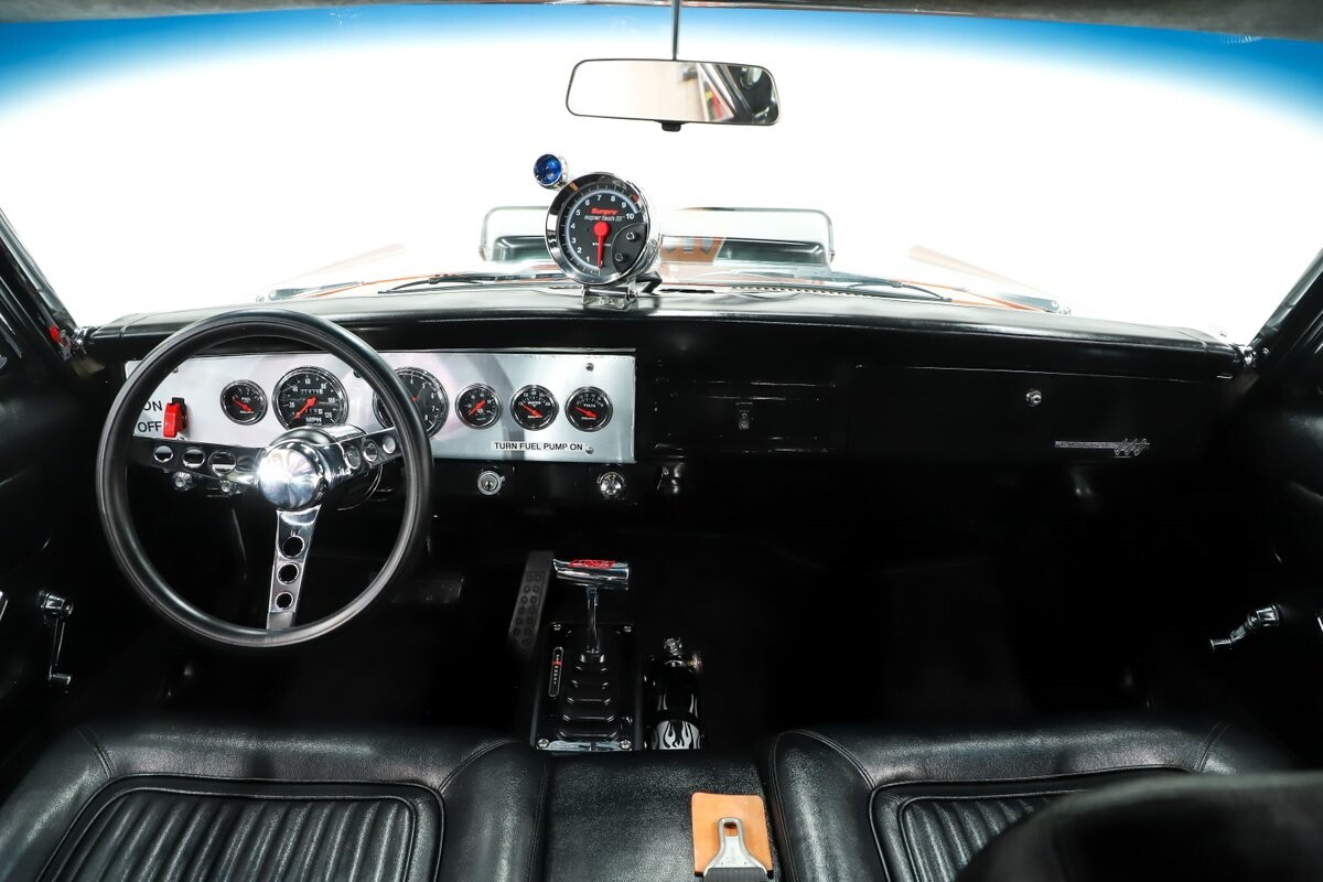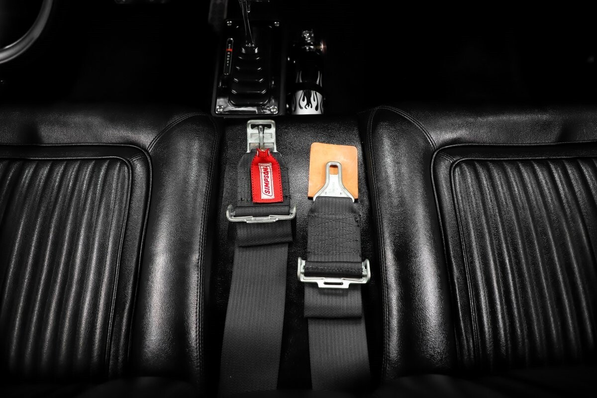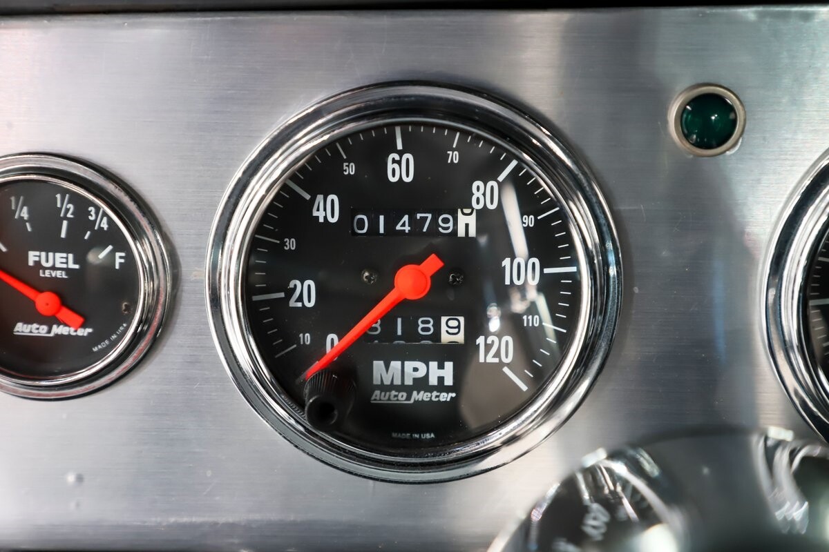 INTERIOR: It's a very well restored interior. Recushioned and upholstered seats. It looks like 4 bucket seats, in front it has a fold down armrest cushion. Reproduction door panels. It has a B&M ratchet shifter on the floor. In front of you is a custom instrument panel with a matched set of gauges. The giant tachometer is mounted on the dash. The tilt column has a vintage style cushion grip wheel. Racing style seat belts.