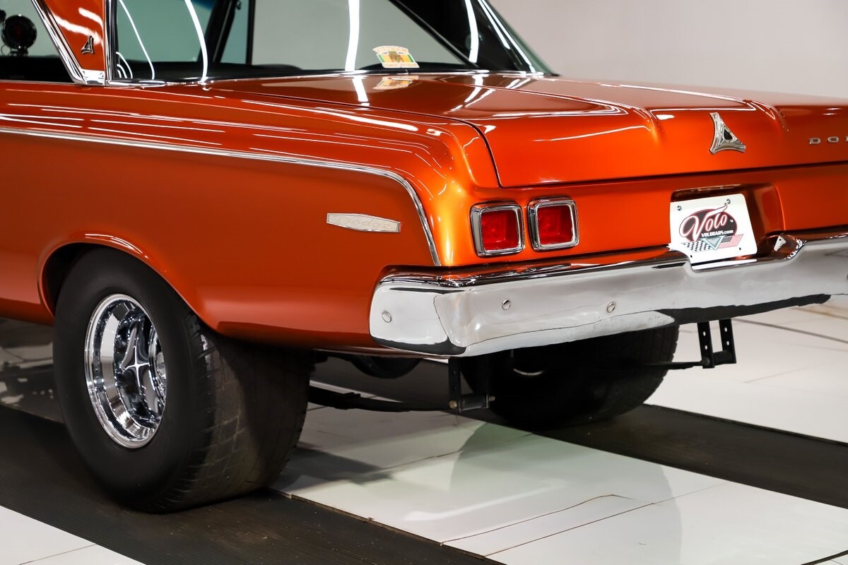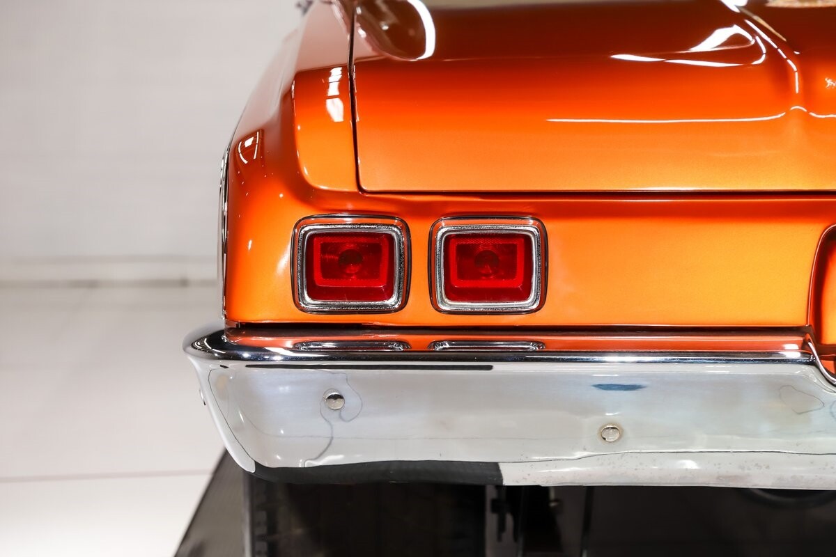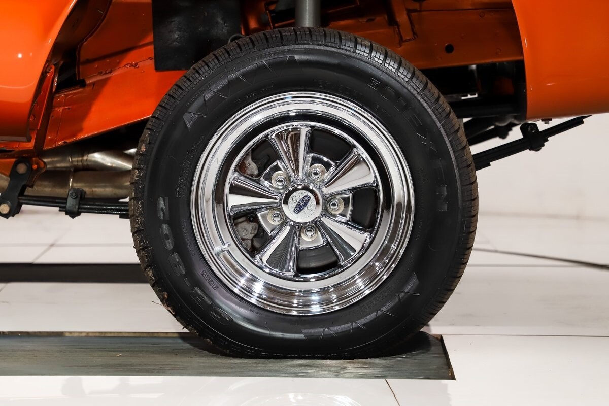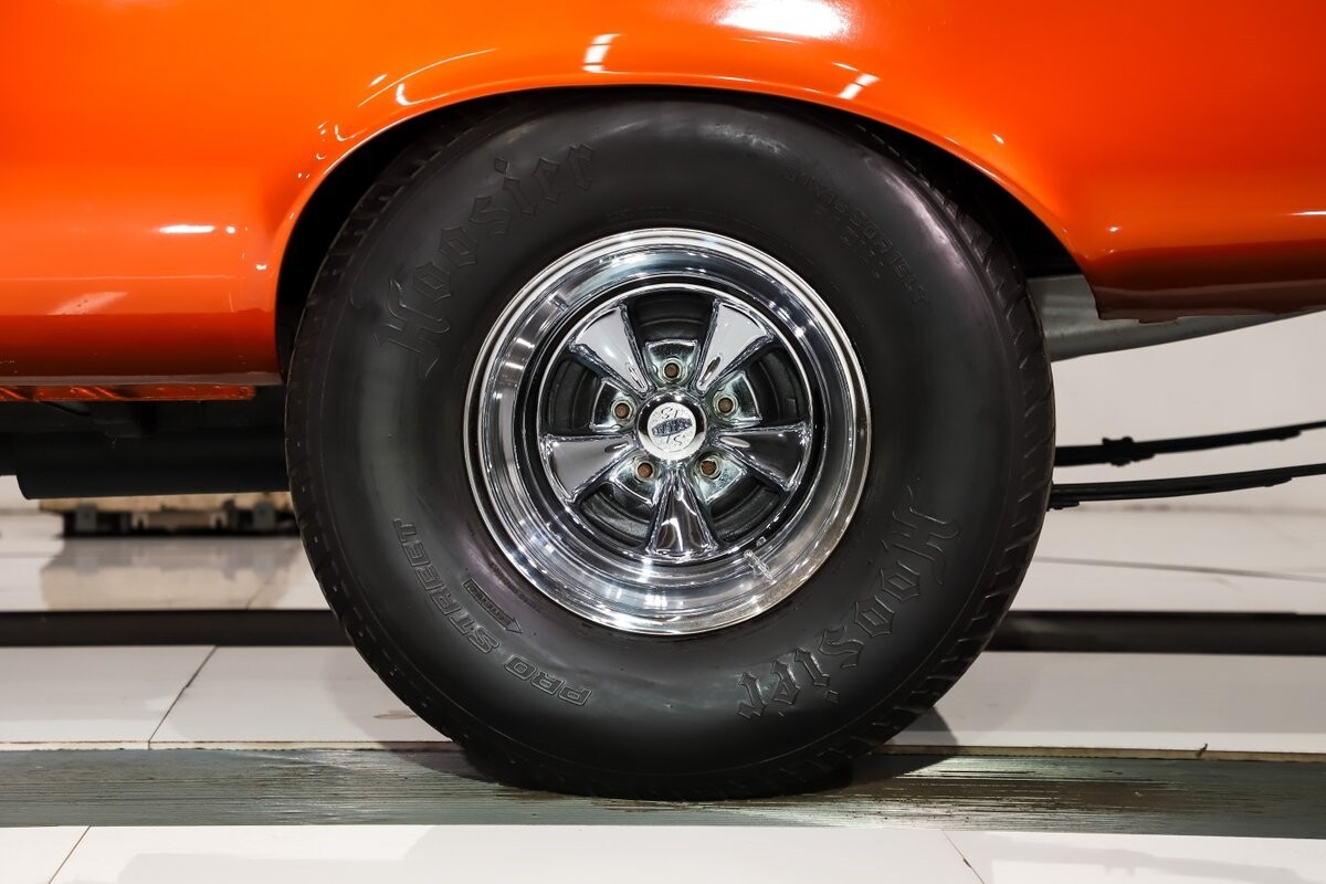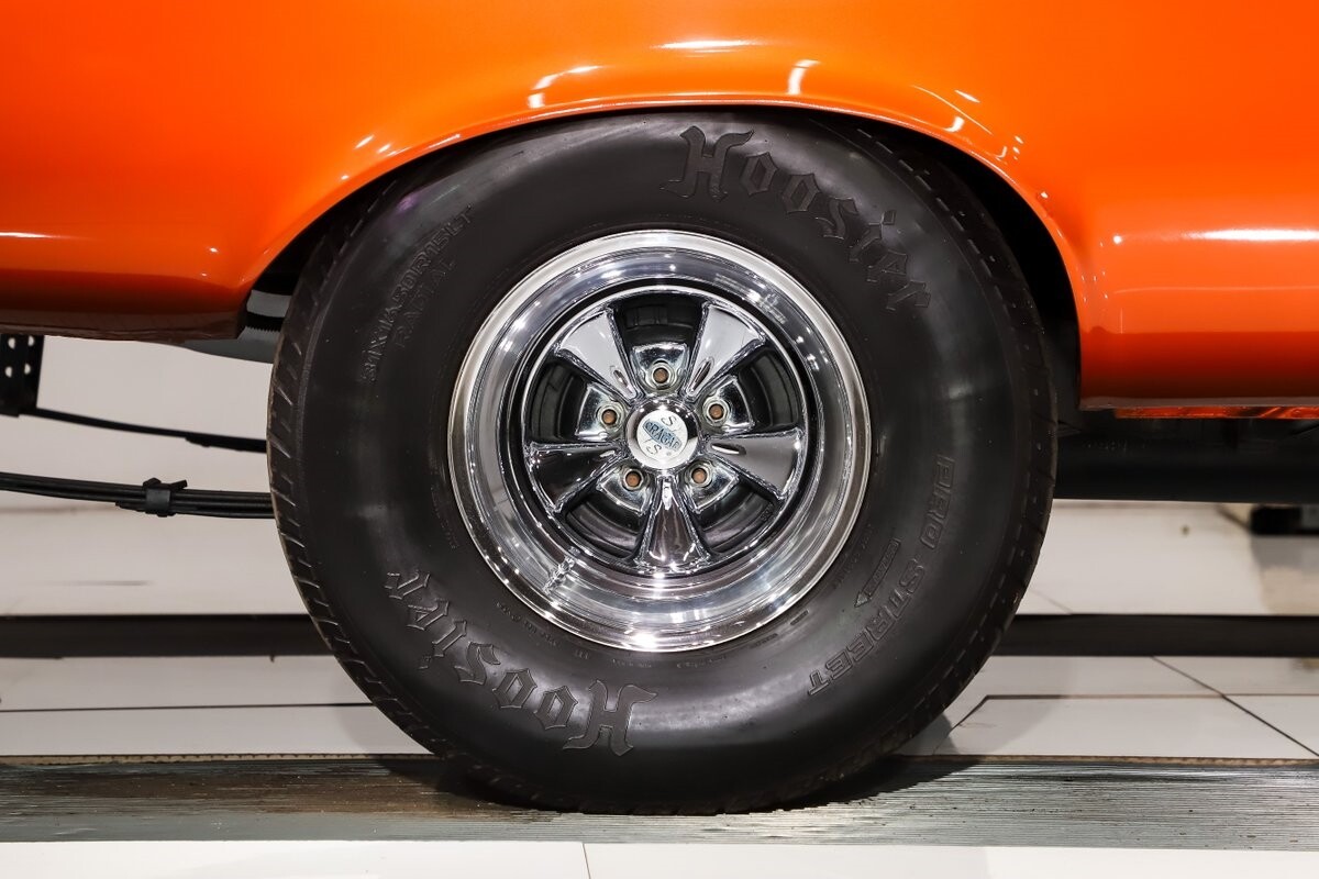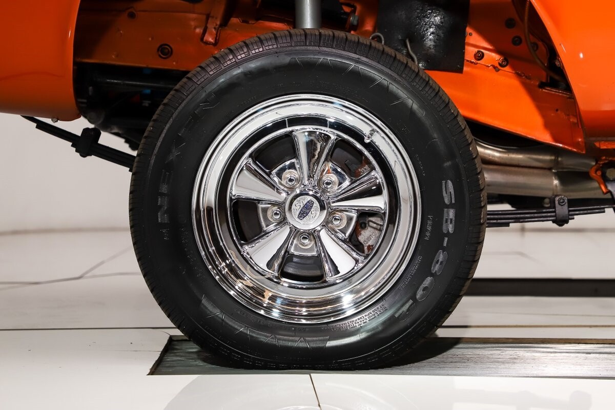 EXTERIOR: Classic gasser look with the jacked up front end and monster size tires in back. California rust free body was taken down to a bare shell, we have pictures. It is straight, clean and fits nice. The Super Stock hood scoop was added to cover the carb sticking through the hood. Beautiful Hot Hues Blazing Copper. The chrome and trim sparkles. The glass was all replaced. It's sitting on some chrome Crager wheels: skinnies in front and extra wide in back. They're wearing Hoosier Pro Street tires.